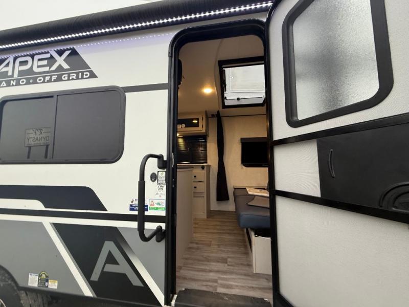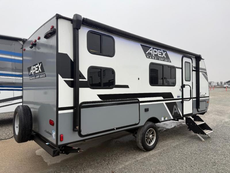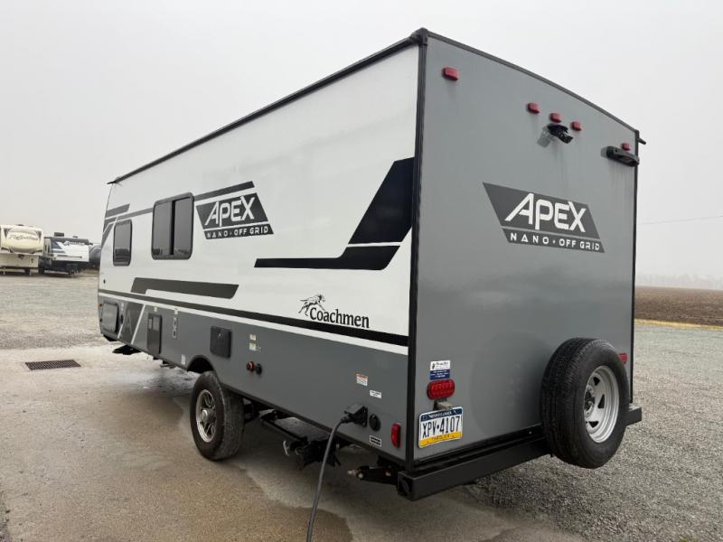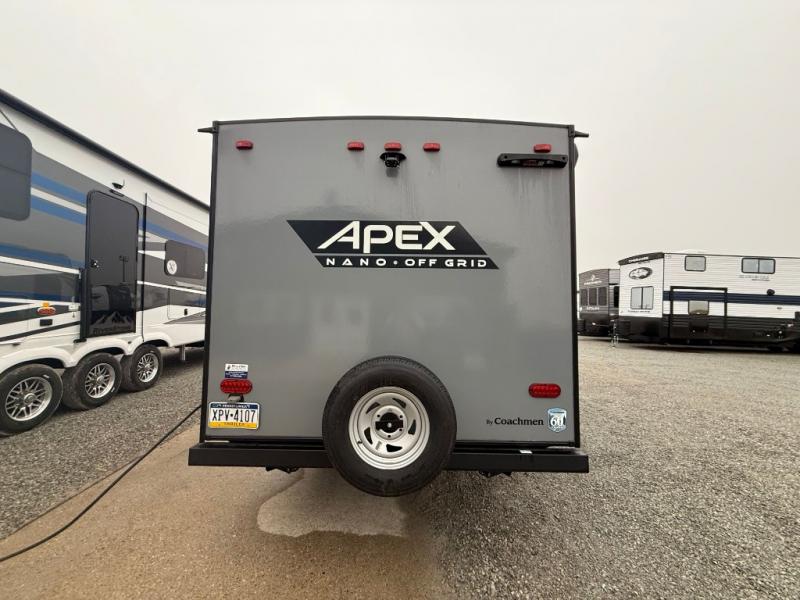 You will find comfort, convenience, and a sturdy construction with each of these Coachmen RV Apex Nano travel trailers! They are held together with an aluma-cage construction, an I-beam chassis, plus vacuum-bonded laminated dual Azdel fiberglass walls for double the protection against the elements. The 200-watt solar panel with a 30 amp control charger is included within the Off-Grid Package, along with two 20 lb. LP tanks, a high velocity power roof vent, plus 12V outlets to keep you powered up. More exterior feature include a hot/cold shower, four stabilizer jacks, a power awning with LED lighting, and magnetic baggage door catches to easily pack and unload your gear. You will love the interior of your Apex Nano with Shaw residential flooring, one-piece seamless edge countertops, matte black hardware in the galley, and a hand-crafted wood medicine cabinet in the bath.