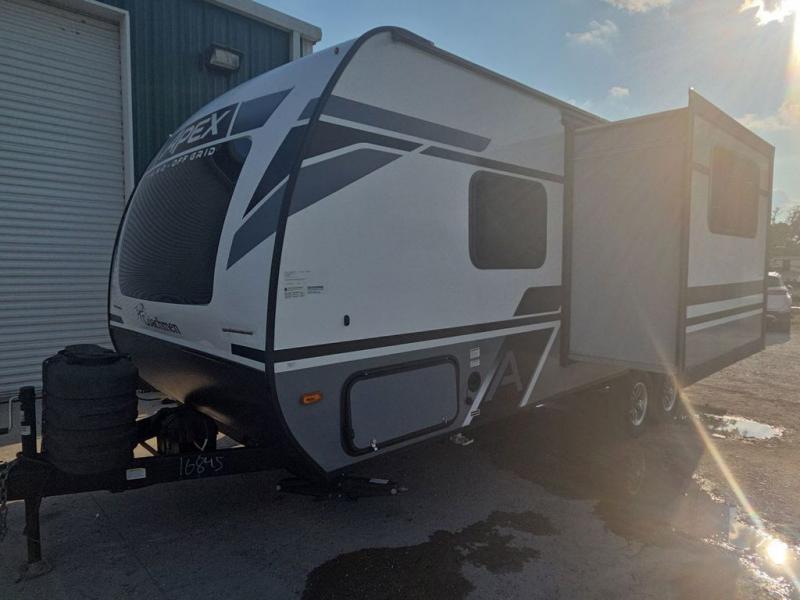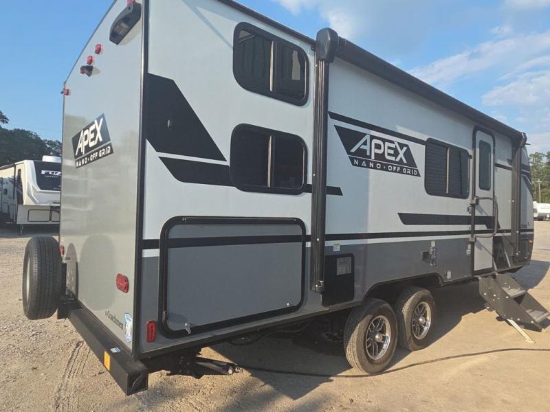 You will find comfort, convenience, and a sturdy construction with each of these Coachmen RV Apex Nano travel trailers! They are held together with an aluma-cage construction, an I-beam chassis, plus vacuum-bonded laminated dual Azdel fiberglass walls for double the protection against the elements. The 200-watt solar panel with a 30 amp control charger is included within the Off-Grid Package, along with two 20 lb. LP tanks, a high velocity power roof vent, plus 12V outlets to keep you powered up. More exterior feature include a hot/cold shower, four stabilizer jacks, a power awning with LED lighting, and magnetic baggage door catches to easily pack and unload your gear. You will love the interior of your Apex Nano with Shaw residential flooring, one-piece seamless edge countertops, matte black hardware in the galley, and a hand-crafted wood medicine cabinet in the bath.