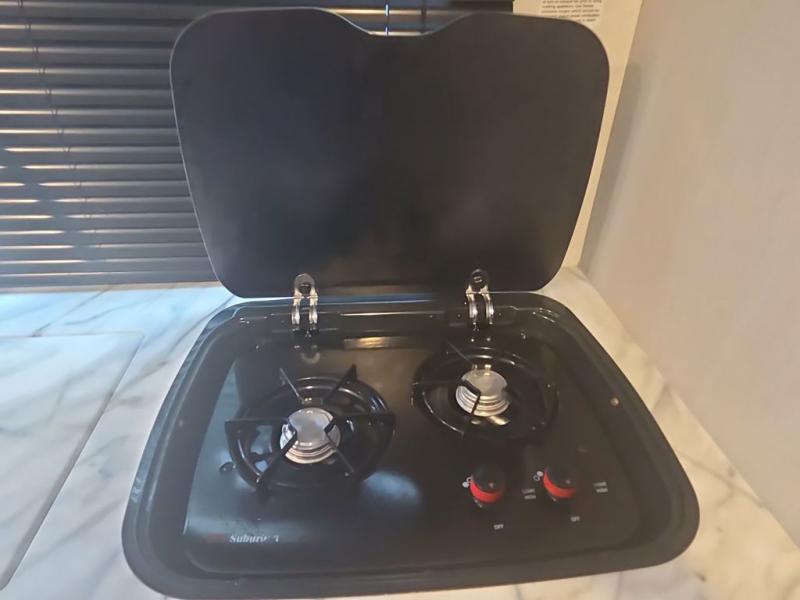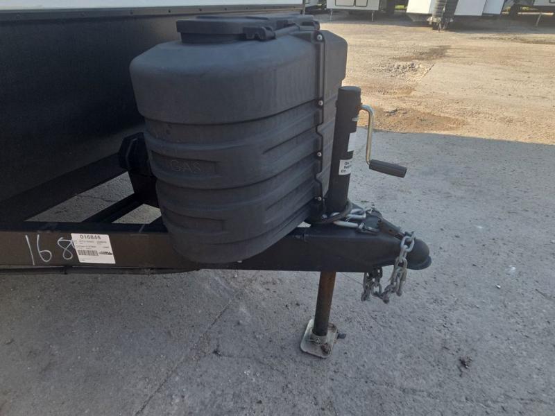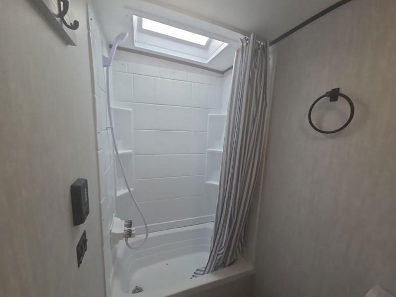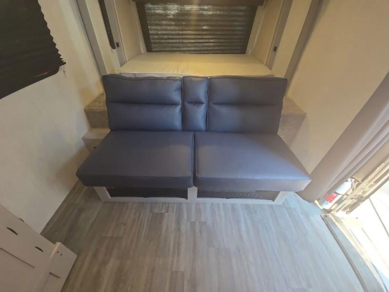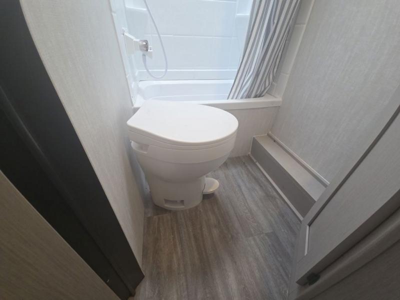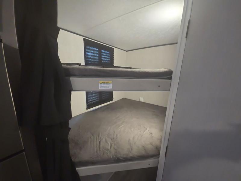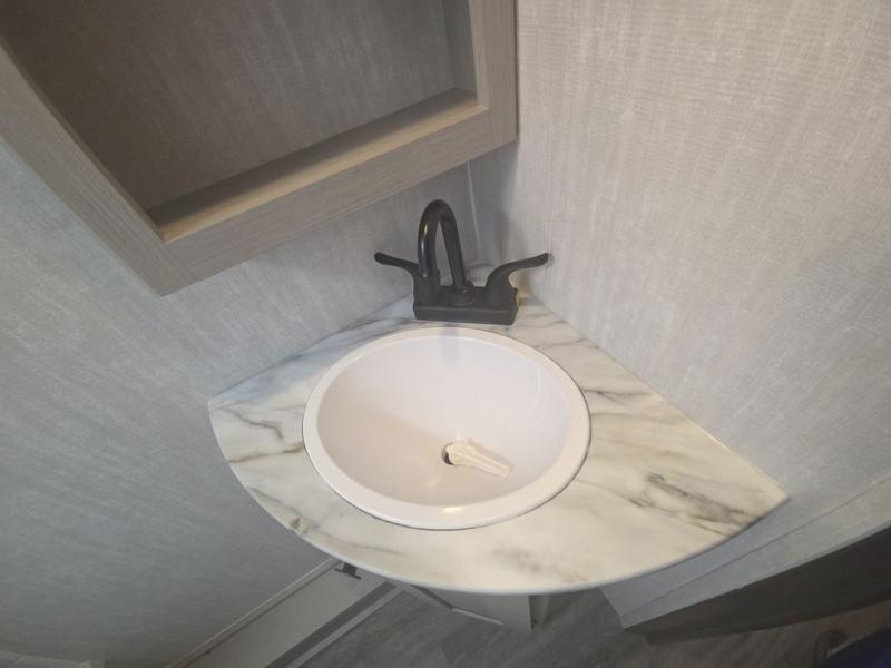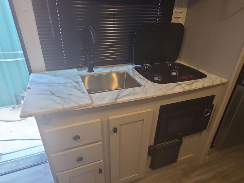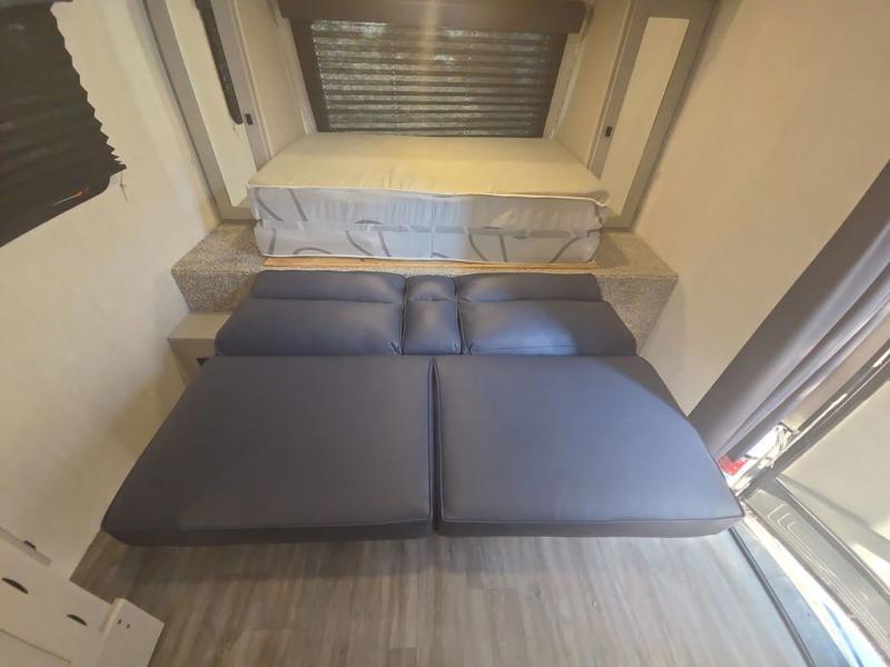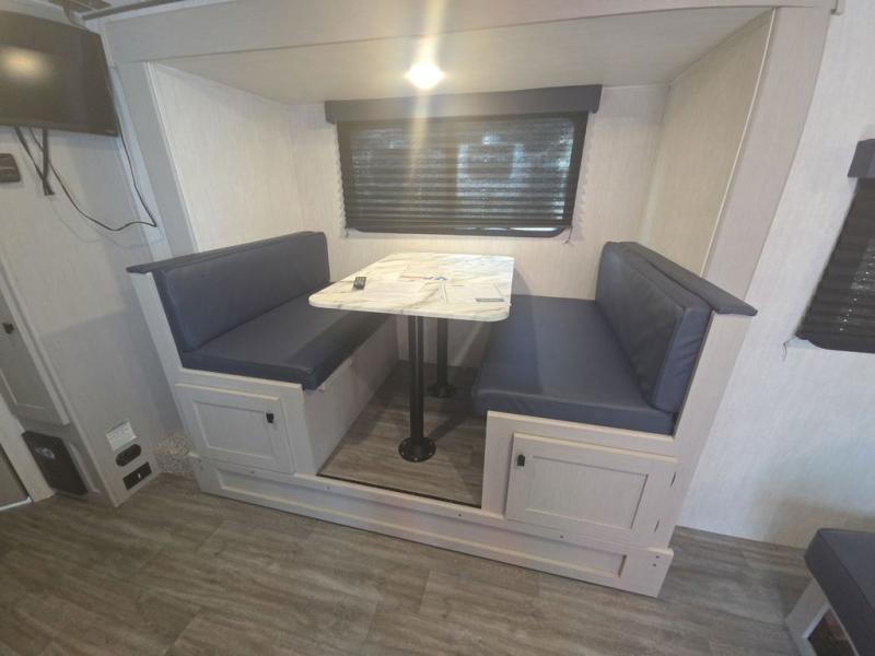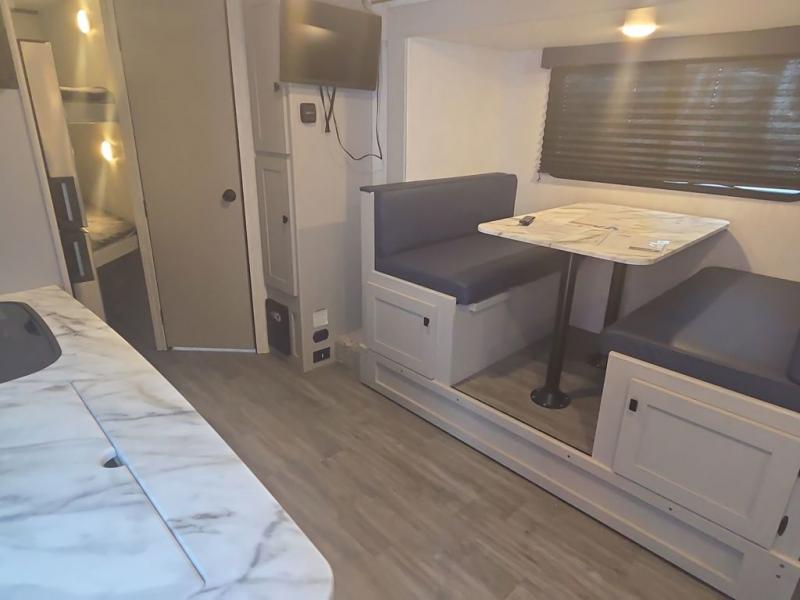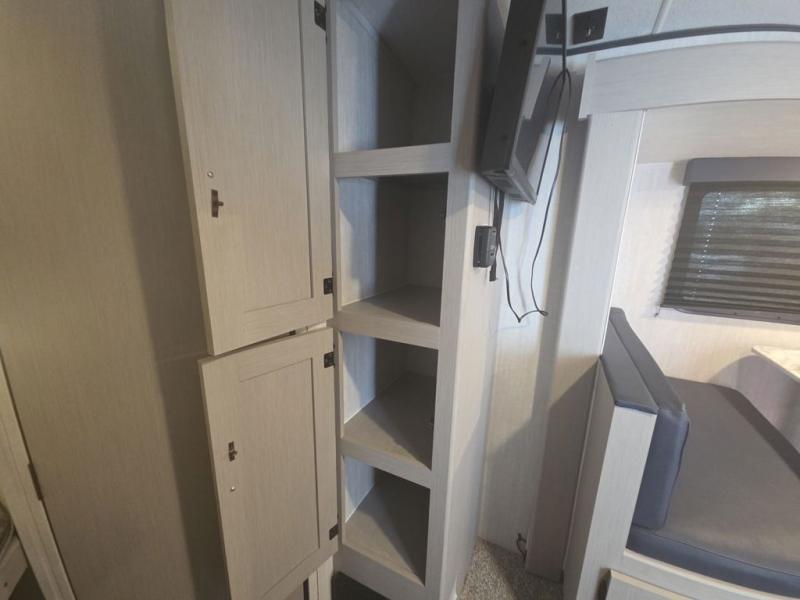 You and a few friends or family members can camp comfortably in this travel trailer! It features a front queen bed with wardrobes on either side to keep your clothes out of the way or you can switch it out for the optional Murphy bed for more versatility. Two others can sleep on the rear corner upper double bed and lower flip up double bed. After you have fried up some eggs on the two burner cooktop and heated up a piece of banana bread in the microwave, you can head to the booth dinette slide to enjoy it. There is even a pantry to store your coffee grounds and snacks. Now that your bellies are full, you can freshen up in the rear corner bathroom with the tub/shower.