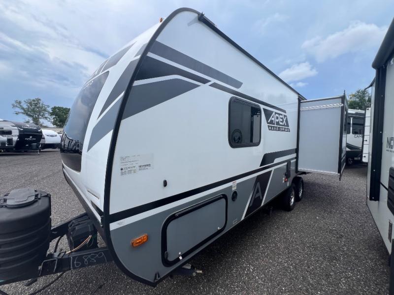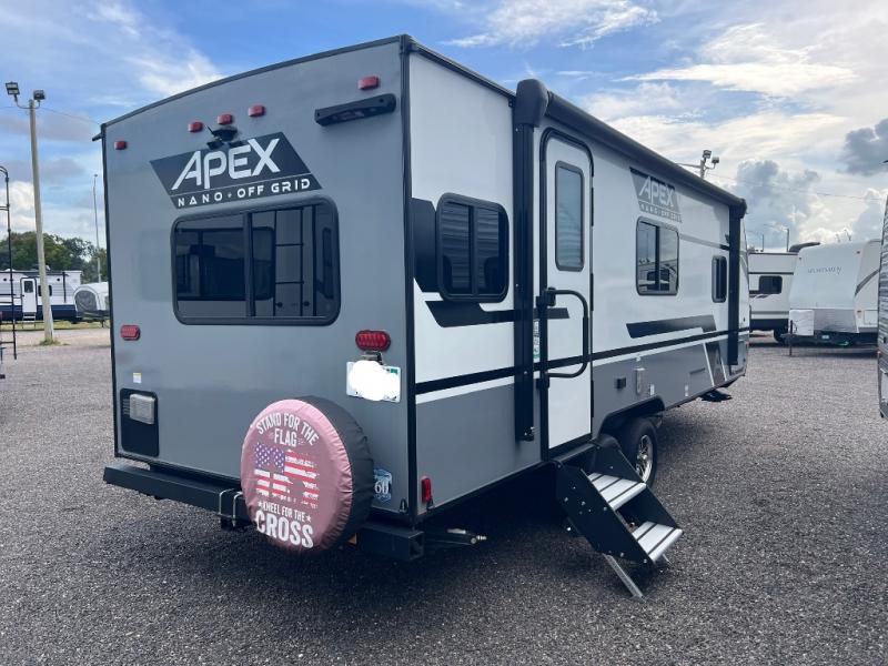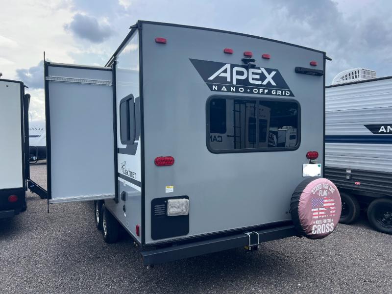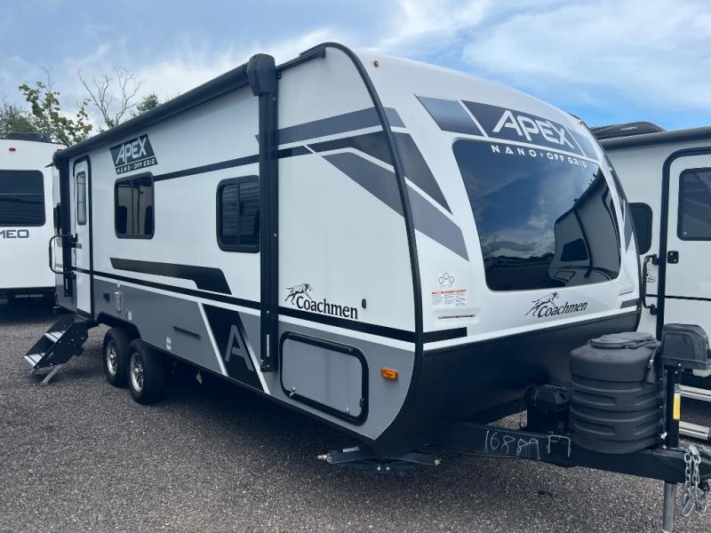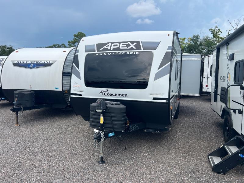 You will find comfort, convenience, and a sturdy construction with each of these Coachmen RV Apex Nano travel trailers! They are held together with an aluma-cage construction, an I-beam chassis, plus vacuum-bonded laminated dual Azdel fiberglass walls for double the protection against the elements. The 200-watt solar panel with a 30 amp control charger is included within the Off-Grid Package, along with two 20 lb. LP tanks, a high velocity power roof vent, plus 12V outlets to keep you powered up. More exterior feature include a hot/cold shower, four stabilizer jacks, a power awning with LED lighting, and magnetic baggage door catches to easily pack and unload your gear. You will love the interior of your Apex Nano with Shaw residential flooring, one-piece seamless edge countertops, matte black hardware in the galley, and a hand-crafted wood medicine cabinet in the bath.