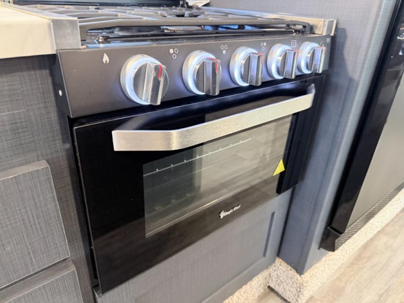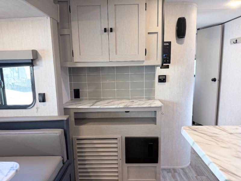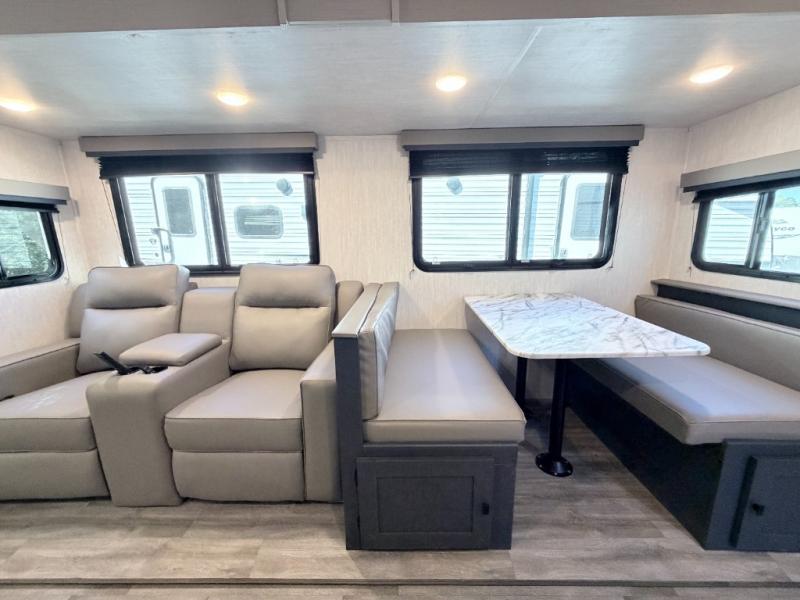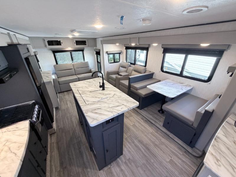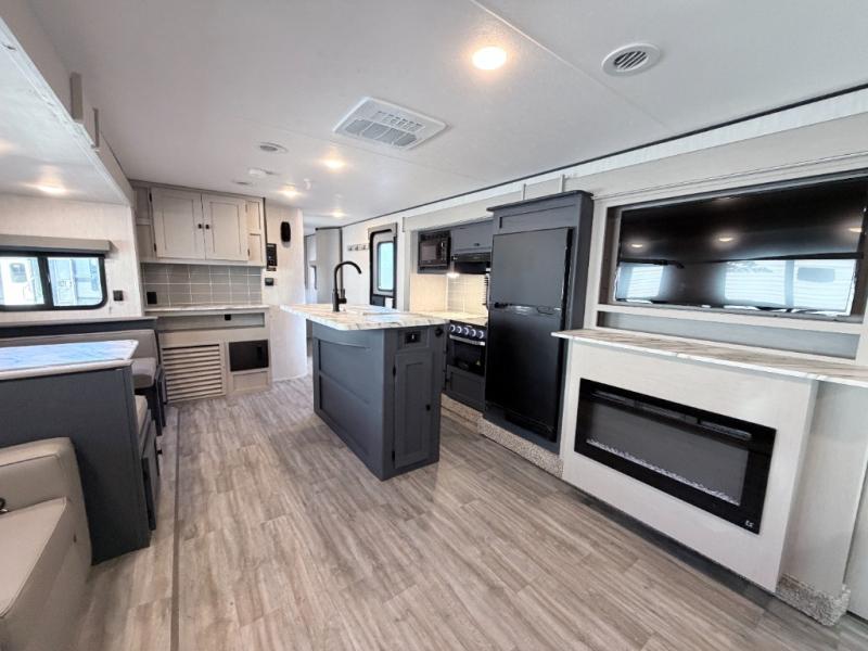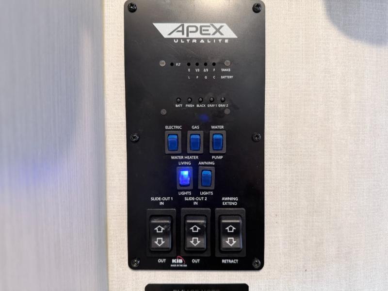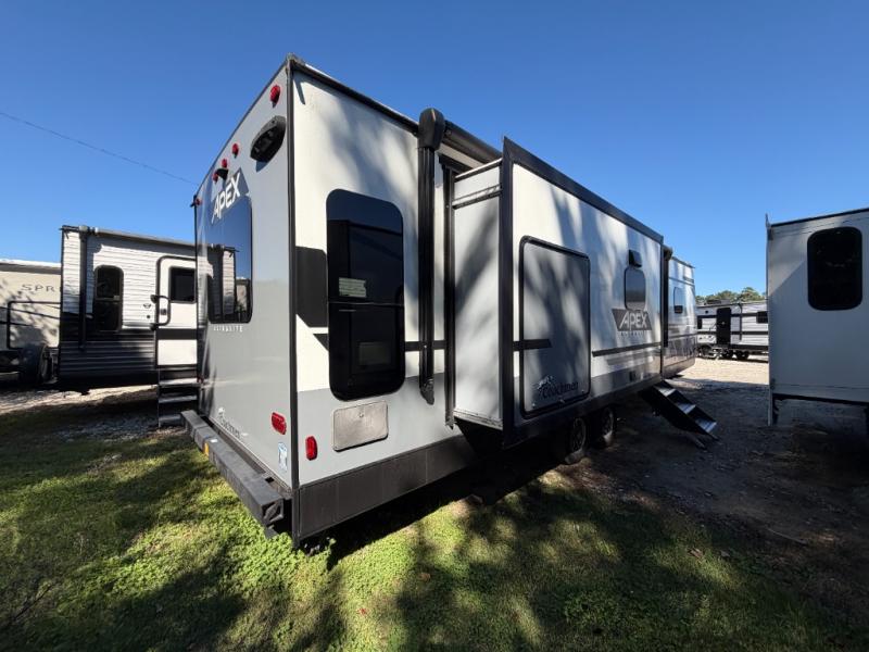 Enjoy a spacious, residential-style camping experience in the Apex Ultra-Lite 293RLDS. Dual opposing slides open up the living and kitchen area for maximum comfort, while the theater seating offers a perfect view of the entertainment center and fireplace. The kitchen island, large hutch, and 8 cu. ft. 12V refrigerator give you everything you need to prepare meals with ease. A front private bedroom with a queen bed and dual wardrobes creates a relaxing retreat at the end of each adventure.