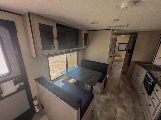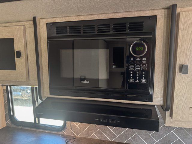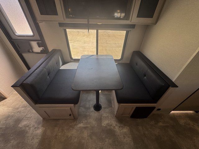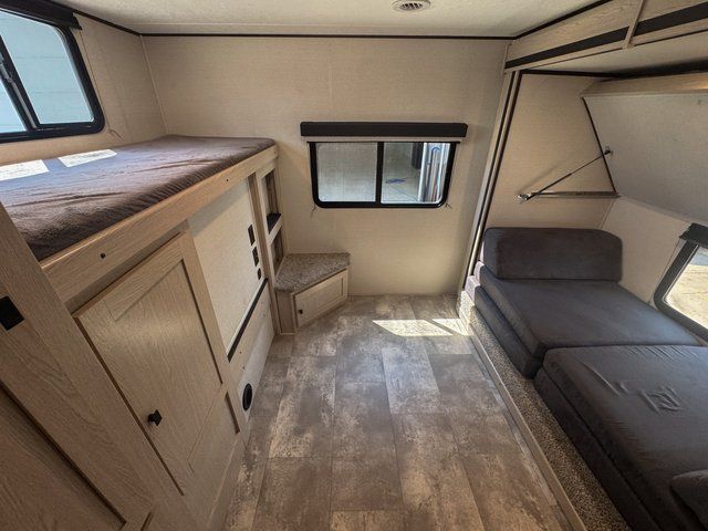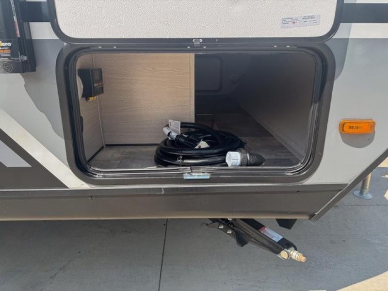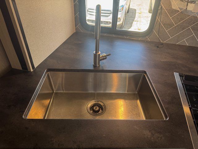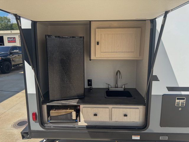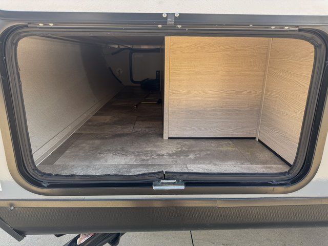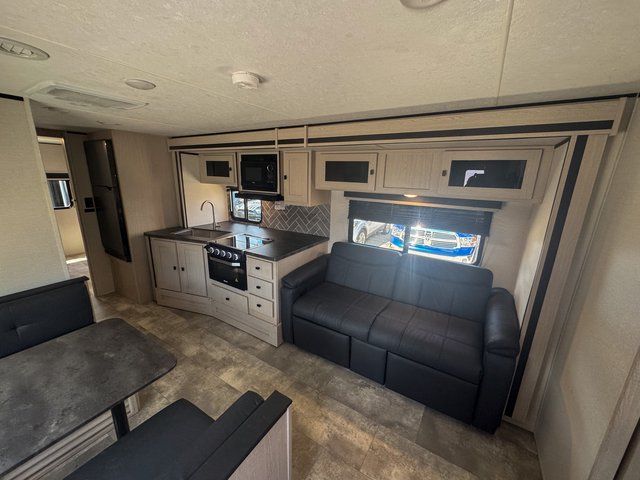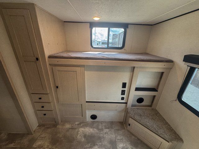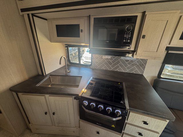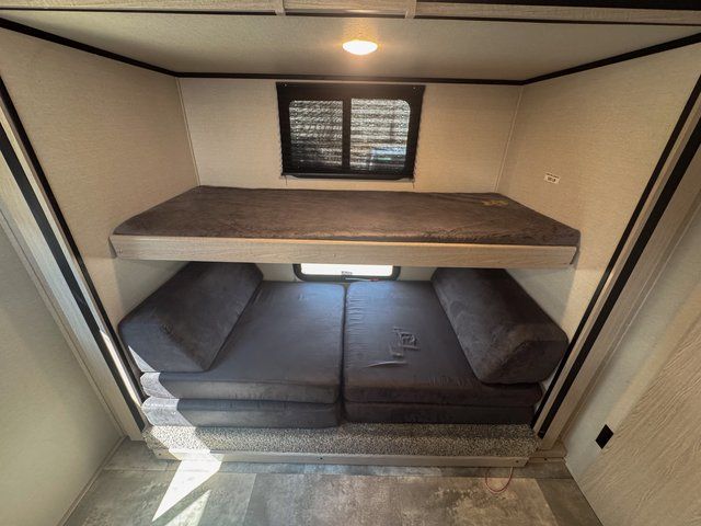 Double slides, a bunkhouse, plus a private bedroom and sleeping for nine make this model ready for anything! There is a private bunkhouse with a slide out futon and an overhead bunk, plus a second bunk for the kids to enjoy. Up front, a queen bed with super storage will provide two a comfortable night's rest in a private bedroom, and any other guests can sleep on the booth dinette and sofa in the main living area. The chef can cook indoors, or outdoors on the outside kitchen, and since there is an 18' power awning with LED lights, you can enjoy a bit of outdoor living space as well!