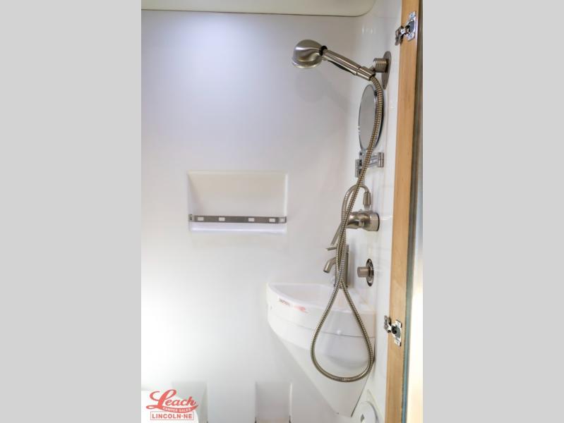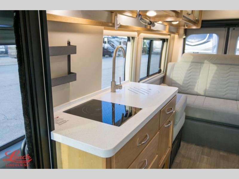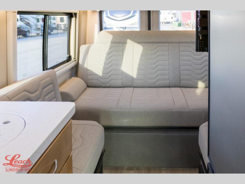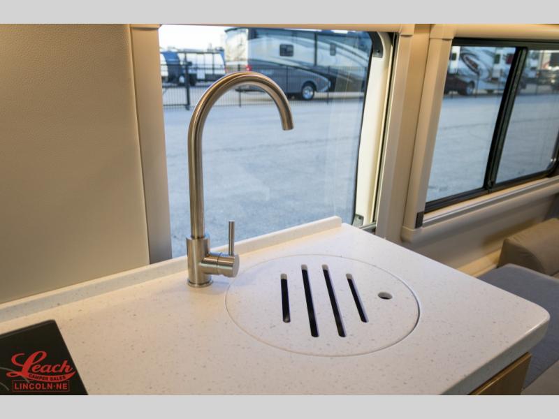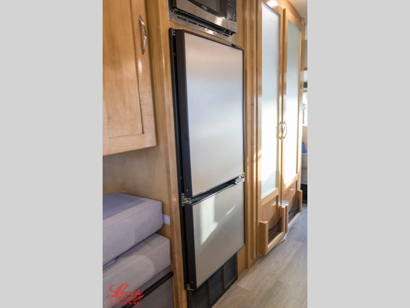 This all-wheel drive coach is perfect for trips near and far. Once you park, you can swivel the captain's seats around to enjoy lunch at the removeable table, and you can freshen up in the convenient wet bath before heading out to stretch your legs. There is an induction cooktop, a round sink, plus a Nova Kool compressor refrigerator for your perishables. The two jump seats and rear power sofa will convert to a comfortable bed at night, and the lagun table in between will allow you to play a game of cards before bed. And don't worry about storage space since this model includes overhead compartments and a wardrobe to keep your clothes wrinkle-free!