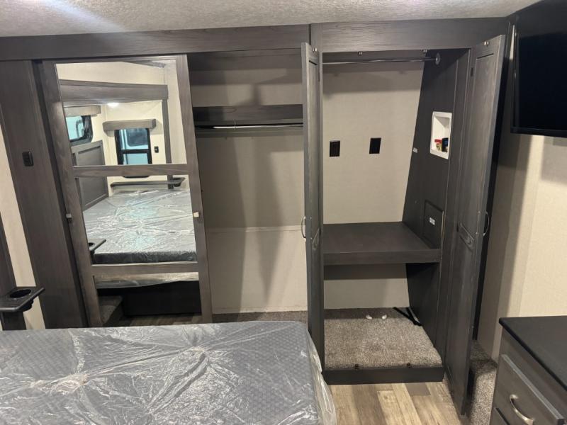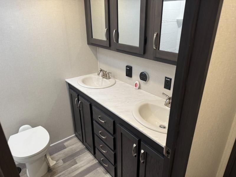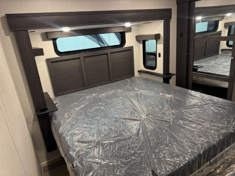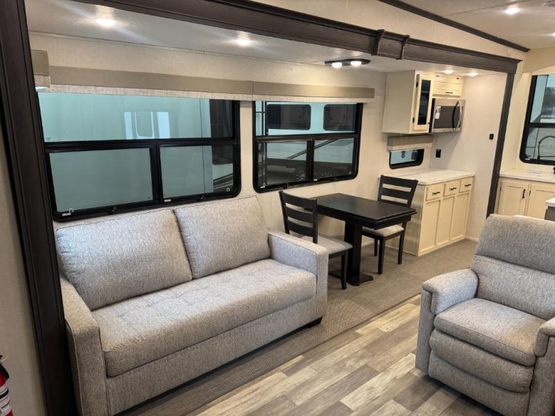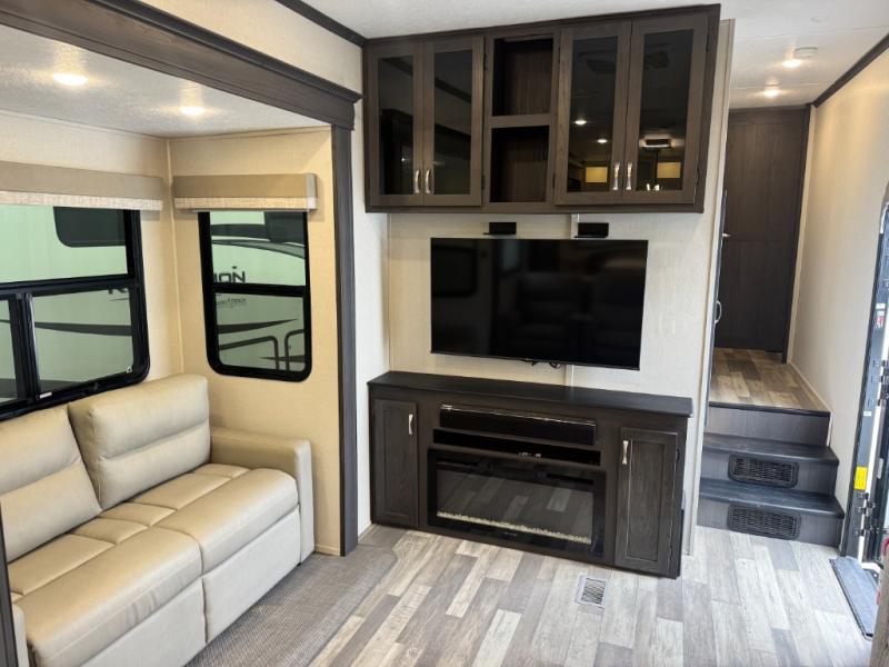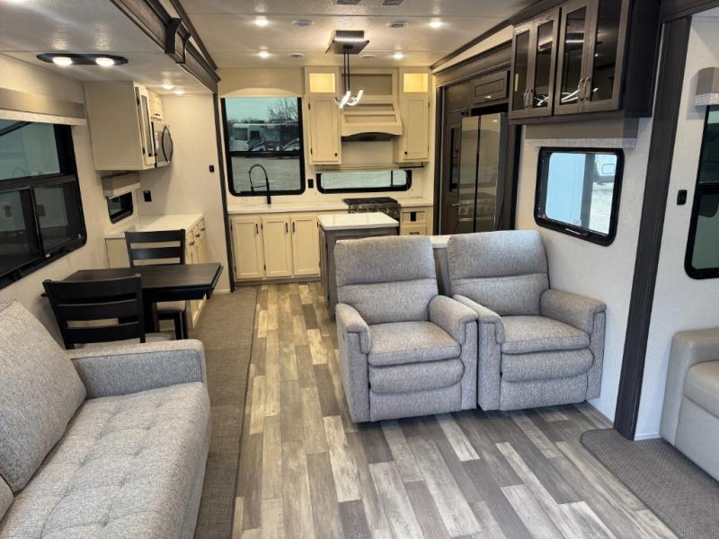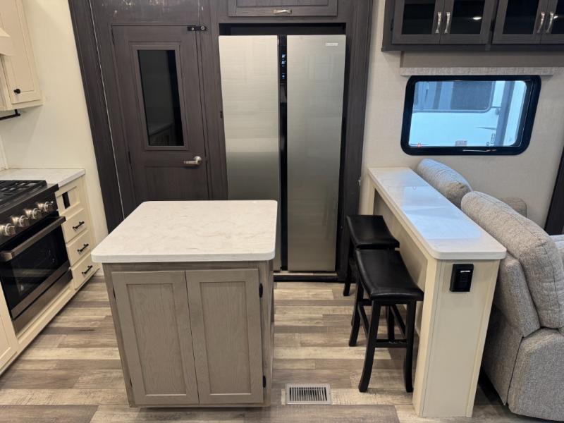 One look at this fifth wheel and you'll be sold. You'll find tons of counter space in the rear kitchen along with a kitchen island, a large pantry, and a hutch for even more storage. Visit in the main living area on the two theater seats and tri-fold sofa, or you may want to head outdoors under the two power awnings! There is even an outside refrigerator here to entertain guests. The spacious full bath will allow you to clean up after a day of adventuring, and here you'll find a full-size shower with sliding glass doors and a seat, plus a dual sink vanity. The front private bedroom will feel just like home with its king bed slide out, large wardrobe, and dresser to keep your clothes tidy.