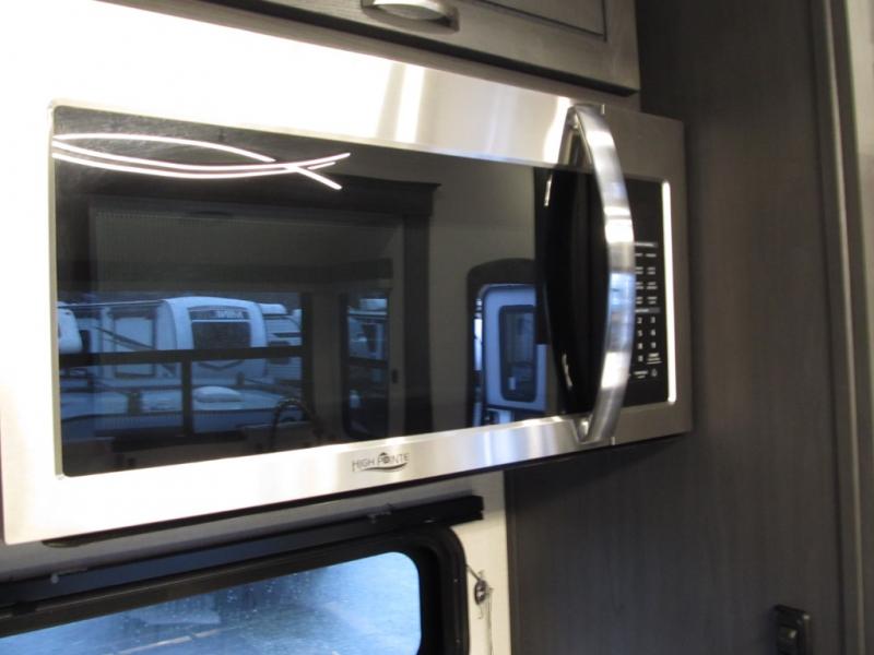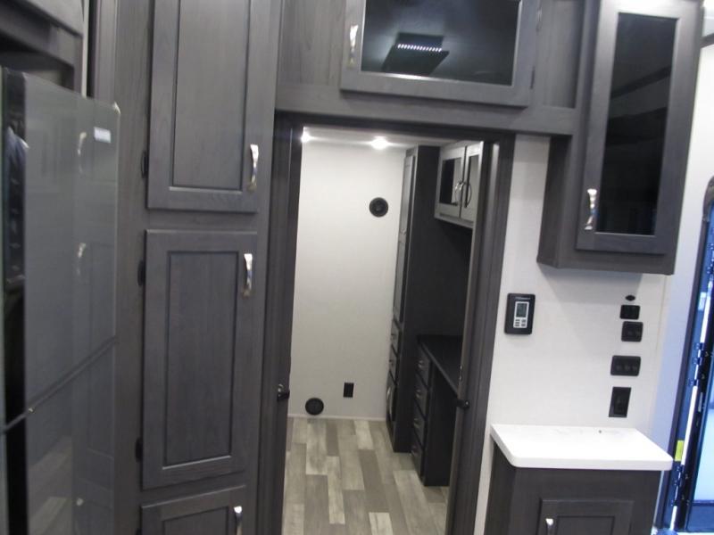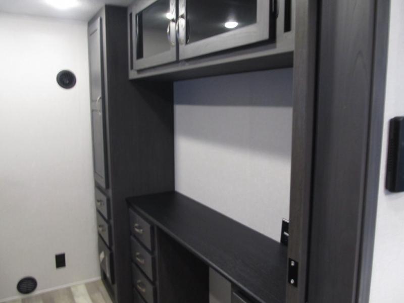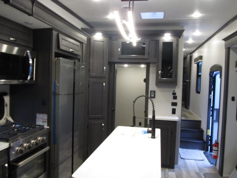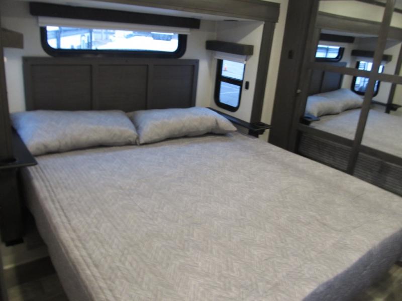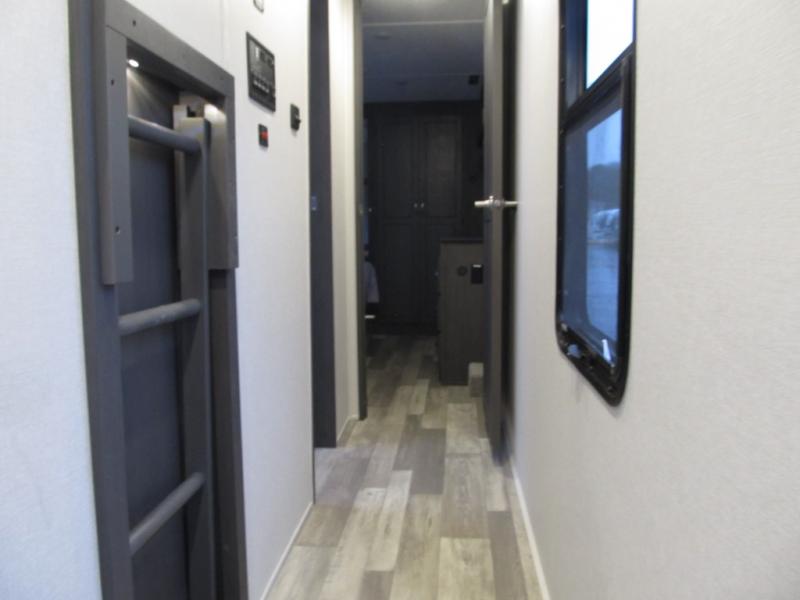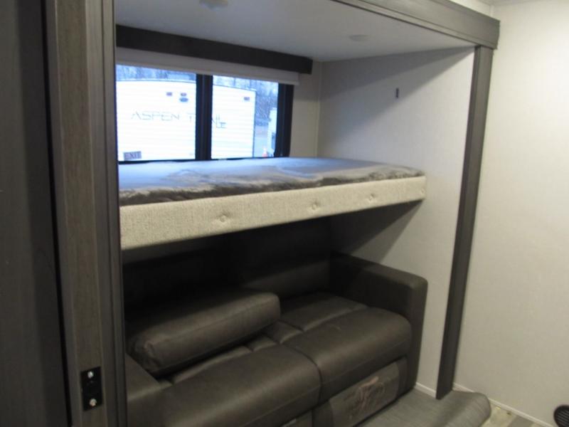 This family-friendly fifth wheel can sleep six to eight comfortably between the king bed, the tri-fold sofa, and the middle bunkhouse with a loft above! There is plenty of counter space in the bunkhouse, plus a sofa with a removable table and a wardrobe for clothes. The kitchen is any chef's dream with its residential cooktop, 15.6 cu. ft. 12V refrigerator, and kitchen island for more counter space. While dinner is being made, you can play a game of cards at the free-standing table, relax on the tri-fold sofa, or visit outdoors under the 20' power awning with LED lights. You won't be left wanting for storage space in this model thanks to the overhead cabinets, plus the bedroom dresser and large wardrobe. There is even a wardrobe with washer and dryer prep if you choose to go full-time!