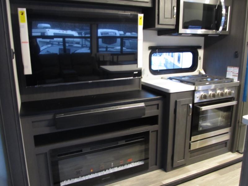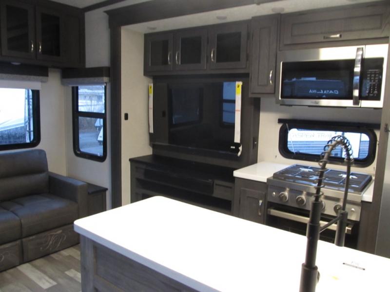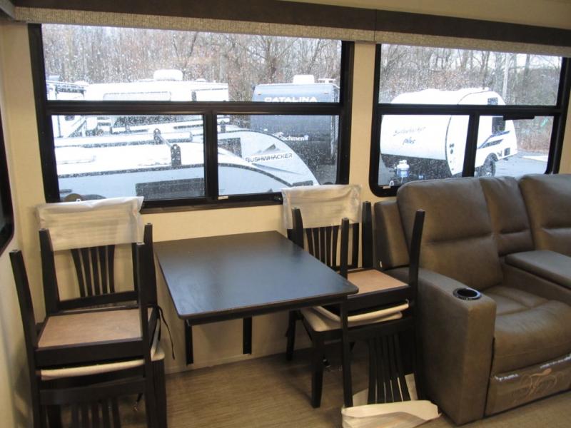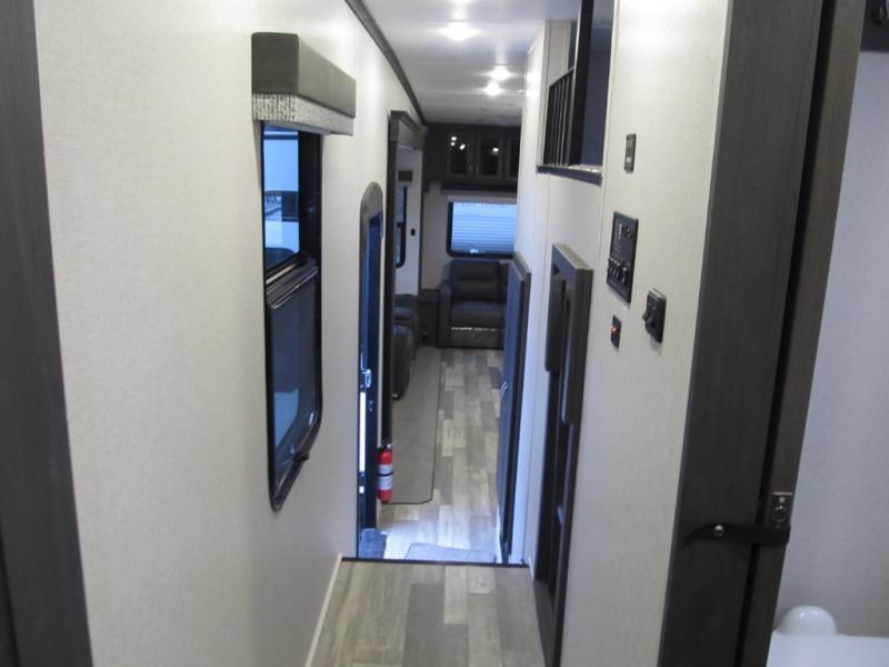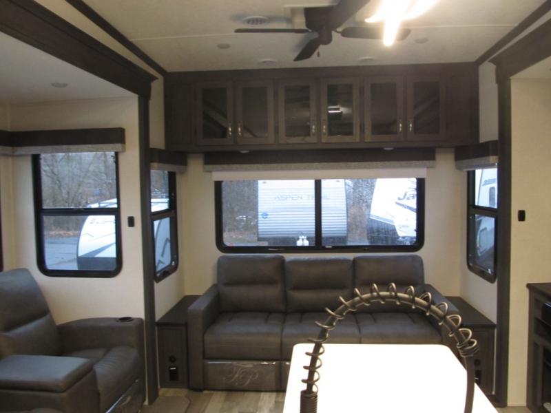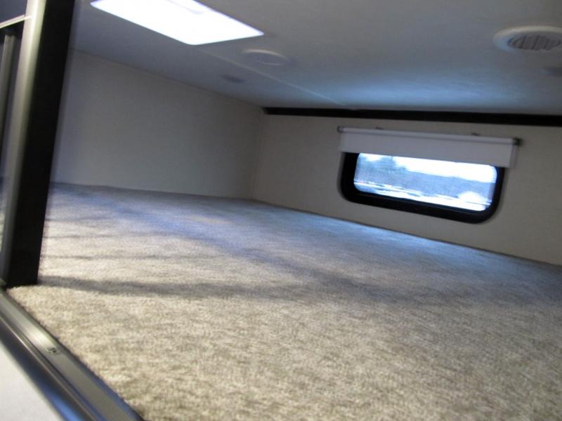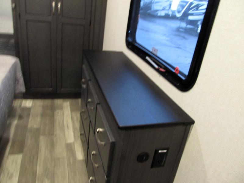 This family-friendly fifth wheel can sleep six to eight comfortably between the king bed, the tri-fold sofa, and the middle bunkhouse with a loft above! There is plenty of counter space in the bunkhouse, plus a sofa with a removable table and a wardrobe for clothes. The kitchen is any chef's dream with its residential cooktop, 15.6 cu. ft. 12V refrigerator, and kitchen island for more counter space. While dinner is being made, you can play a game of cards at the free-standing table, relax on the tri-fold sofa, or visit outdoors under the 20' power awning with LED lights. You won't be left wanting for storage space in this model thanks to the overhead cabinets, plus the bedroom dresser and large wardrobe. There is even a wardrobe with washer and dryer prep if you choose to go full-time!
