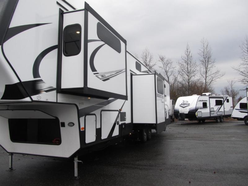 The Brookstone fifth wheels by Coachmen are coming to you with wide-body comfort, home-like amenities, and unique designs for a truly luxurious RV. The Weather Shield+ consists of a 6X double Azdel aluminum cage sidewall system, a Radiant Pro weather barrier system, and more that will help you extend your camping season or go full-time. Head inside to find solid surface countertops in the kitchen, an XL HD LED TV in the living room, slow rise roller night shades, and the list of comforts goes on! The Brookstone also includes 6-point electric auto-leveling, four Solid Step entry steps, an electric awning with LED lights, and many more exterior conveniences!