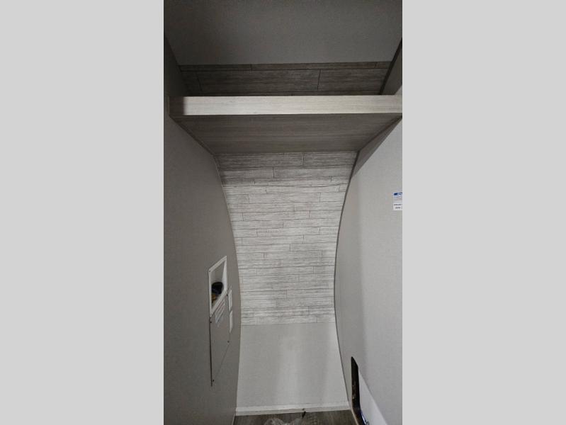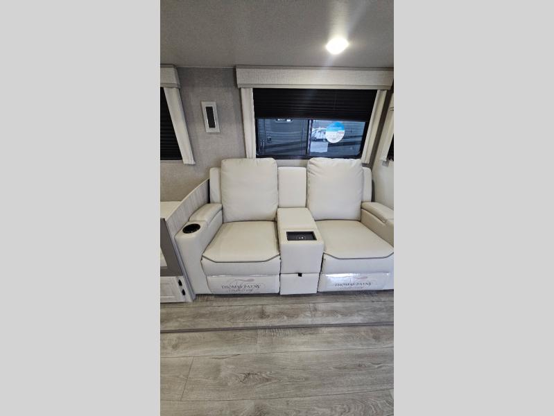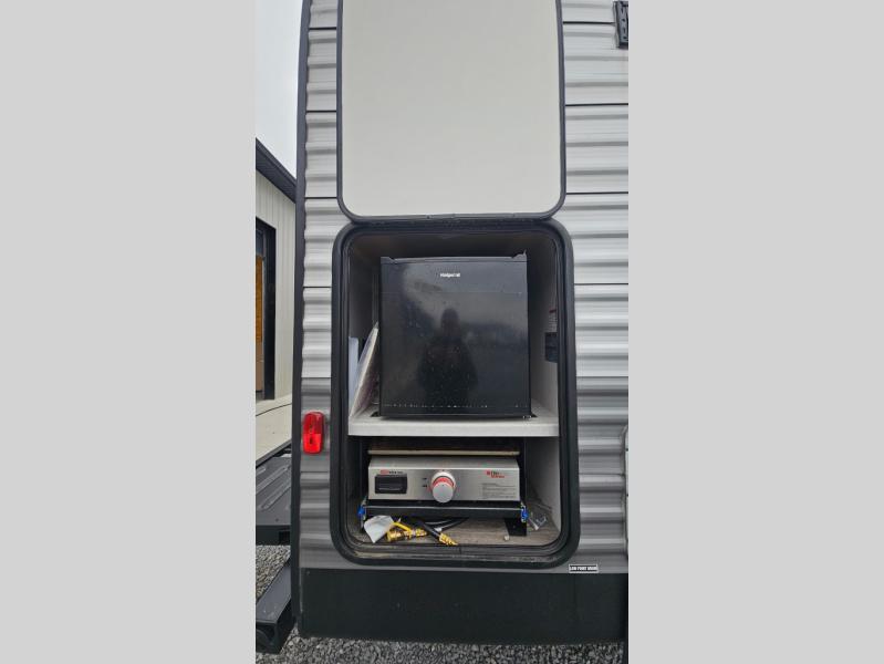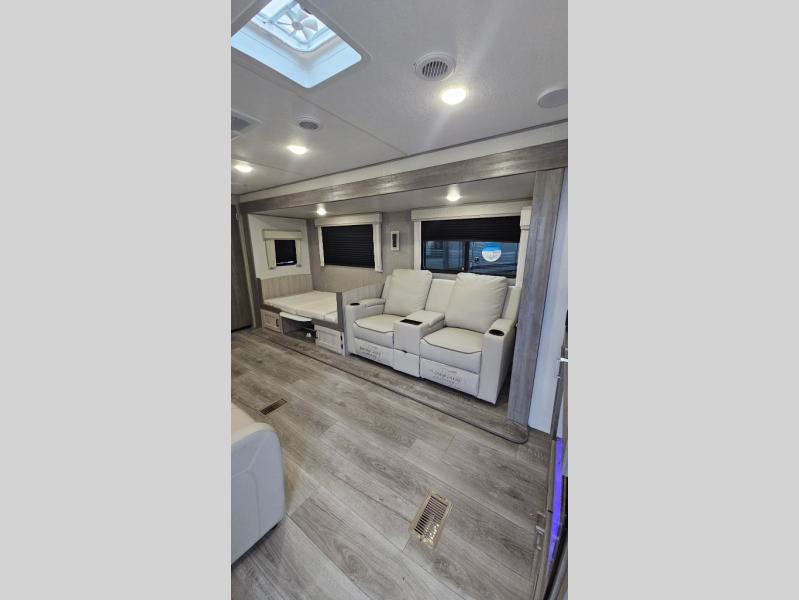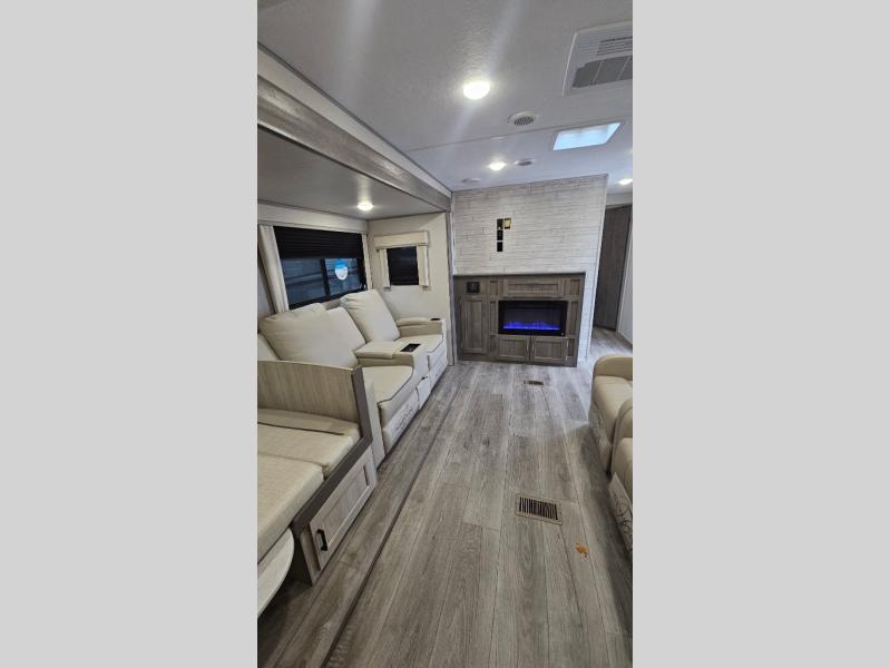 Enjoy relaxing under the 21' electric awning during the daytime for some protection from the sun, and at night with multicolor LED lights to set the mood for the evening. You can store beverages in the exterior mini fridge for convenience, and there is exterior storage for outdoor games and such. The interior is spacious with a large slide out booth dinette and sofa with drink holders, yet you might like to choose the free standing dinette option in place of the booth dinette. There is also a fireplace option under the entertainment center for a more cozy feel. The two recliner lounges are sure to be a favorite spot, and the cook will love the rear kitchen including the U-shaped counter when preparing meals and drying the dishes. The front bedroom is unique with a fireplace, entertainment center, slide out queen bed with nightstands and a large front closet plus a closet prepped for a washer/dryer option.