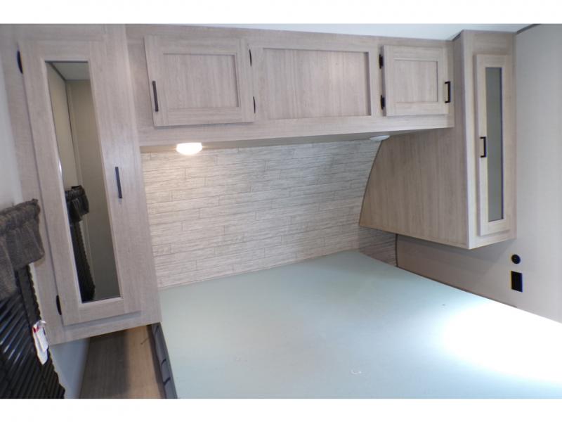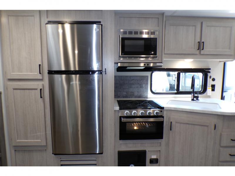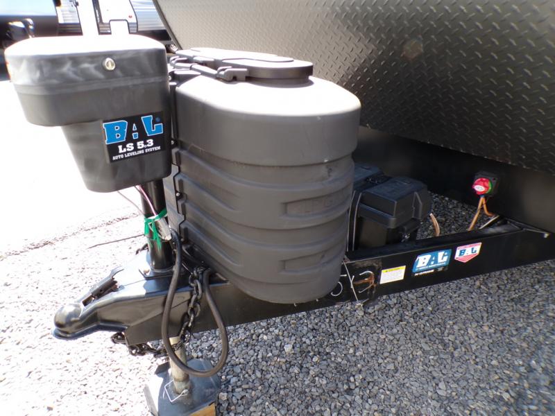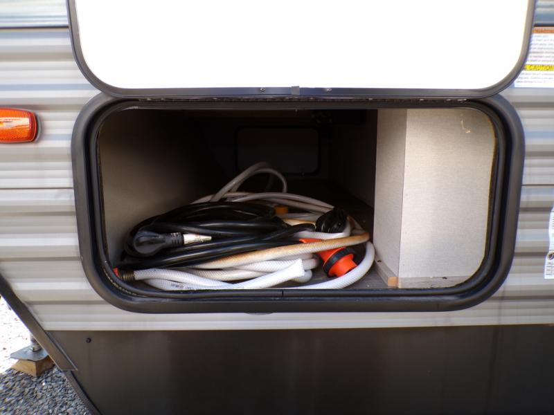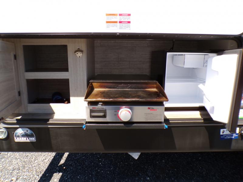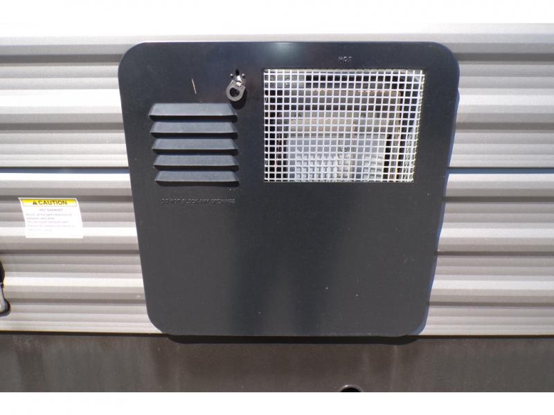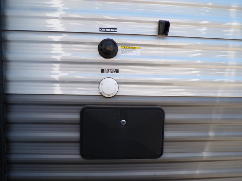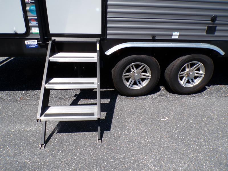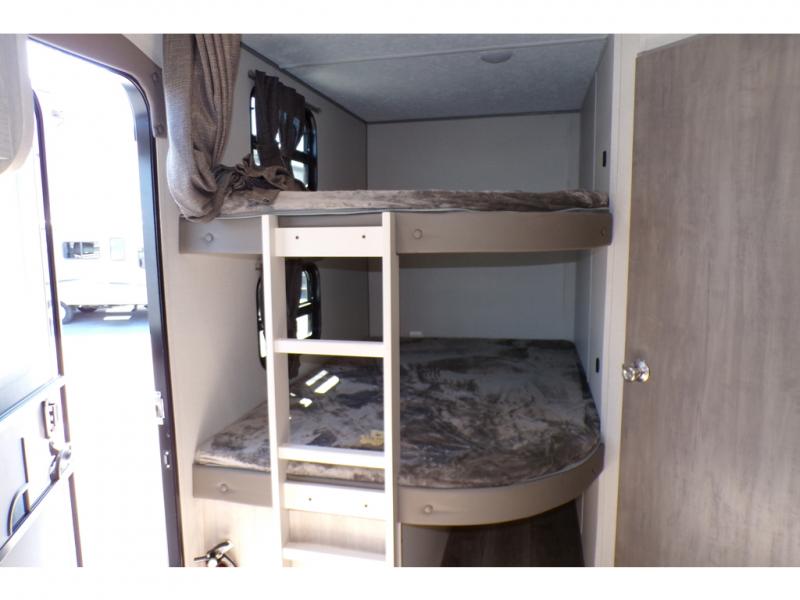 When you enjoy camping with your own accommodations and space for the whole crew, hitch this trailer up and head to the campgrounds! After loading everything easily thanks to the dual entry doors and all the interior and exterior storage, you will have no worries that you left anything behind. The electric awning is easy to set up, like the large slide out, and the awning offers multicolor LED lights to choose from by using the remote. When you are outside the cook might like to make a meal using the outside camper kitchen. The interior kitchen offers full amenities including a pantry, and everyone can enjoy the angled entertainment center. There are double-size bunks with a ladder for the kids and a walk-around queen for the owner to sleep on, plus furniture in the living area that doubles as additional sleeping space!