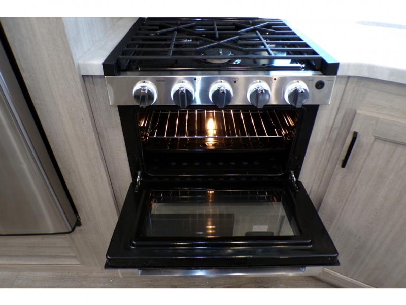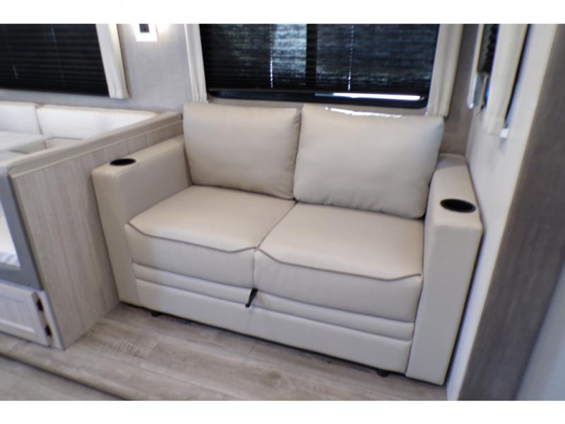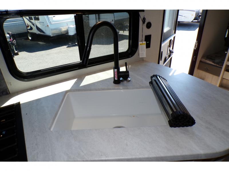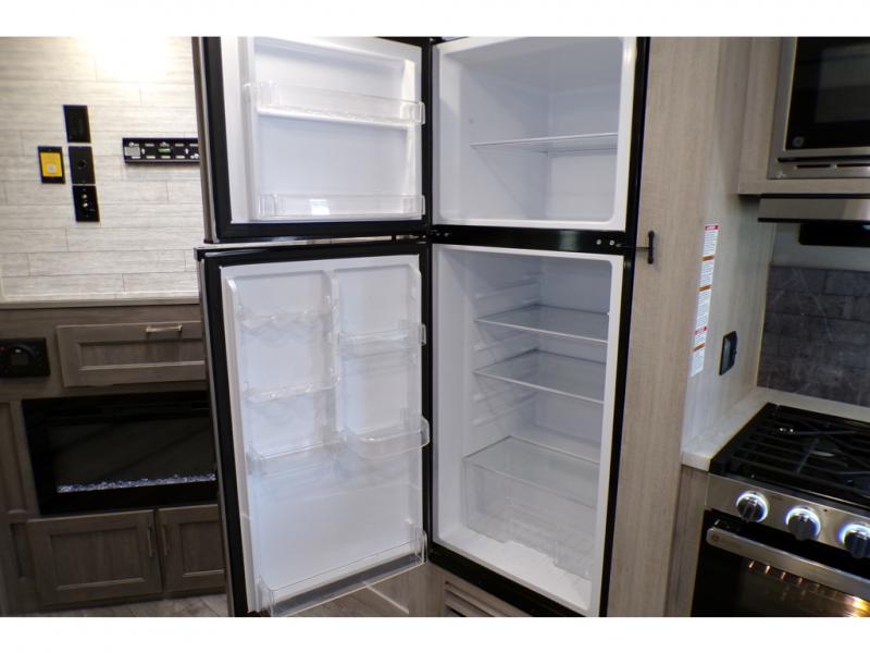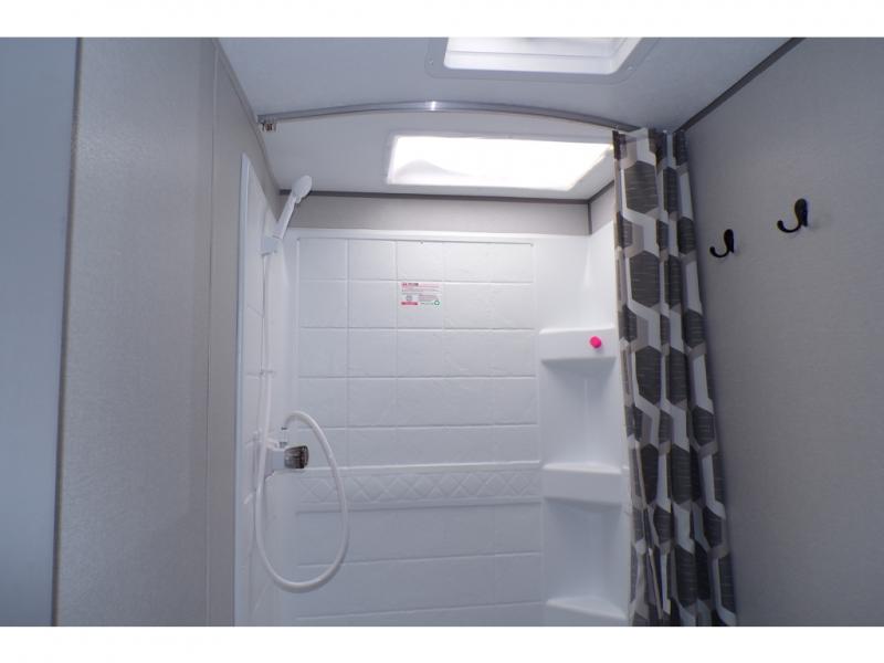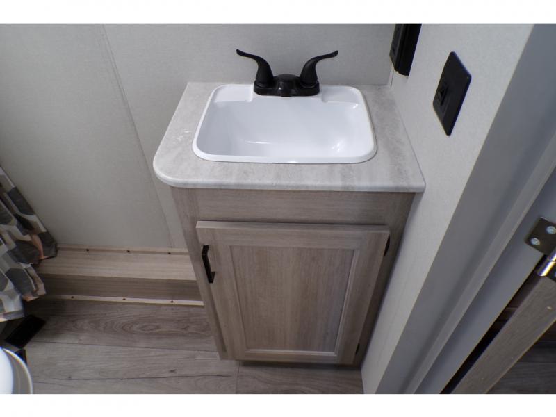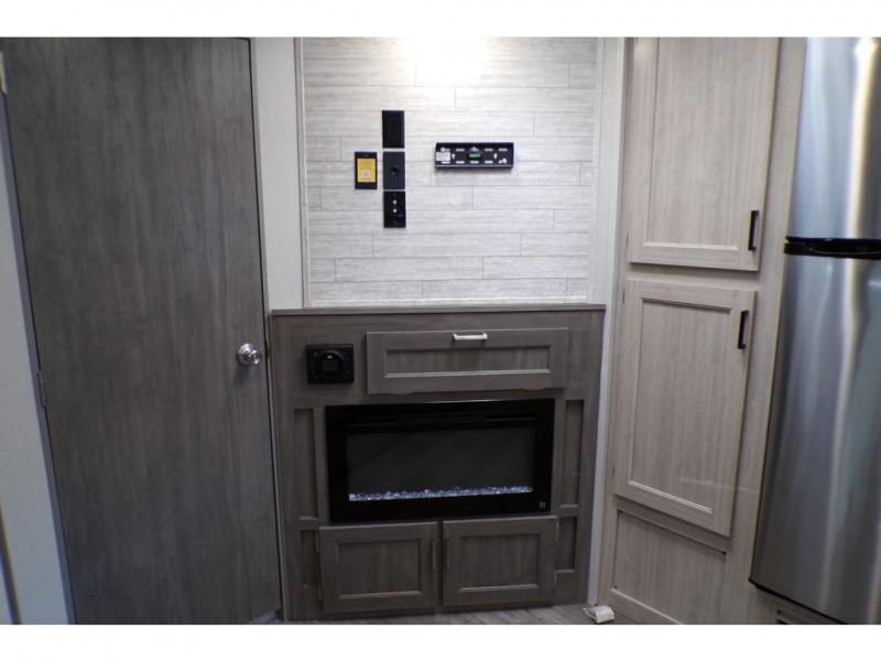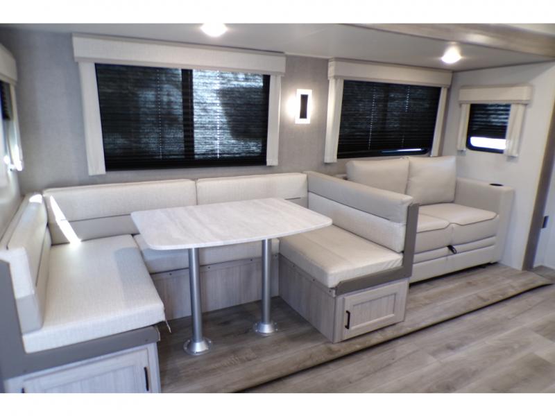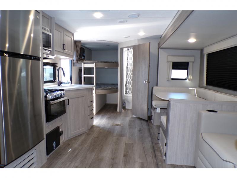 When you enjoy camping with your own accommodations and space for the whole crew, hitch this trailer up and head to the campgrounds! After loading everything easily thanks to the dual entry doors and all the interior and exterior storage, you will have no worries that you left anything behind. The electric awning is easy to set up, like the large slide out, and the awning offers multicolor LED lights to choose from by using the remote. When you are outside the cook might like to make a meal using the outside camper kitchen. The interior kitchen offers full amenities including a pantry, and everyone can enjoy the angled entertainment center. There are double-size bunks with a ladder for the kids and a walk-around queen for the owner to sleep on, plus furniture in the living area that doubles as additional sleeping space!