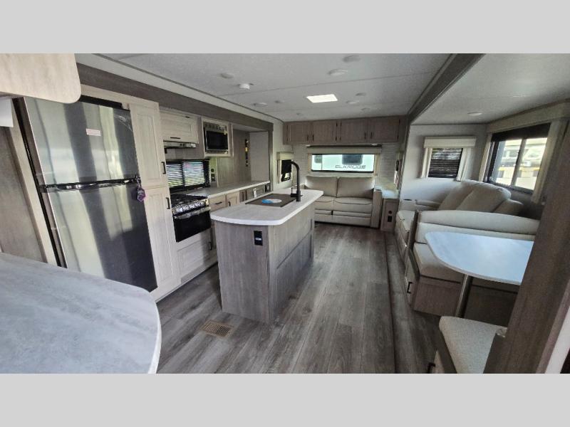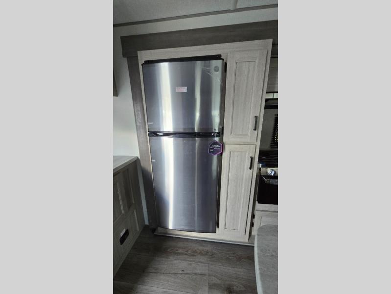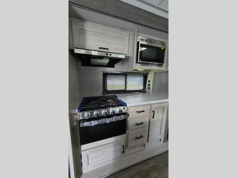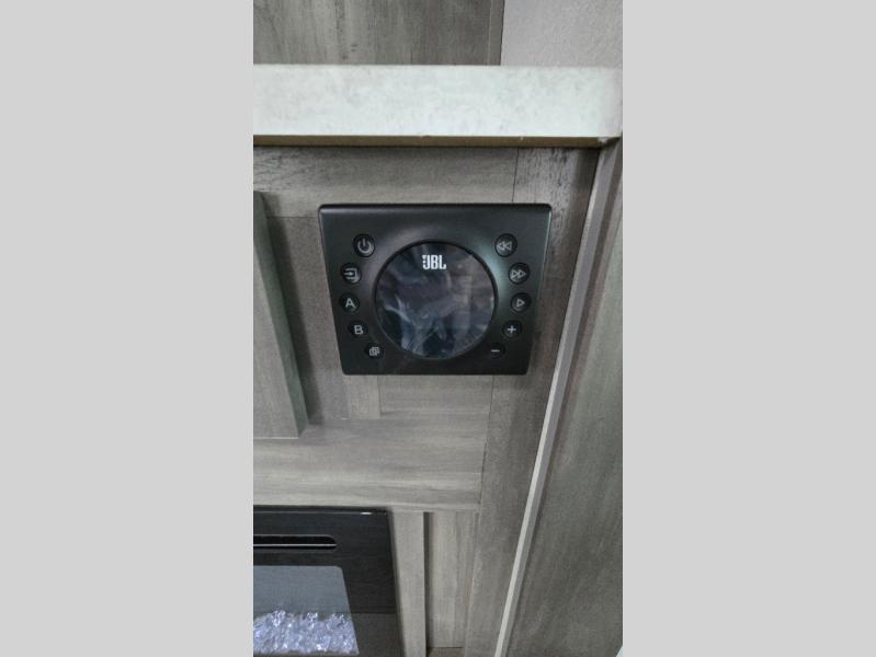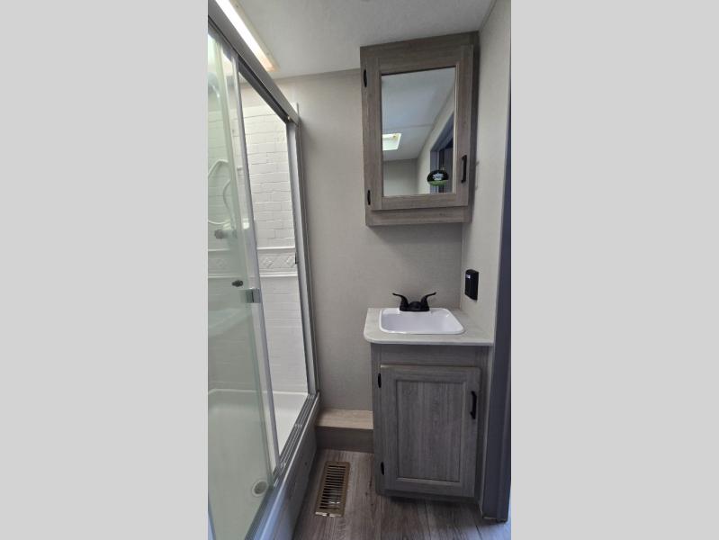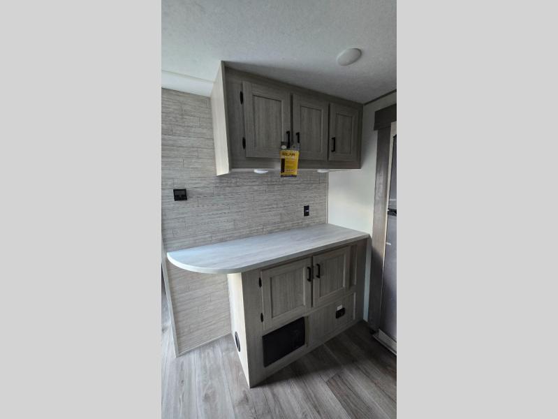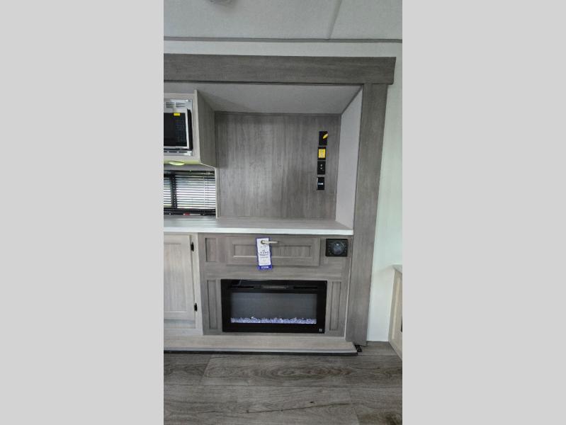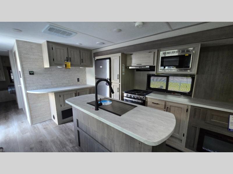 Summer camping trips just got sweeter in this spacious travel trailer that can sleep four to five each night. The dual opposing slides in the combined kitchen and living room will give your crew plenty of space to relax on the front sofa or the theater seating, and there is a booth dinette to dine at. There is even an optional fireplace if you want your space to feel a little more like home. A kitchen island with a double sink will make cooking and cleaning easier, and the bar area is sure to be a big hit when entertaining guests. The spacious full bath includes a 36" x 30" shower with a skylight and a convenient medicine cabinet to keep things tidy. When you're ready to turn in for the night, the rear bedroom with an RV queen bed is sure to bring a great night's rest. There are also dual wardrobes to keep your clothes organized and a closet with washer and dryer prep if you want the option to make laundry day easier.