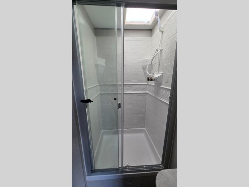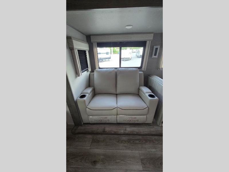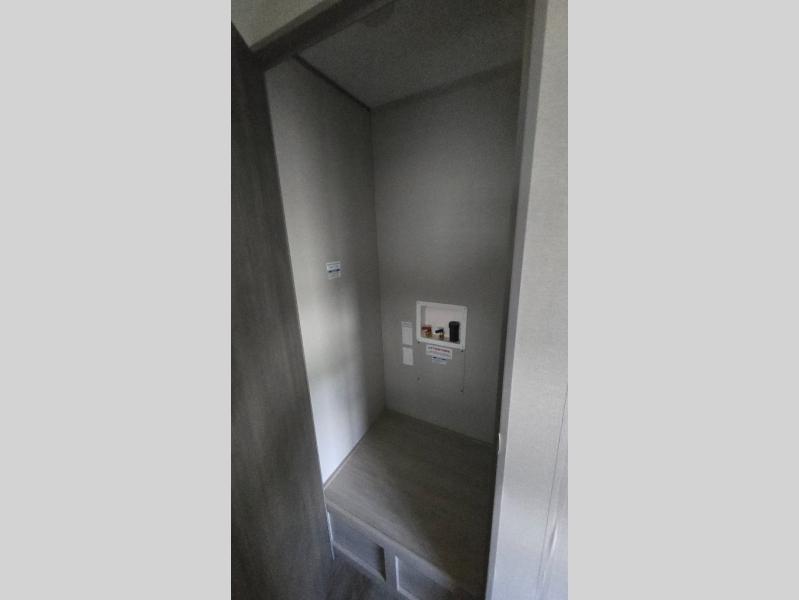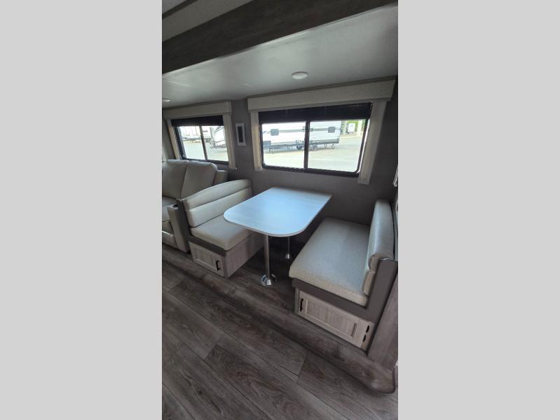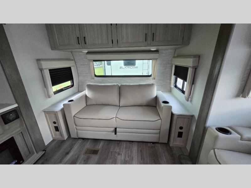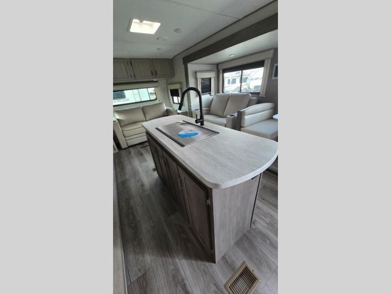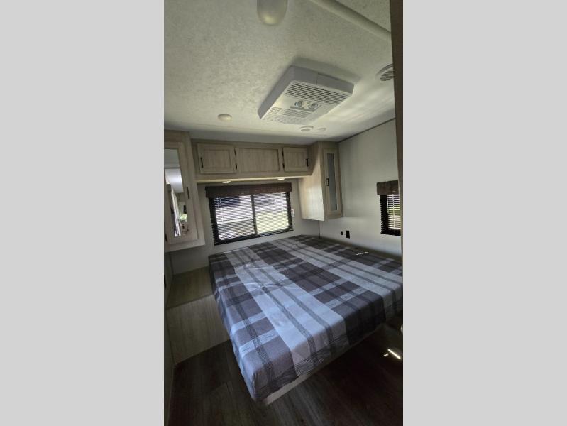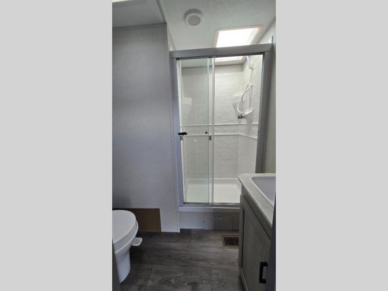 Summer camping trips just got sweeter in this spacious travel trailer that can sleep four to five each night. The dual opposing slides in the combined kitchen and living room will give your crew plenty of space to relax on the front sofa or the theater seating, and there is a booth dinette to dine at. There is even an optional fireplace if you want your space to feel a little more like home. A kitchen island with a double sink will make cooking and cleaning easier, and the bar area is sure to be a big hit when entertaining guests. The spacious full bath includes a 36" x 30" shower with a skylight and a convenient medicine cabinet to keep things tidy. When you're ready to turn in for the night, the rear bedroom with an RV queen bed is sure to bring a great night's rest. There are also dual wardrobes to keep your clothes organized and a closet with washer and dryer prep if you want the option to make laundry day easier.