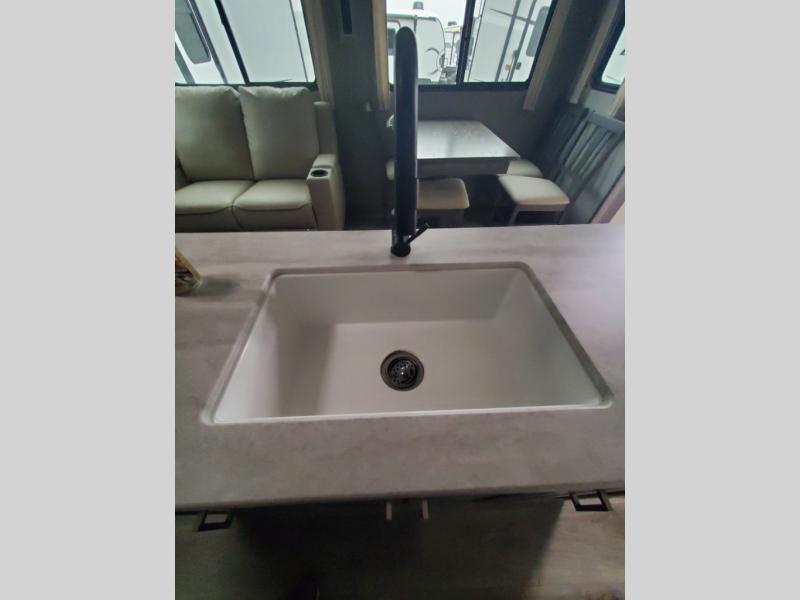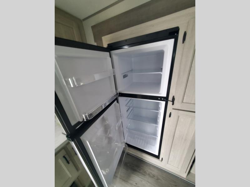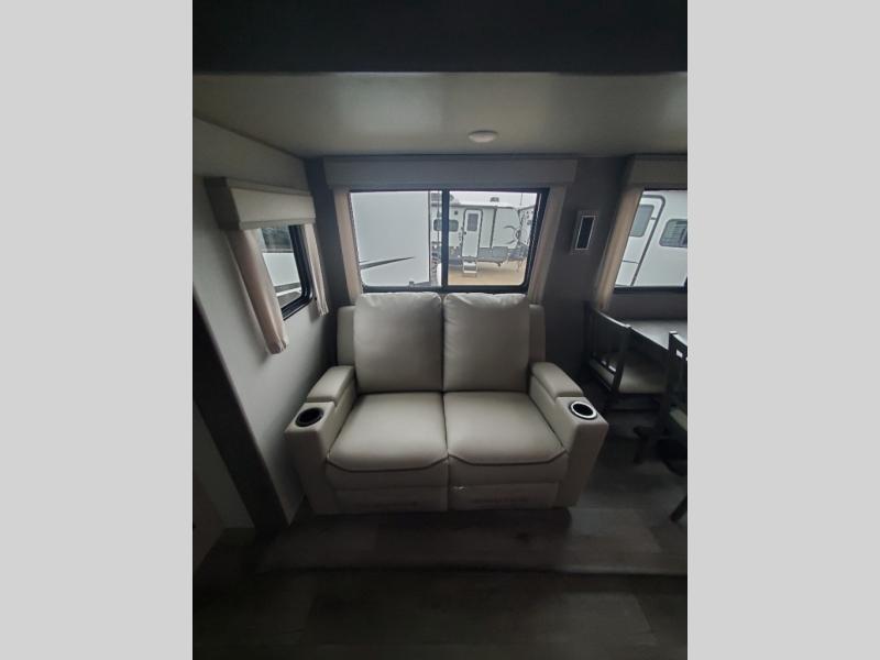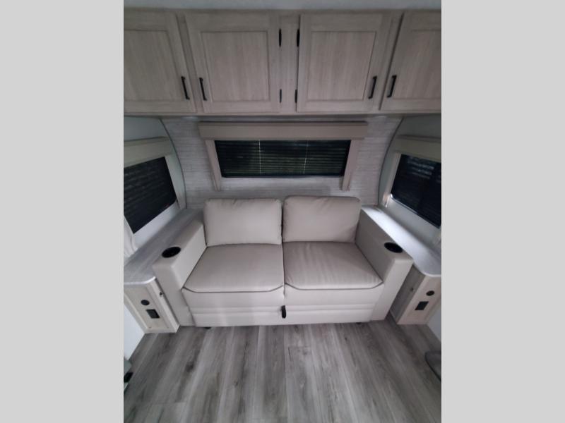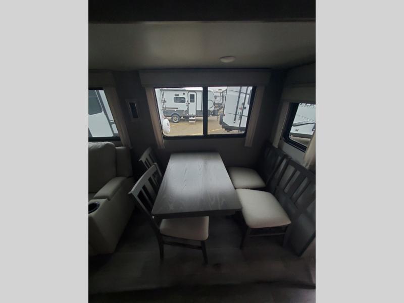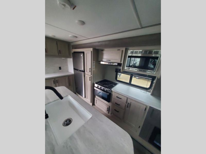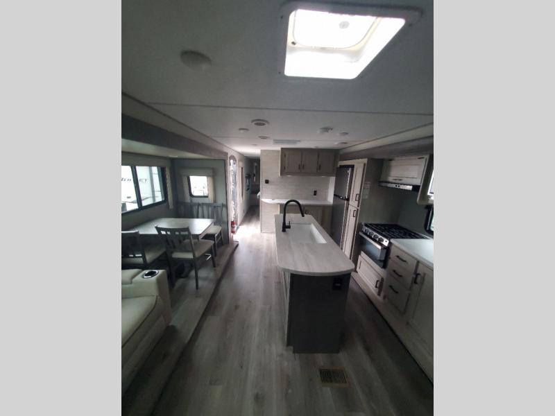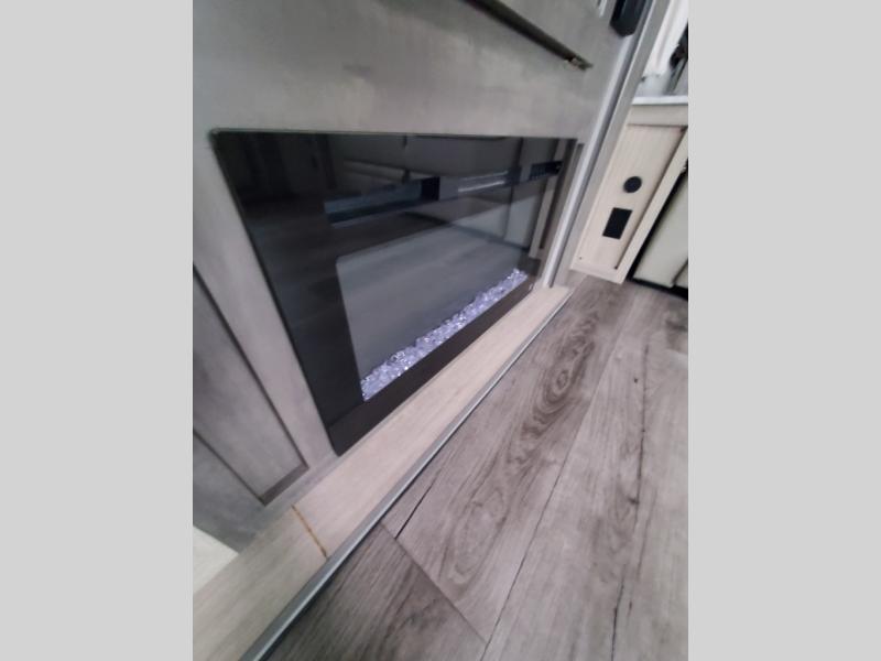 Summer camping trips just got sweeter in this spacious travel trailer that can sleep four to five each night. The dual opposing slides in the combined kitchen and living room will give your crew plenty of space to relax on the front sofa or the theater seating, and there is a booth dinette to dine at. There is even an optional fireplace if you want your space to feel a little more like home. A kitchen island with a double sink will make cooking and cleaning easier, and the bar area is sure to be a big hit when entertaining guests. The spacious full bath includes a 36" x 30" shower with a skylight and a convenient medicine cabinet to keep things tidy. When you're ready to turn in for the night, the rear bedroom with an RV queen bed is sure to bring a great night's rest. There are also dual wardrobes to keep your clothes organized and a closet with washer and dryer prep if you want the option to make laundry day easier.