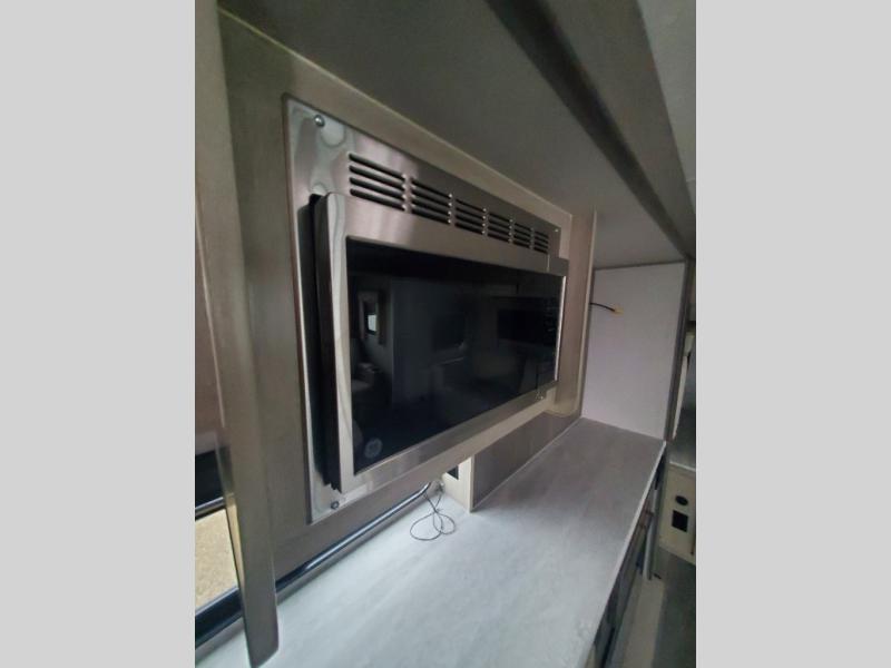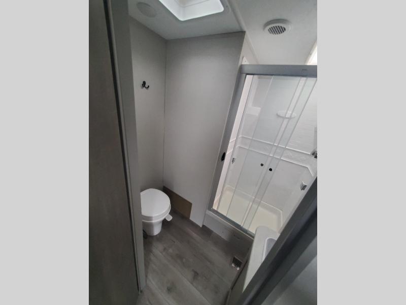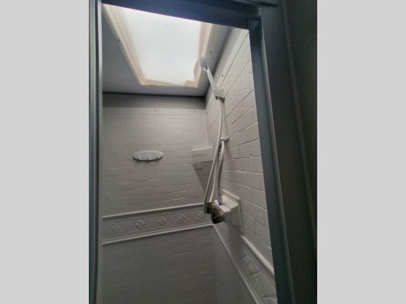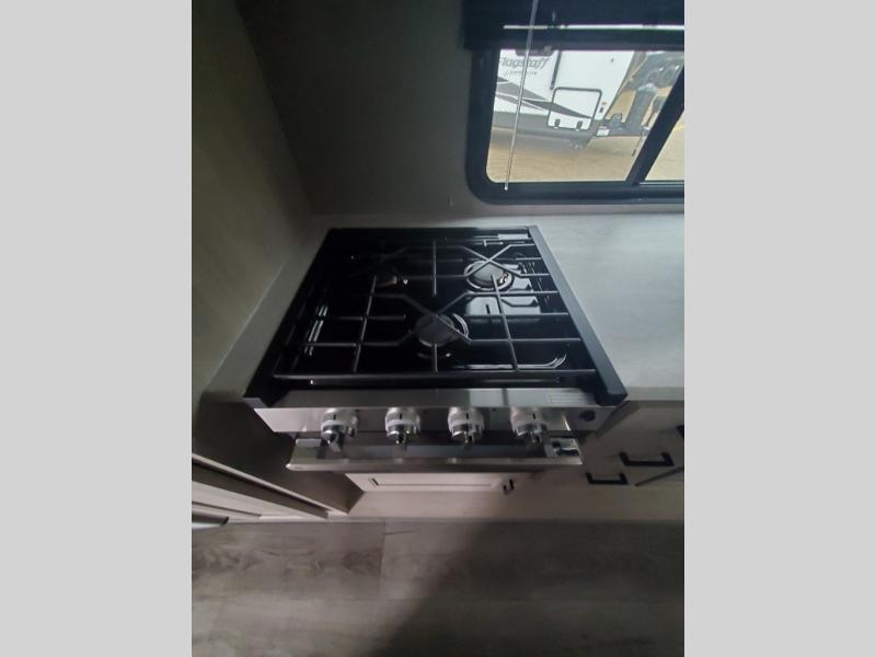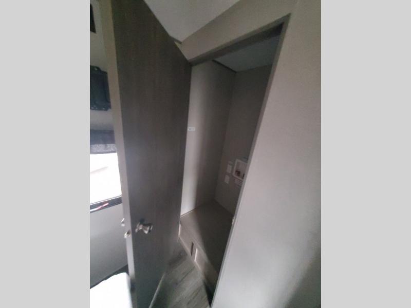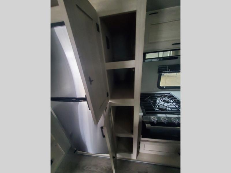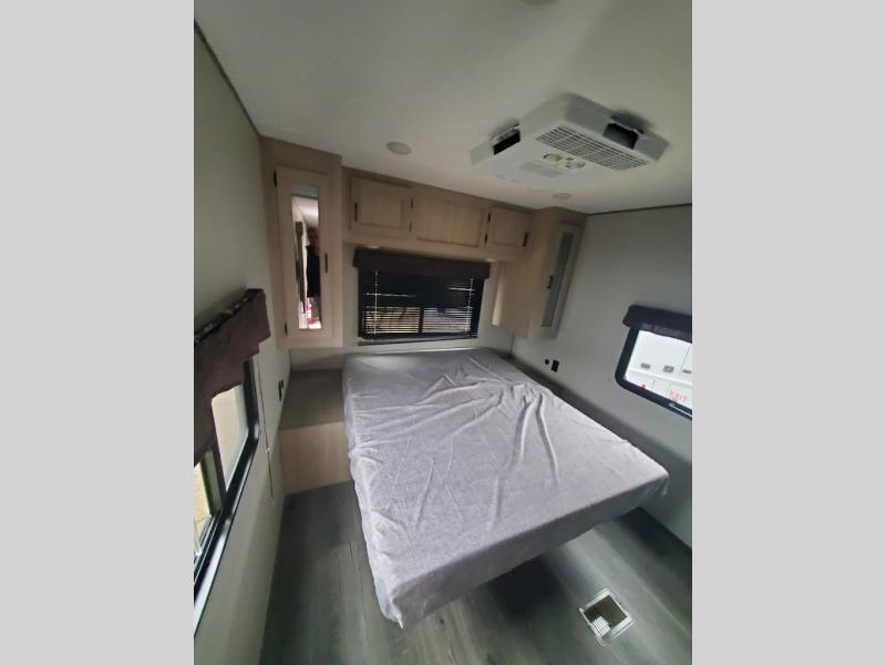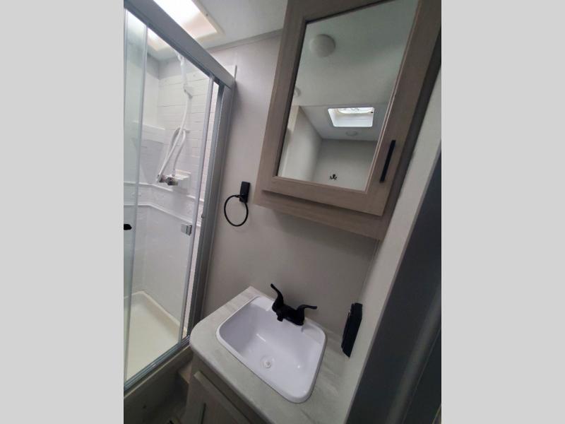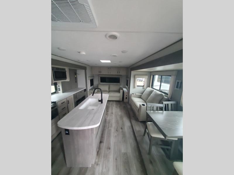 Summer camping trips just got sweeter in this spacious travel trailer that can sleep four to five each night. The dual opposing slides in the combined kitchen and living room will give your crew plenty of space to relax on the front sofa or the theater seating, and there is a booth dinette to dine at. There is even an optional fireplace if you want your space to feel a little more like home. A kitchen island with a double sink will make cooking and cleaning easier, and the bar area is sure to be a big hit when entertaining guests. The spacious full bath includes a 36" x 30" shower with a skylight and a convenient medicine cabinet to keep things tidy. When you're ready to turn in for the night, the rear bedroom with an RV queen bed is sure to bring a great night's rest. There are also dual wardrobes to keep your clothes organized and a closet with washer and dryer prep if you want the option to make laundry day easier.