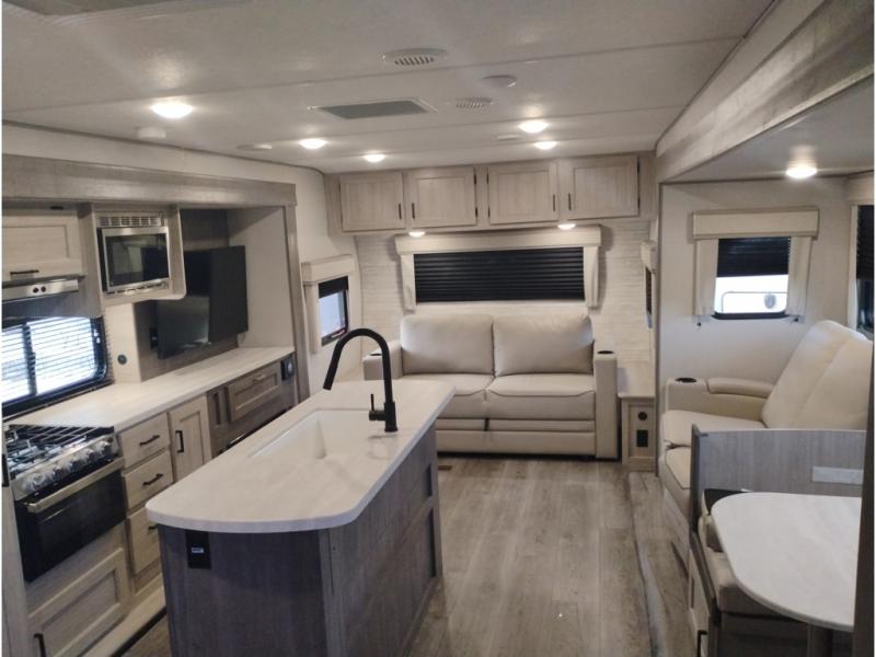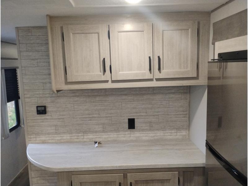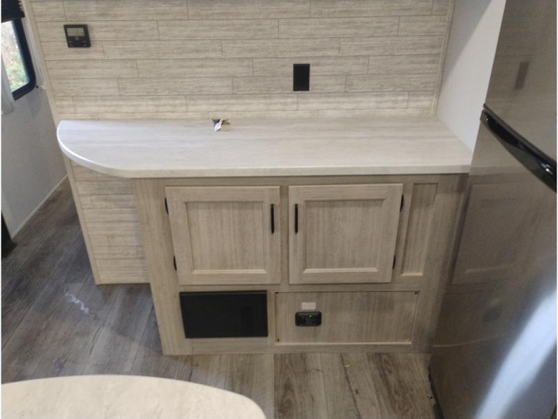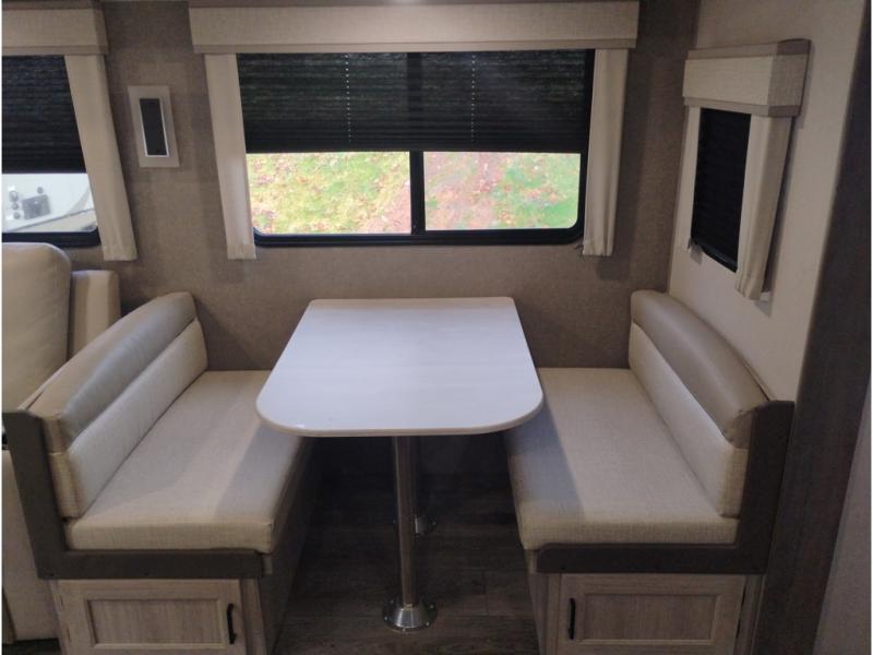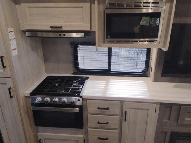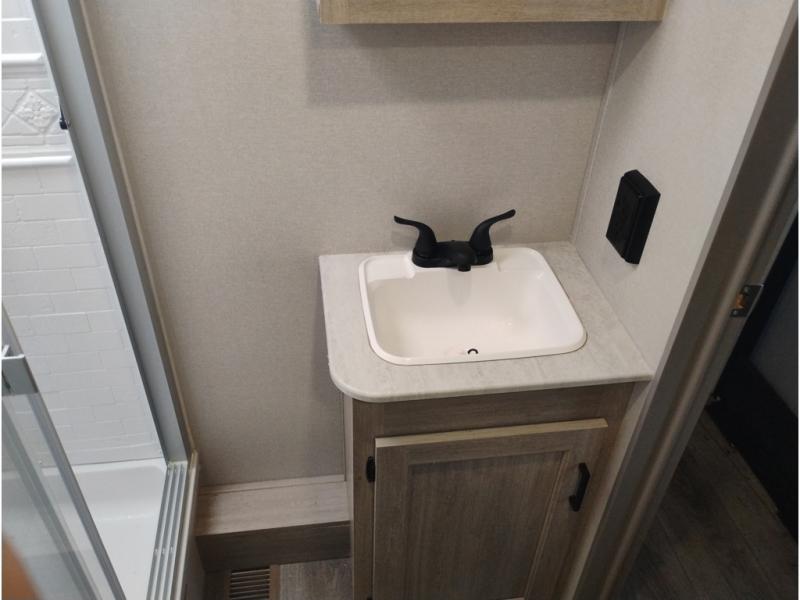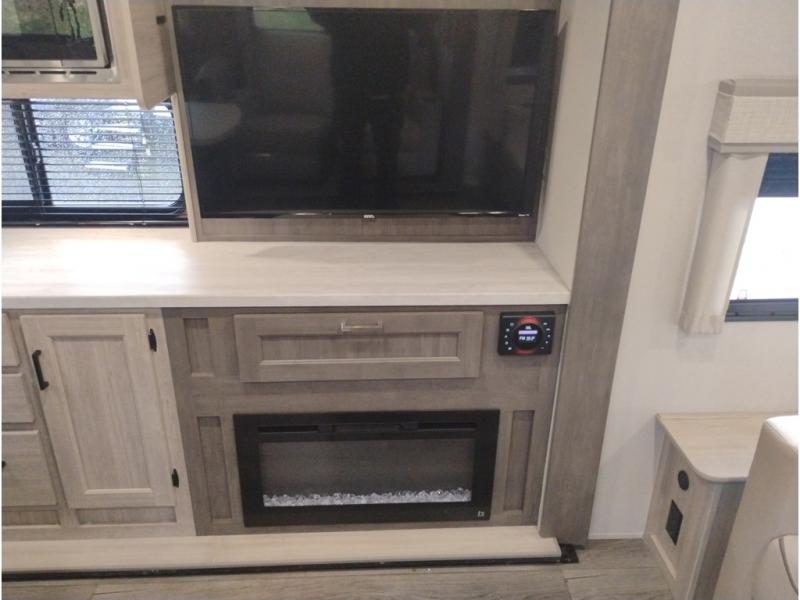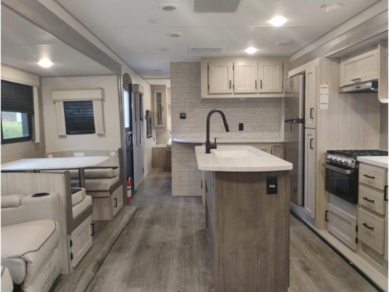 Summer camping trips just got sweeter in this spacious travel trailer that can sleep four to five each night. The dual opposing slides in the combined kitchen and living room will give your crew plenty of space to relax on the front sofa or the theater seating, and there is a booth dinette to dine at. There is even an optional fireplace if you want your space to feel a little more like home. A kitchen island with a double sink will make cooking and cleaning easier, and the bar area is sure to be a big hit when entertaining guests. The spacious full bath includes a 36" x 30" shower with a skylight and a convenient medicine cabinet to keep things tidy. When you're ready to turn in for the night, the rear bedroom with an RV queen bed is sure to bring a great night's rest. There are also dual wardrobes to keep your clothes organized and a closet with washer and dryer prep if you want the option to make laundry day easier.