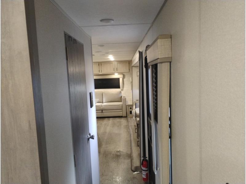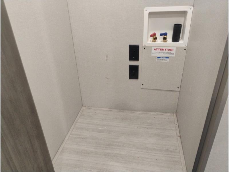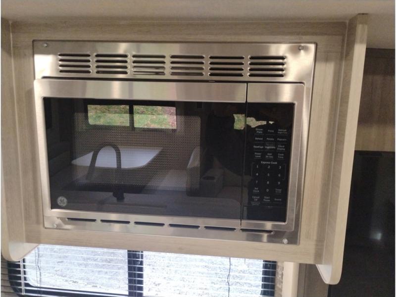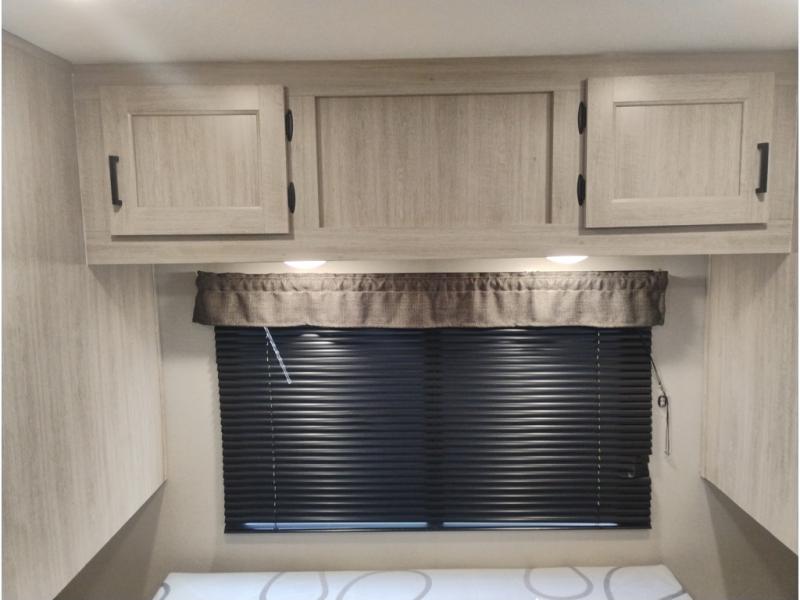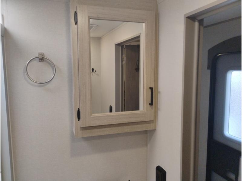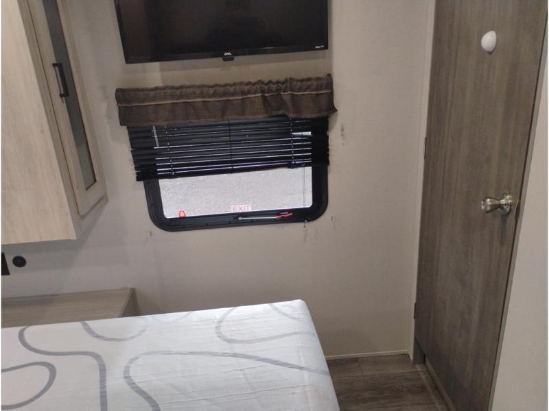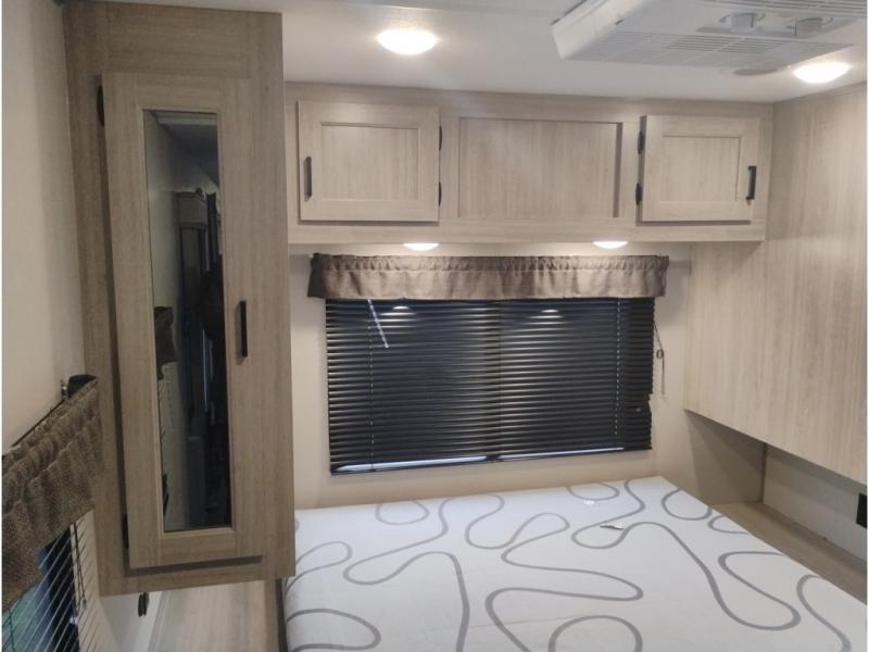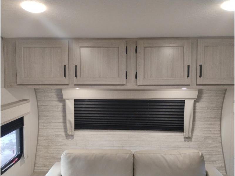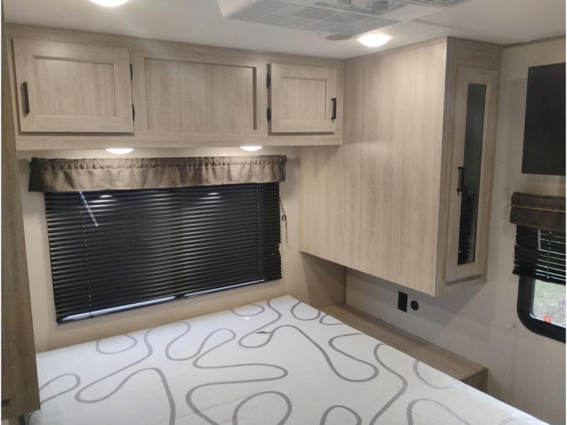 Summer camping trips just got sweeter in this spacious travel trailer that can sleep four to five each night. The dual opposing slides in the combined kitchen and living room will give your crew plenty of space to relax on the front sofa or the theater seating, and there is a booth dinette to dine at. There is even an optional fireplace if you want your space to feel a little more like home. A kitchen island with a double sink will make cooking and cleaning easier, and the bar area is sure to be a big hit when entertaining guests. The spacious full bath includes a 36" x 30" shower with a skylight and a convenient medicine cabinet to keep things tidy. When you're ready to turn in for the night, the rear bedroom with an RV queen bed is sure to bring a great night's rest. There are also dual wardrobes to keep your clothes organized and a closet with washer and dryer prep if you want the option to make laundry day easier.