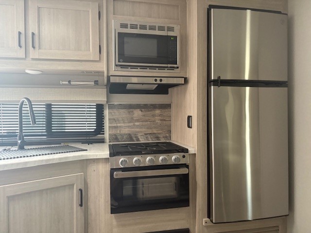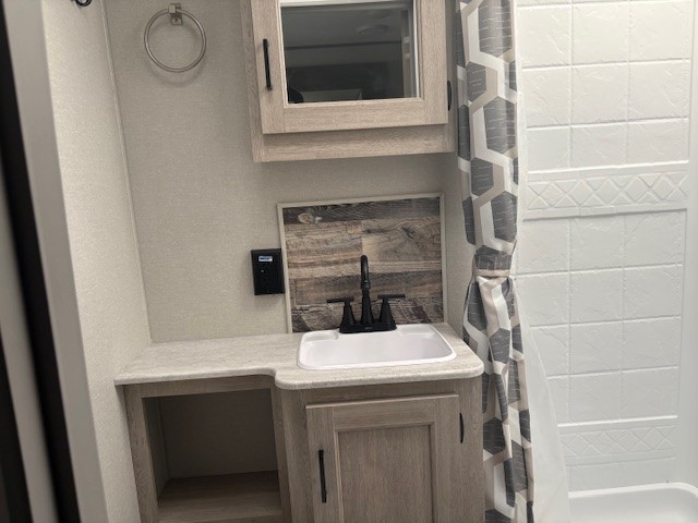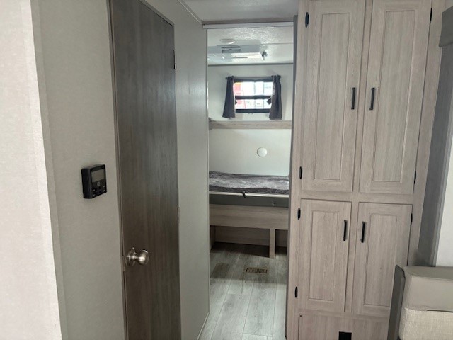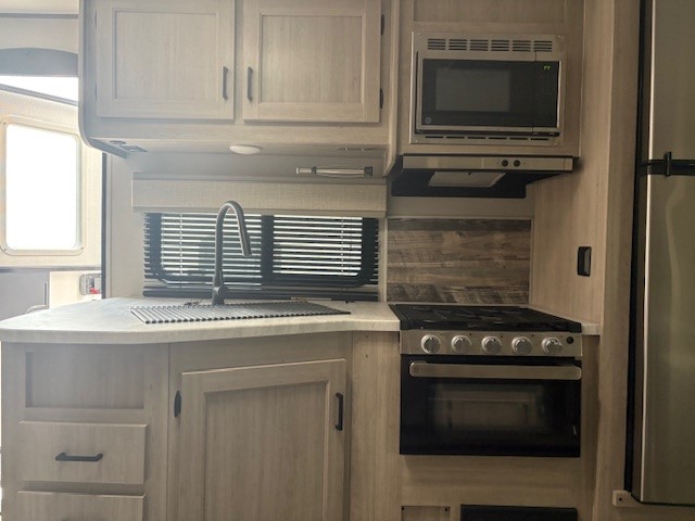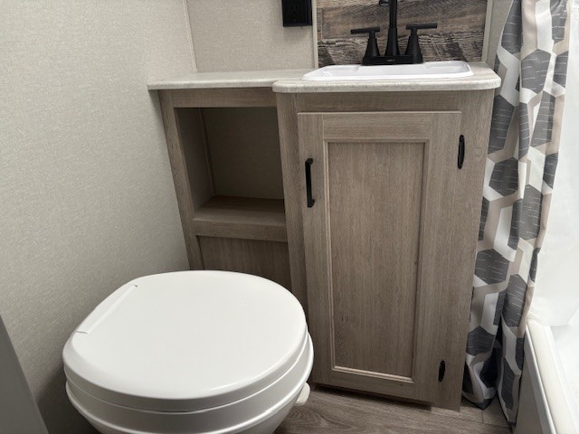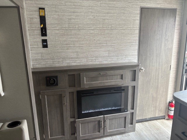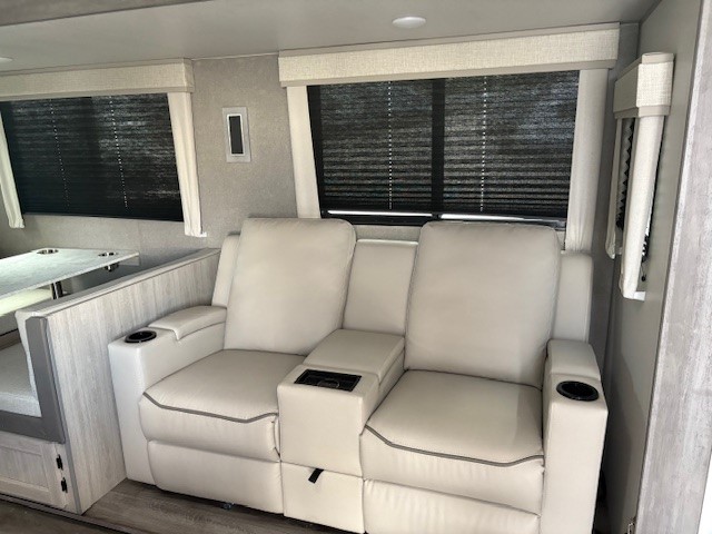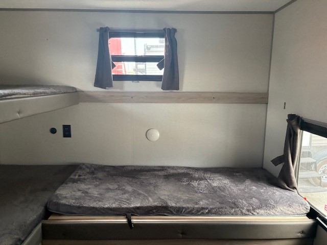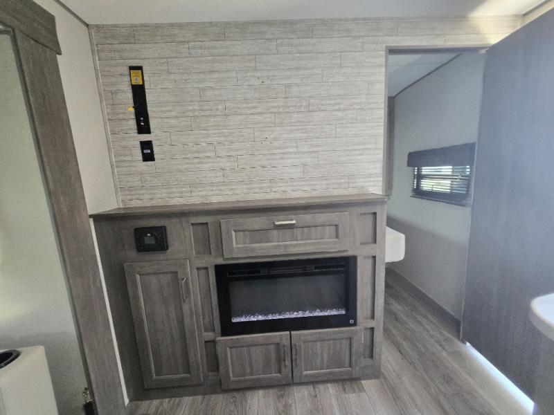 Not only will you be comfortable in this trailer, your friends will have comfort and privacy thanks to having their own bunkhouse, and you'll have a front bedroom where you can sleep like royalty! There are three bunk beds and two COA cube seats plus a location for a TV, a wardrobe, and windows for natural lighting. The combined living and kitchen is spacious thanks to the slide out U-shaped dinette and sofa with drink holders. You can even add the fireplace option if you want that feature. The cook will have full amenities to whip up meals including overhead cabinets for dishes and snacks. And the exterior camper kitchen allows the cook to visit with everyone outside under the 18' electric awning that includes multicolor LED lights with a remote.