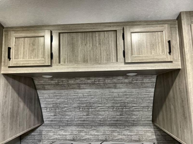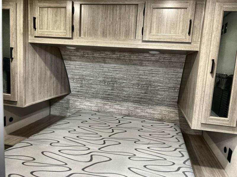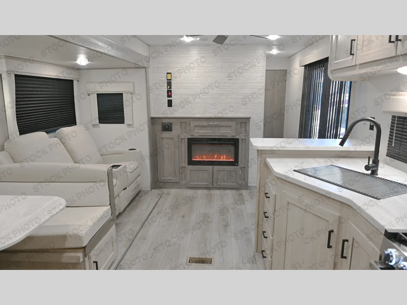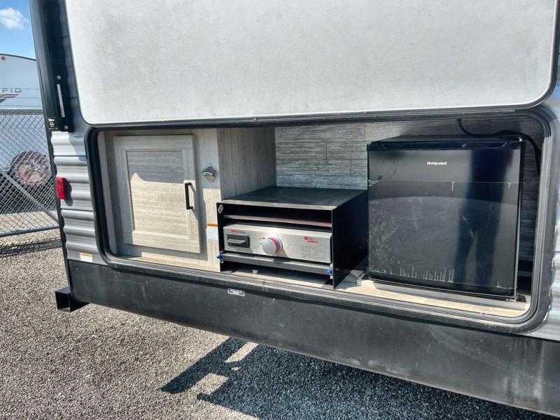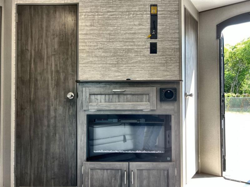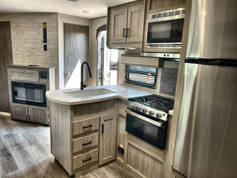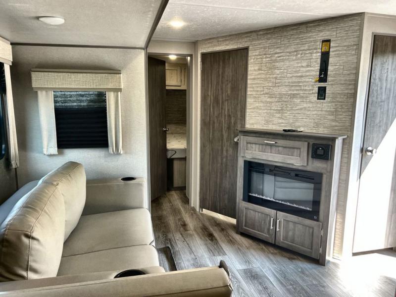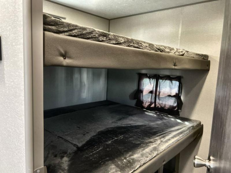 Not only will you be comfortable in this trailer, your friends will have comfort and privacy thanks to having their own bunkhouse, and you'll have a front bedroom where you can sleep like royalty! There are three bunk beds and two COA cube seats plus a location for a TV, a wardrobe, and windows for natural lighting. The combined living and kitchen is spacious thanks to the slide out U-shaped dinette and sofa with drink holders. You can even add the fireplace option if you want that feature. The cook will have full amenities to whip up meals including overhead cabinets for dishes and snacks. And the exterior camper kitchen allows the cook to visit with everyone outside under the 18' electric awning that includes multicolor LED lights with a remote.