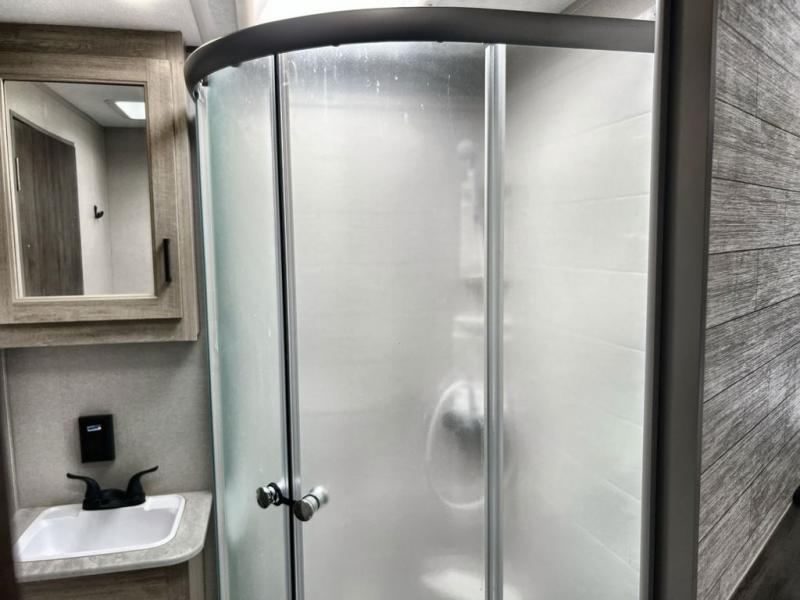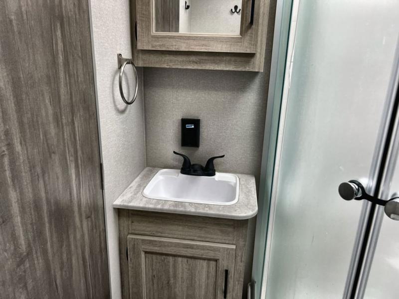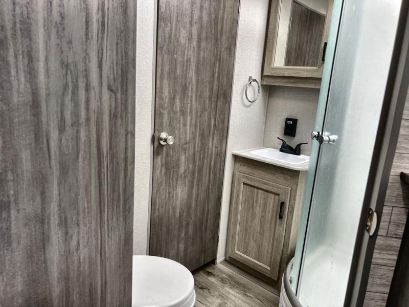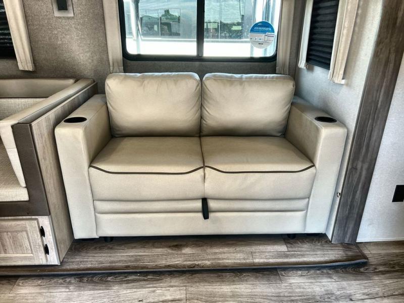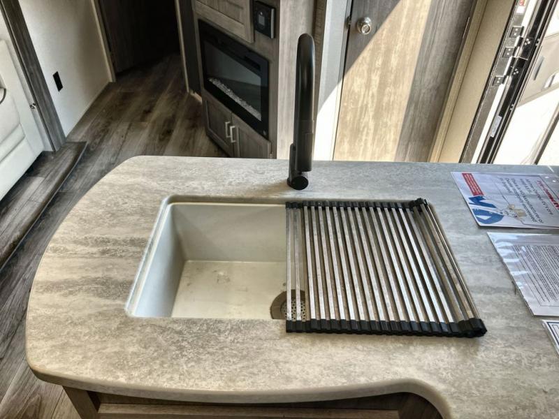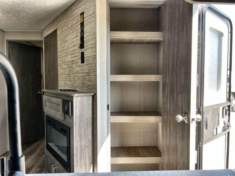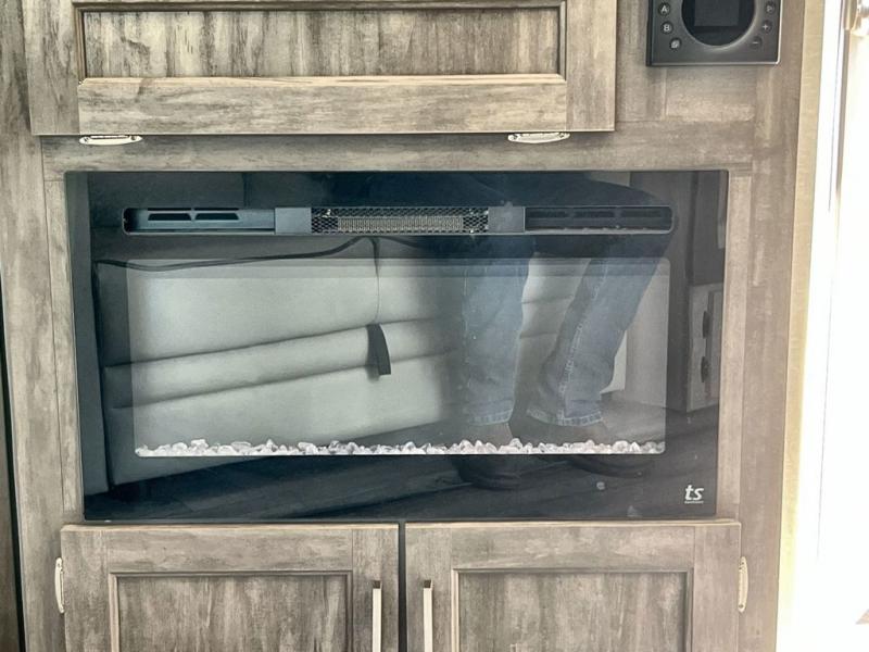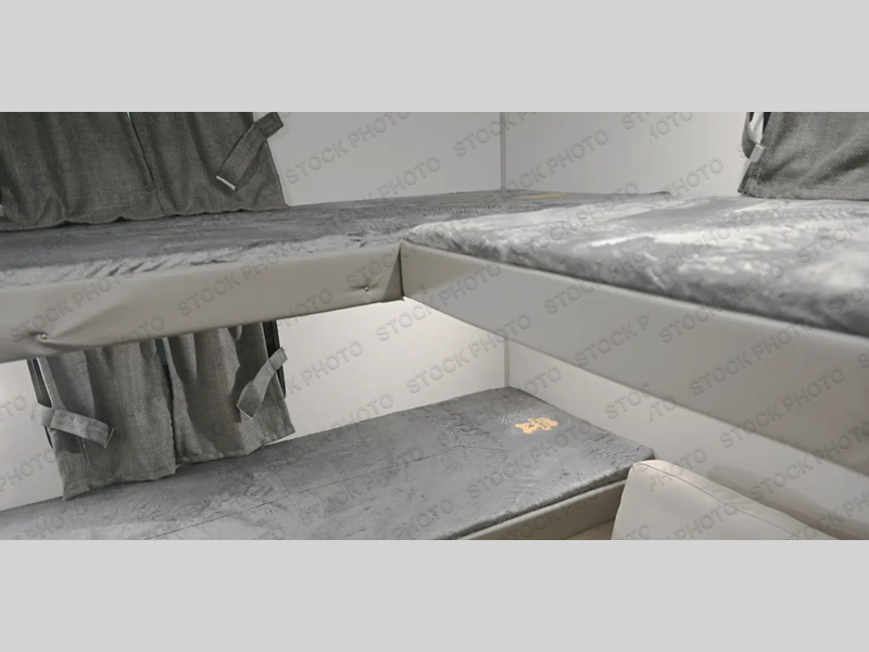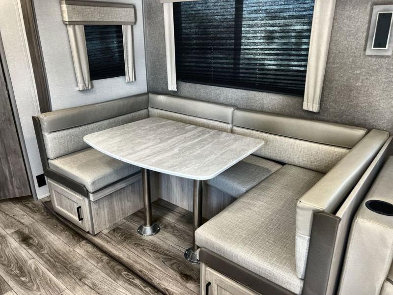 Not only will you be comfortable in this trailer, your friends will have comfort and privacy thanks to having their own bunkhouse, and you'll have a front bedroom where you can sleep like royalty! There are three bunk beds and two COA cube seats plus a location for a TV, a wardrobe, and windows for natural lighting. The combined living and kitchen is spacious thanks to the slide out U-shaped dinette and sofa with drink holders. You can even add the fireplace option if you want that feature. The cook will have full amenities to whip up meals including overhead cabinets for dishes and snacks. And the exterior camper kitchen allows the cook to visit with everyone outside under the 18' electric awning that includes multicolor LED lights with a remote.