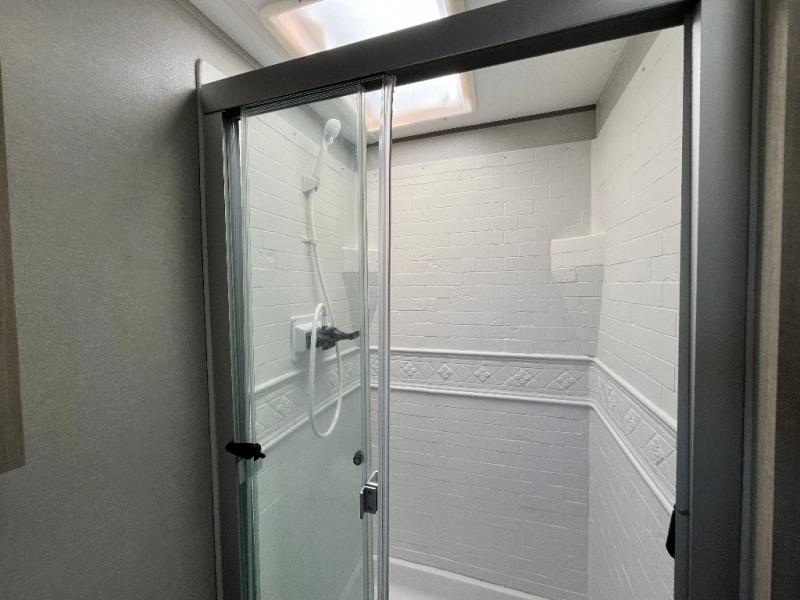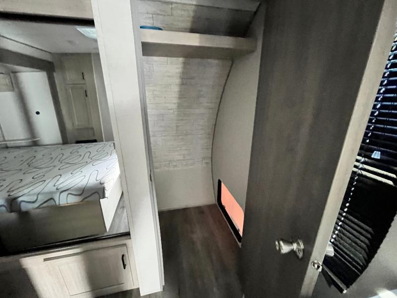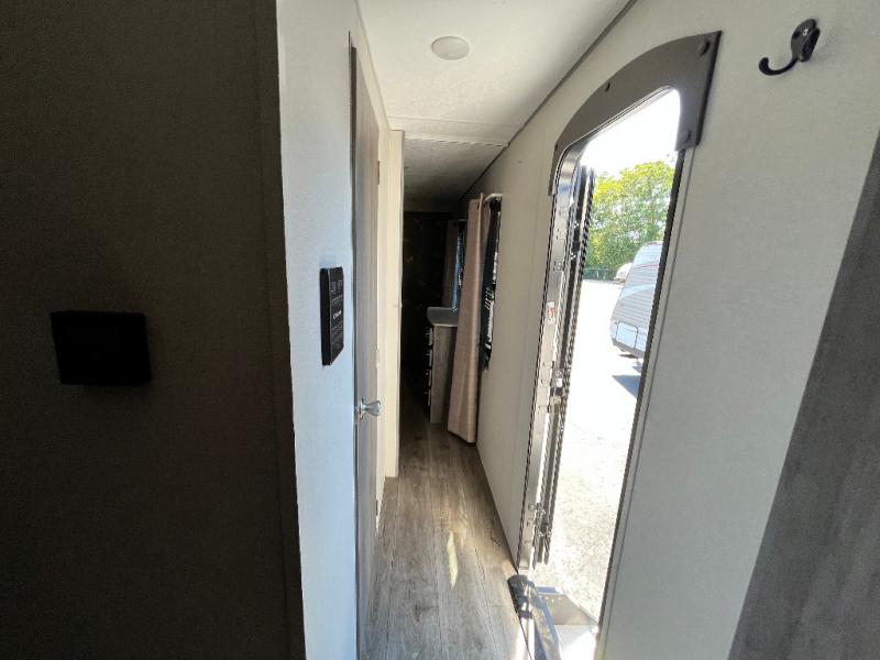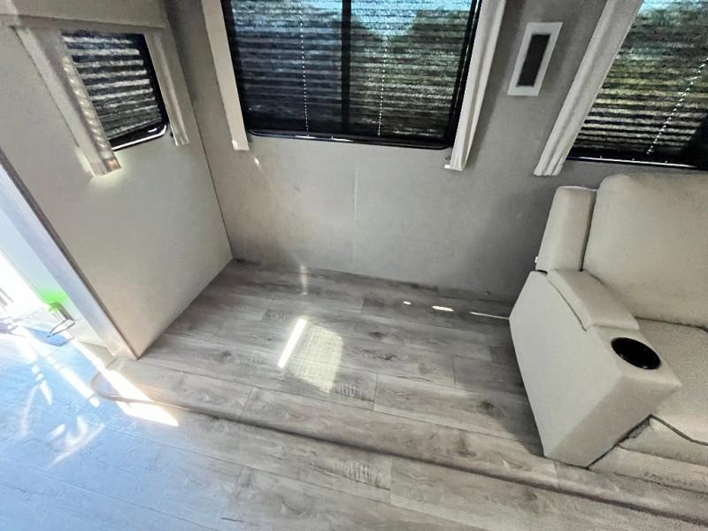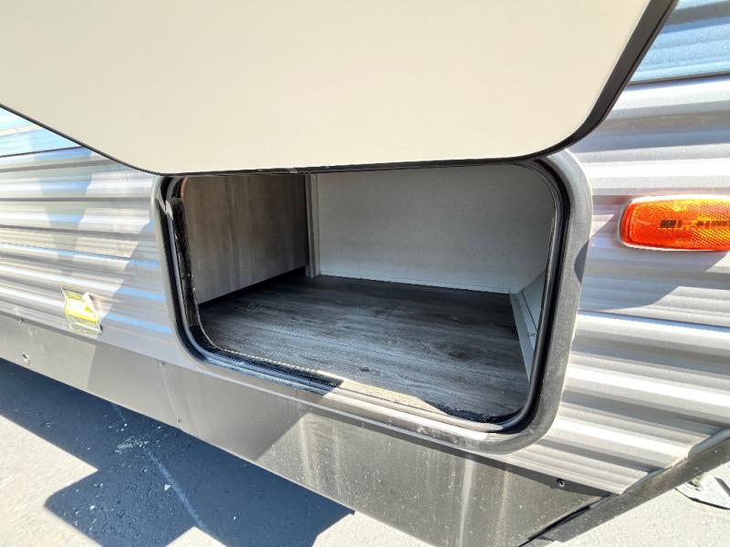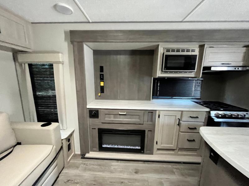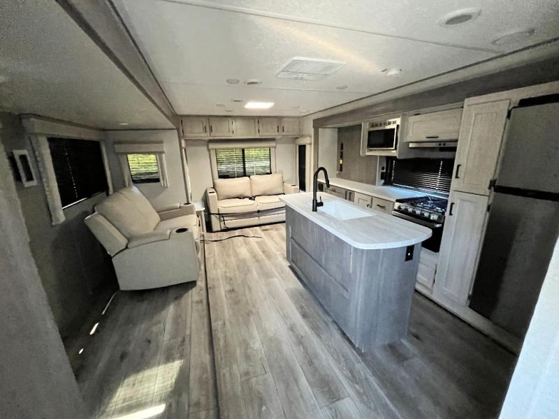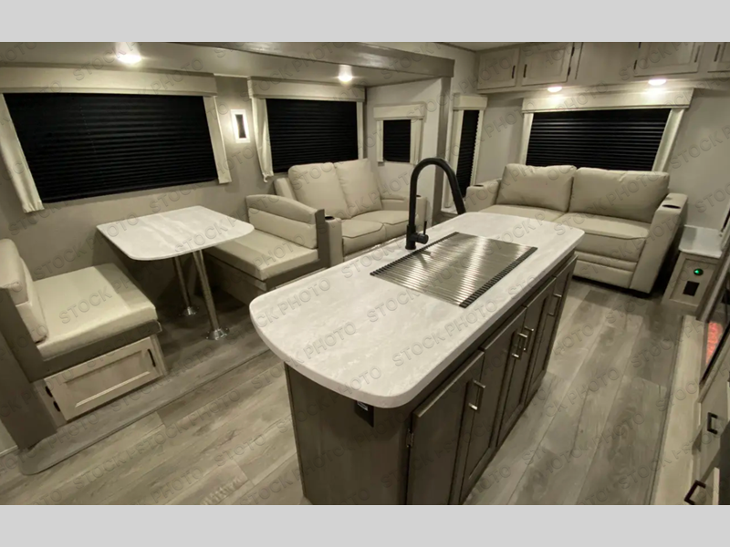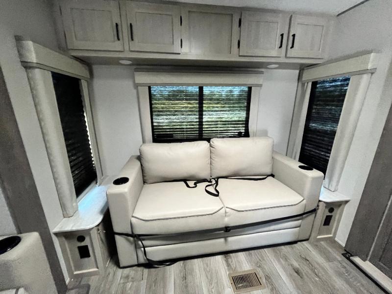 It's not hard to find comfort in this travel trailer with its triple slides, two lounge chairs, and spacious full bath. Once your crew is settled and unpacked, head outdoors to relax under the two power awnings with multicolored LED lights, or grab the fishing poles from the exterior storage and head to the water. If you'd rather spend your day inside you'll find all the comforts of home; dual lounge chairs, a sofa and booth dinette, plus a fully equipped kitchen, complete with a kitchen island! You will love having your own space in the front bedroom that includes a queen bed slide out, a dresser, plus two closets. There is even washer and dryer prep if you plan to go full-time!