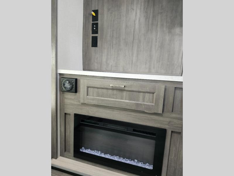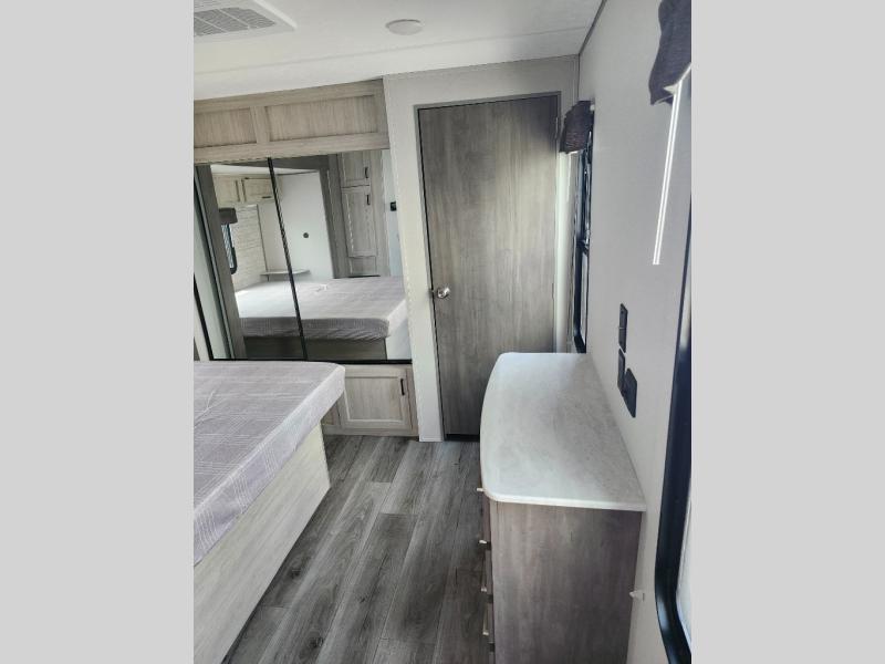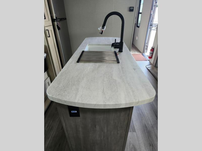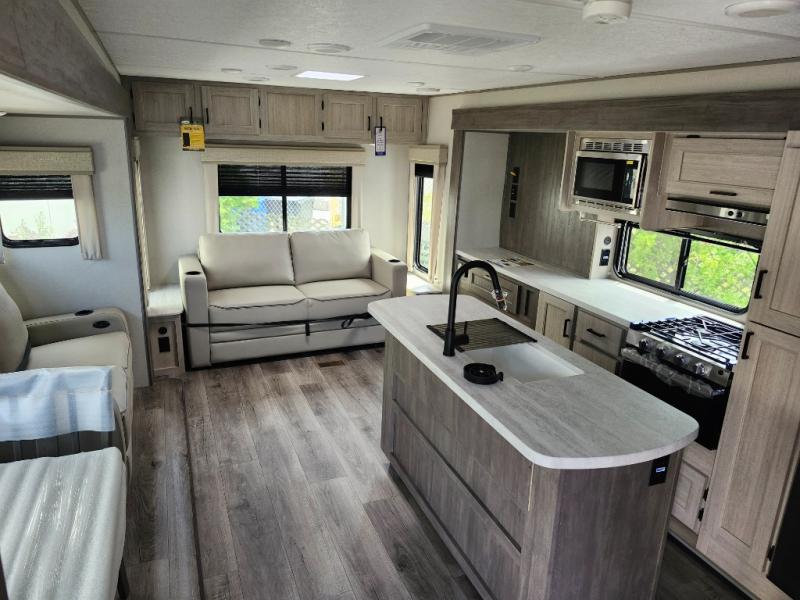 It's not hard to find comfort in this travel trailer with its triple slides, two lounge chairs, and spacious full bath. Once your crew is settled and unpacked, head outdoors to relax under the two power awnings with multicolored LED lights, or grab the fishing poles from the exterior storage and head to the water. If you'd rather spend your day inside you'll find all the comforts of home; dual lounge chairs, a sofa and booth dinette, plus a fully equipped kitchen, complete with a kitchen island! You will love having your own space in the front bedroom that includes a queen bed slide out, a dresser, plus two closets. There is even washer and dryer prep if you plan to go full-time!