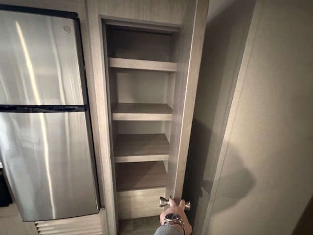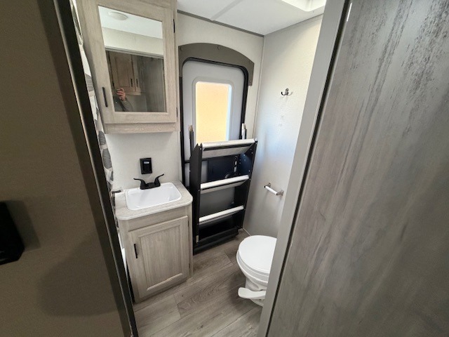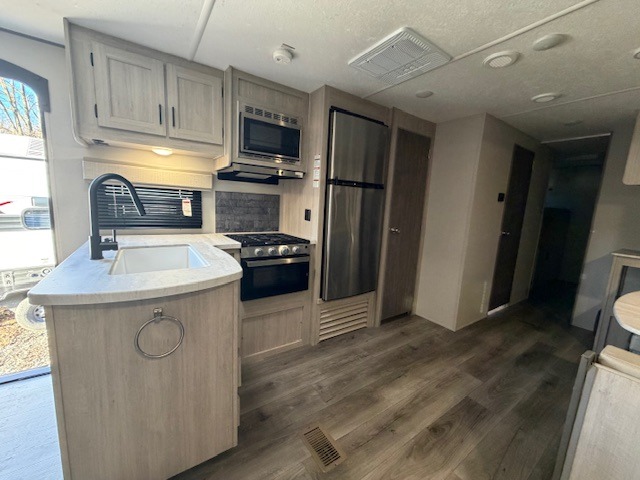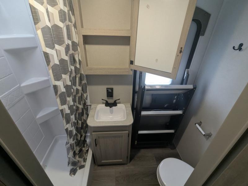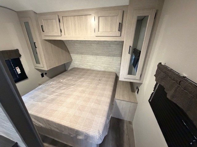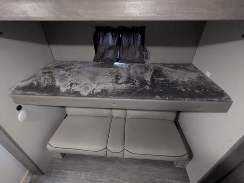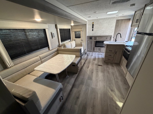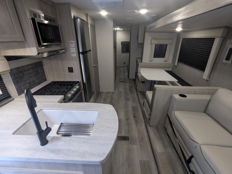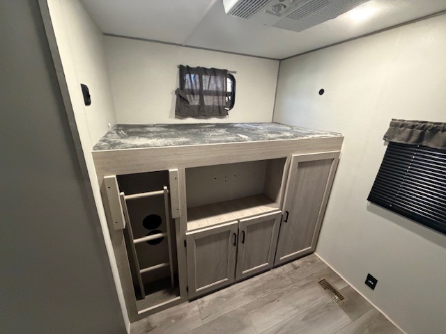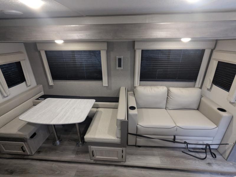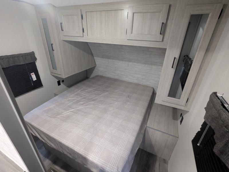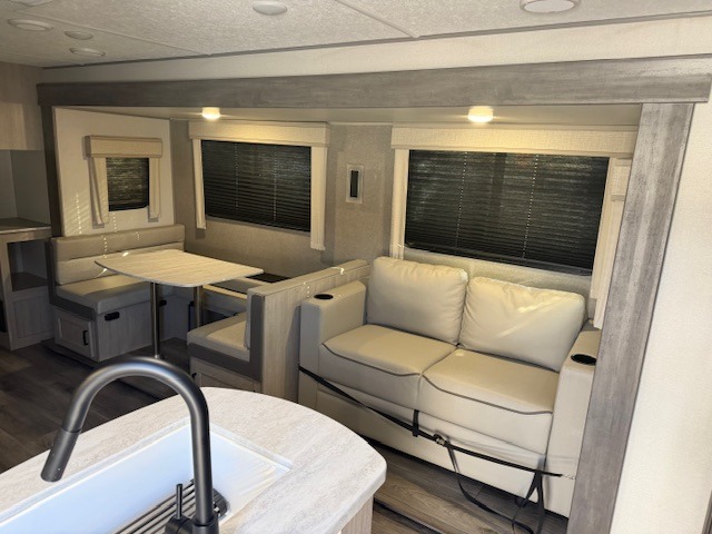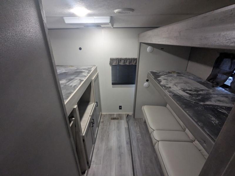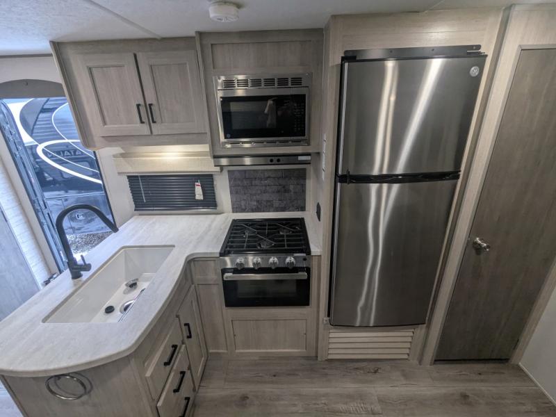 When you enjoy hiking, biking, and fishing, and waking up to beautiful scenery from your own comforts, then start camping with this trailer at the campsite! You will be able to sleep like a queen on the walk-around bed with dual wardrobes and overhead storage for more items in the front private bedroom while your family or friends have their own privacy in the bunkhouse complete with two bunks, two COA cube futons and plenty of storage. The full bathroom includes the second entry/exit door for convenience when outside under the 21' electric awning with multicolor LED lights, or while cooking using the full size camper kitchen along the exterior. There are full kitchen amenities inside including a 10 cu. ft. refrigerator and a pantry.