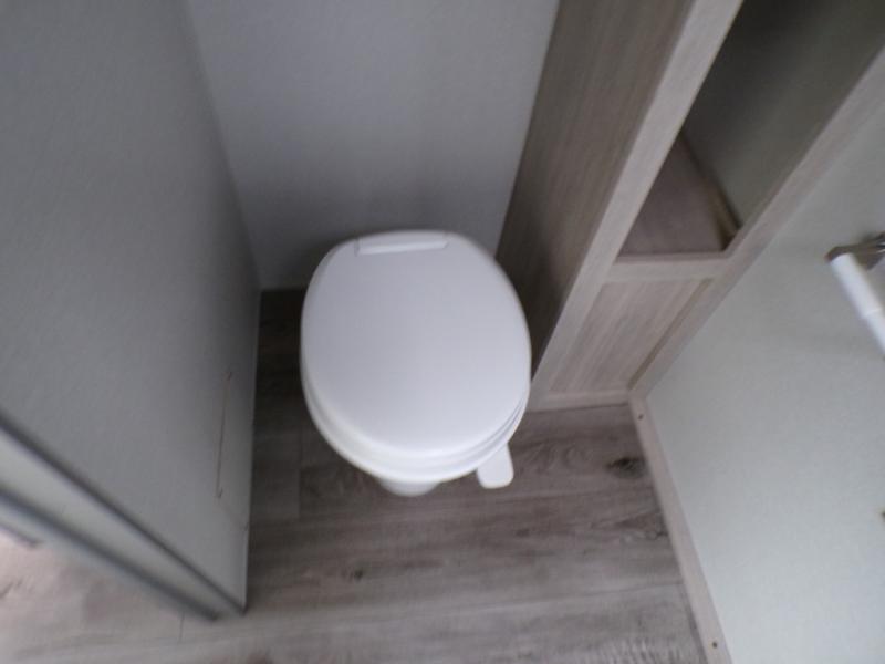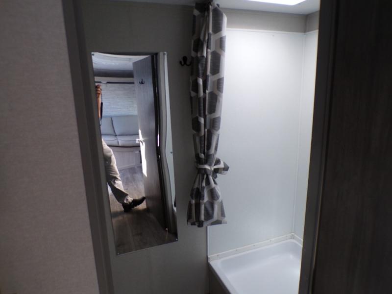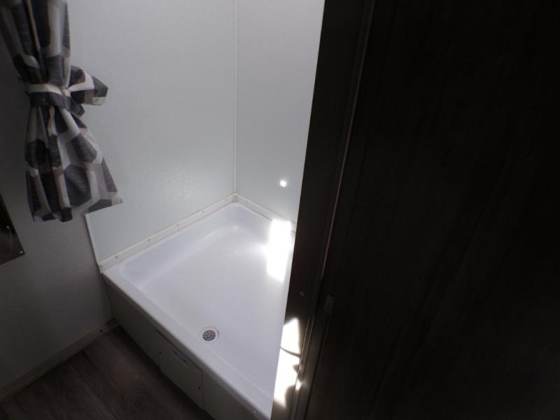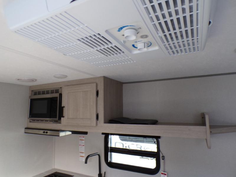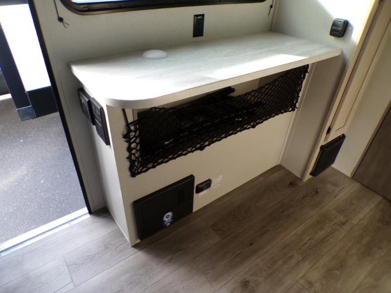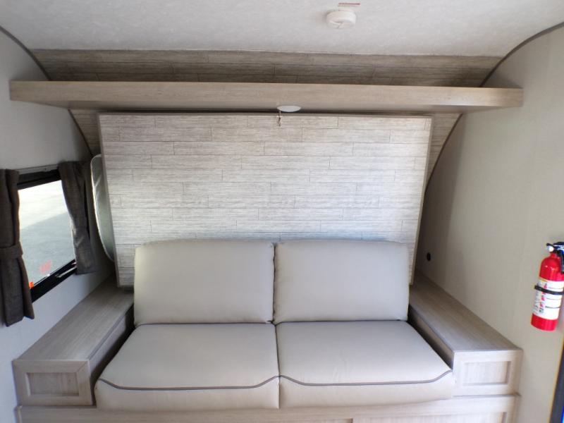 This couple's trailer will be perfect for all your outdoor adventures! There is a 60" x 74" Murphy bed up front with dual nightstands to keep your things tidy, and in the morning, you can fold up the bed to relax on the sofa. The bar top with two stools also includes storage below, plus there is a pantry and overhead storage for even more storage space. A full rear bath includes a 36" x 30" shower, a 12V 14" bath power vent fan, a marine toilet with foot flush, plus a linen closet to keep clean towels close by. This model also includes full kitchen amenities, including a GE two burner cooktop, a GE stainless microwave oven, plus a 3.3 cu. ft. 12V refrigerator to keep food fresh!
