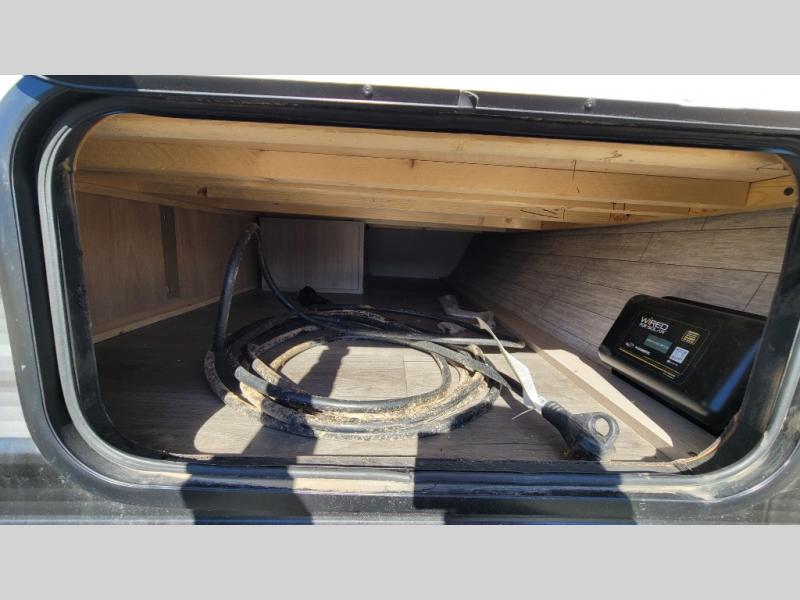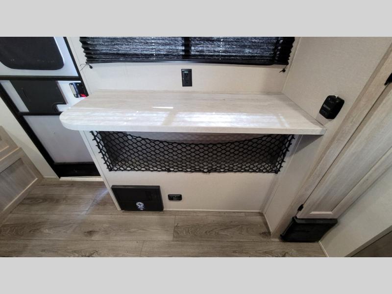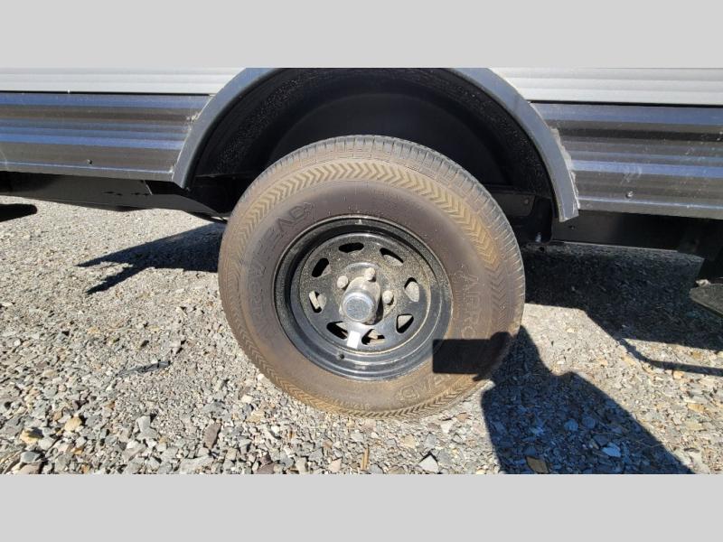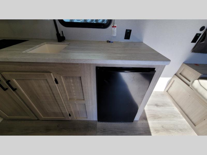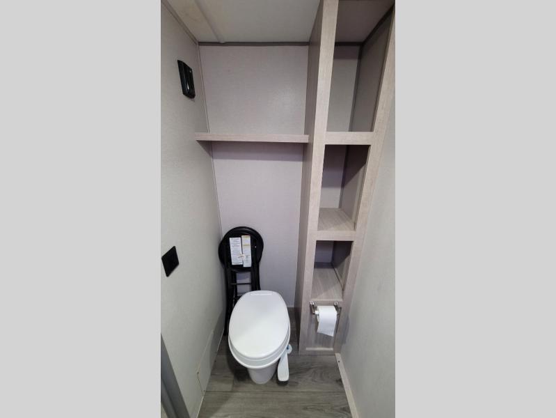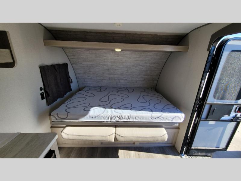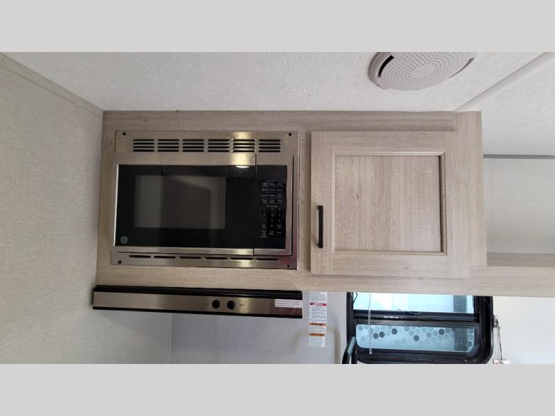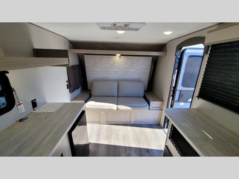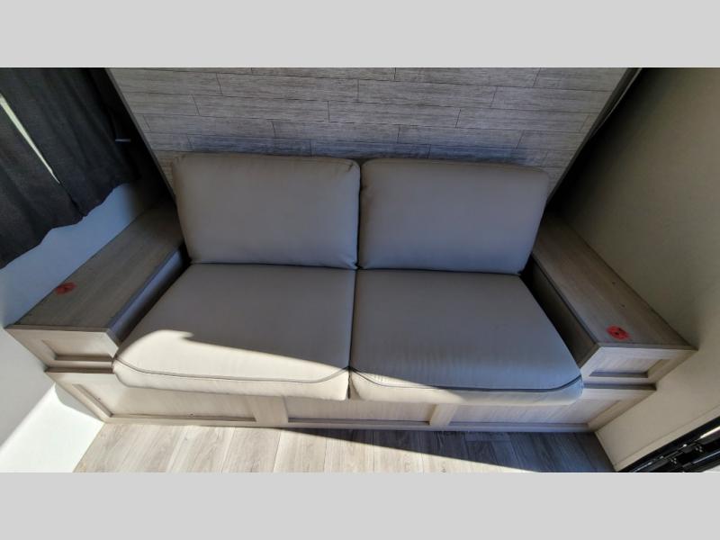 This couple's trailer will be perfect for all your outdoor adventures! There is a 60" x 74" Murphy bed up front with dual nightstands to keep your things tidy, and in the morning, you can fold up the bed to relax on the sofa. The bar top with two stools also includes storage below, plus there is a pantry and overhead storage for even more storage space. A full rear bath includes a 36" x 30" shower, a 12V 14" bath power vent fan, a marine toilet with foot flush, plus a linen closet to keep clean towels close by. This model also includes full kitchen amenities, including a GE two burner cooktop, a GE stainless microwave oven, plus a 3.3 cu. ft. 12V refrigerator to keep food fresh!