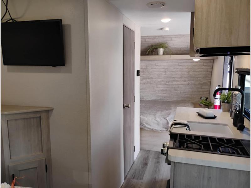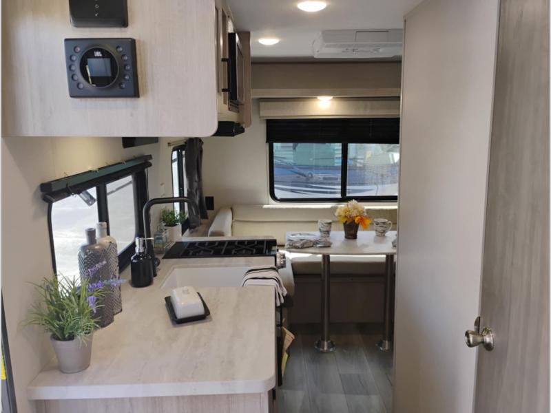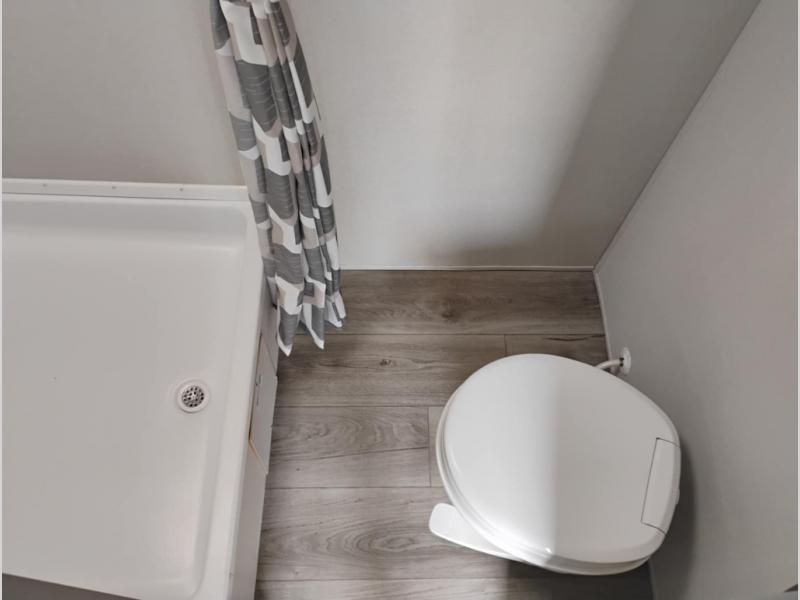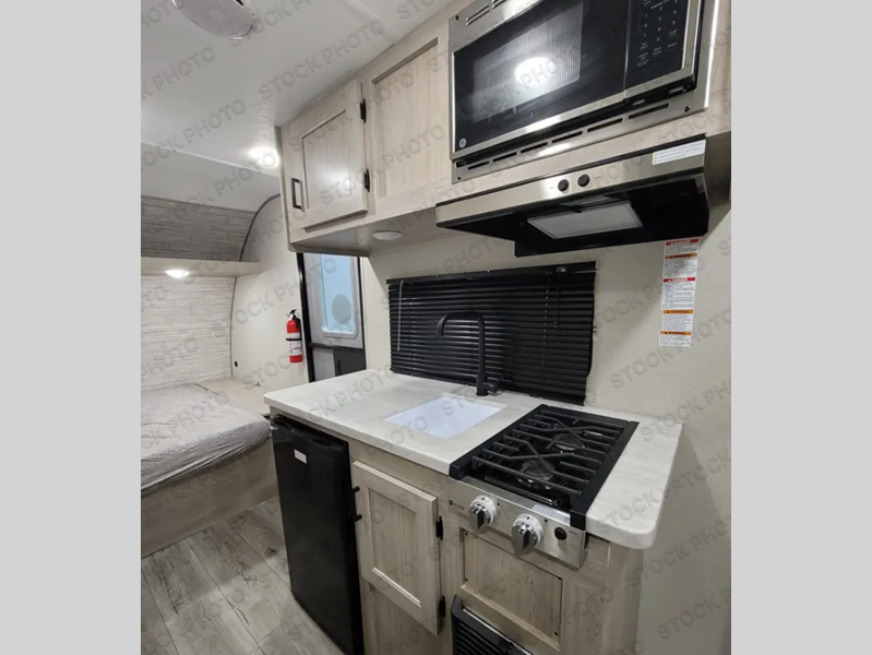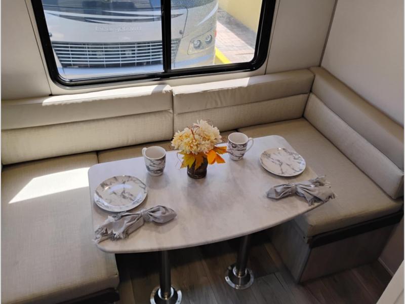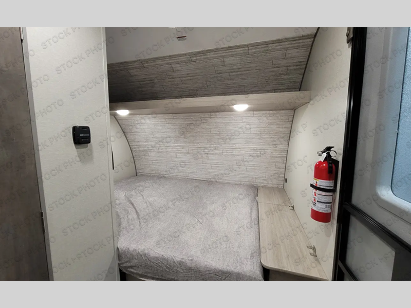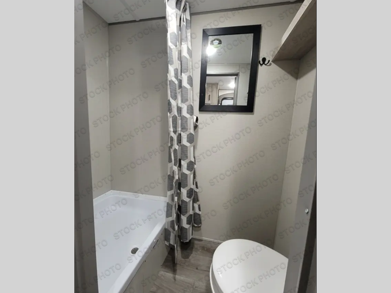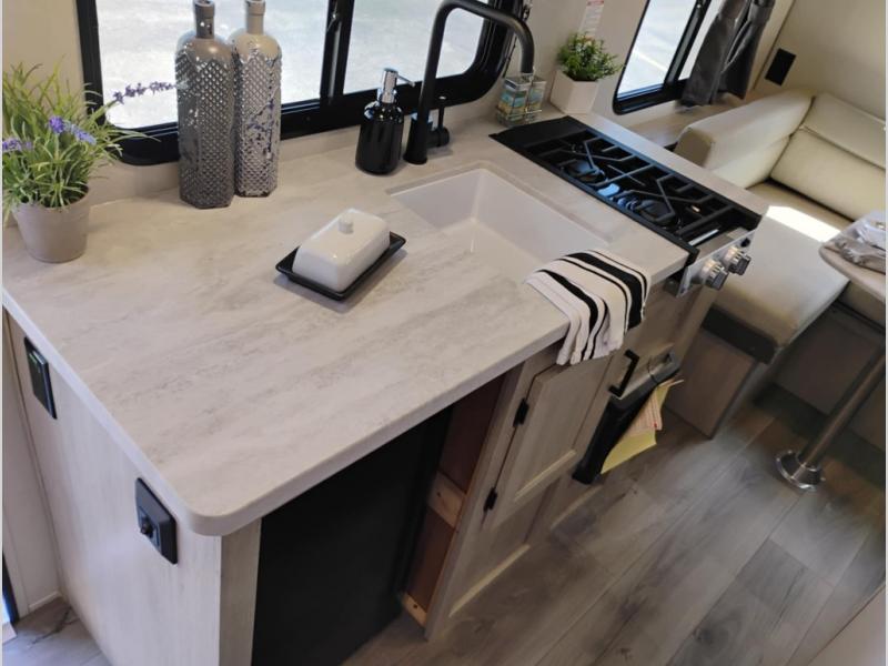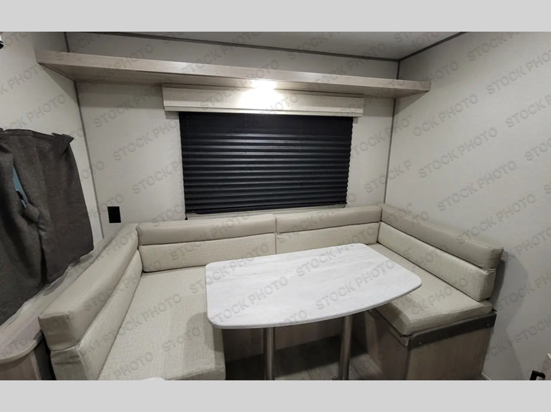 The perfect unit for a cozy weekend retreat for two or three! There is a queen bed up front with overhead storage and more at the foot of the bed to keep your things tidy. The rear of the unit offers a U-shaped dinette with an end table on one end and a handy overhead shelf which is a great spot for meals, watching TV or playing cards and games. A mid-coach bath includes a 36" x 30" shower and toilet with foot flush, plus a storage shelf for necessities. This model also includes a GE two burner cooktop, a GE stainless microwave oven, plus a 3.3 cu. ft. 12V refrigerator to keep food fresh!