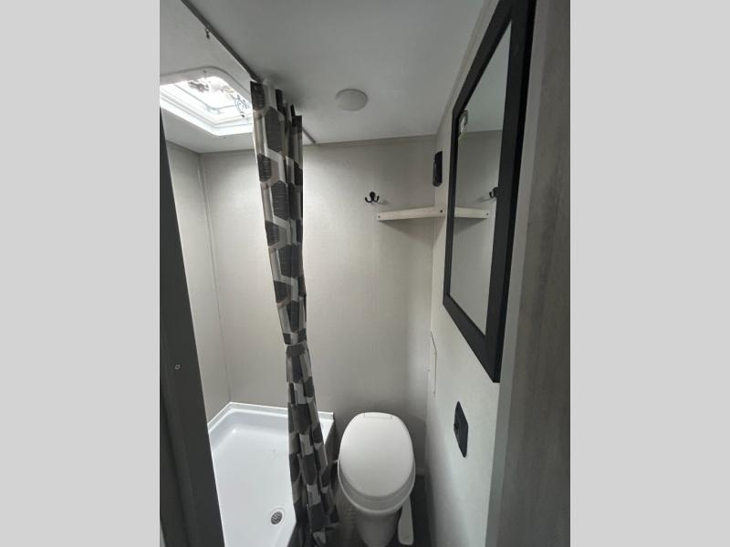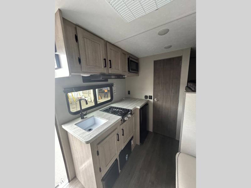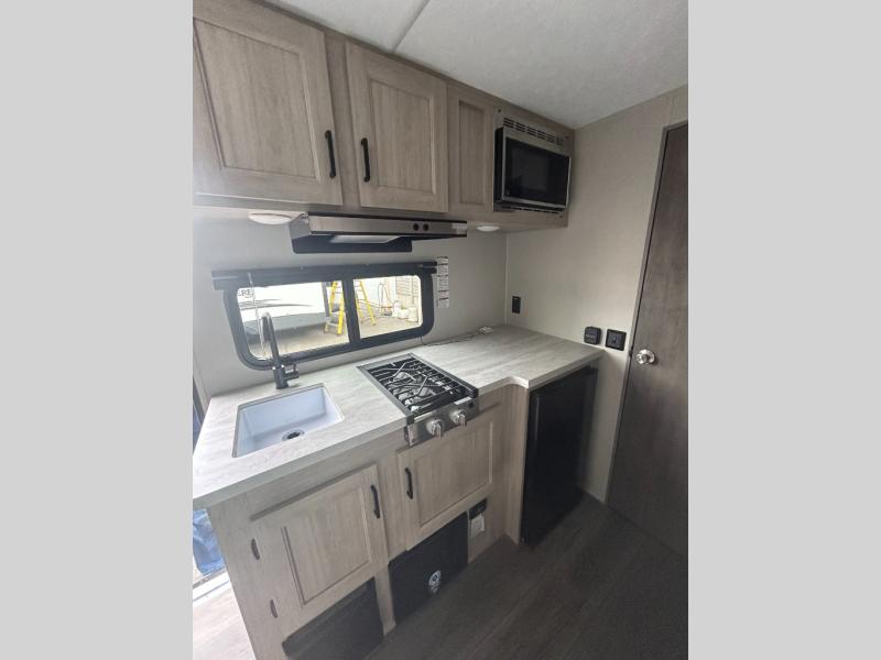 This travel trailers is perfect for a young family or smaller group. You can easily sleep four or more with the rear set of bunk beds and queen bed up front. There is also a 60" sofa for inside down-time, as well as complete kitchen and bath amenities so you can cook and stay clean while traveling. The rear corner bath features a toilet and 36" x 30" shower, and it's conveniently located next to the bunk beds which is great for little ones at night. Cooking inside will be easy with a GE stainless two-burner cooktop and single sink, plus there is also a GE microwave oven for snacks and things that you can easily warm up. If you plan to spend most of your time outdoors, you will find plenty of storage space in the front exterior storage compartment, and there is also plenty of storage inside as well.