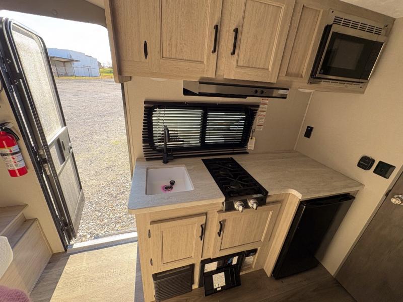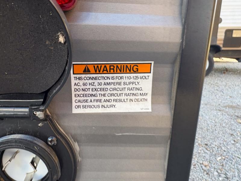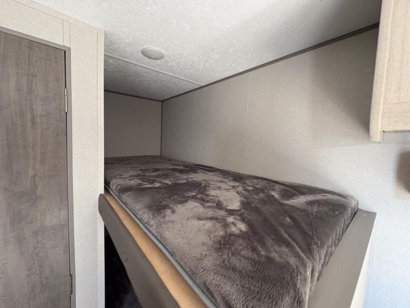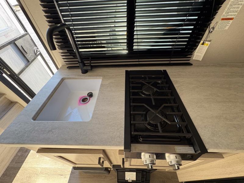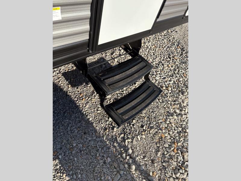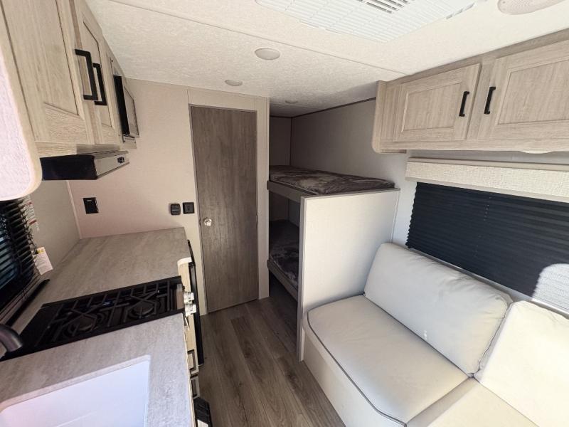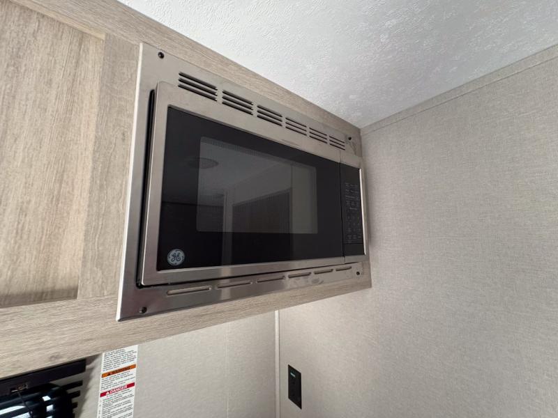 This travel trailers is perfect for a young family or smaller group. You can easily sleep four or more with the rear set of bunk beds and queen bed up front. There is also a 60" sofa for inside down-time, as well as complete kitchen and bath amenities so you can cook and stay clean while traveling. The rear corner bath features a toilet and 36" x 30" shower, and it's conveniently located next to the bunk beds which is great for little ones at night. Cooking inside will be easy with a GE stainless two-burner cooktop and single sink, plus there is also a GE microwave oven for snacks and things that you can easily warm up. If you plan to spend most of your time outdoors, you will find plenty of storage space in the front exterior storage compartment, and there is also plenty of storage inside as well.