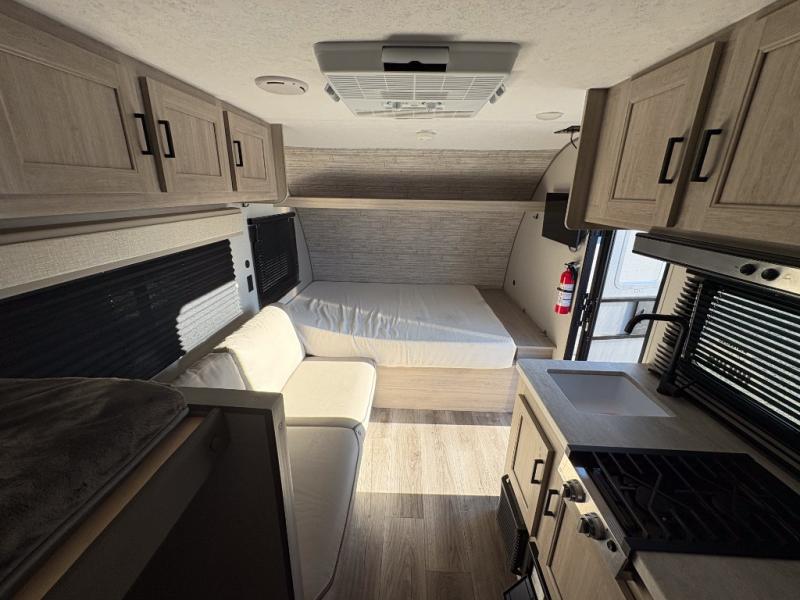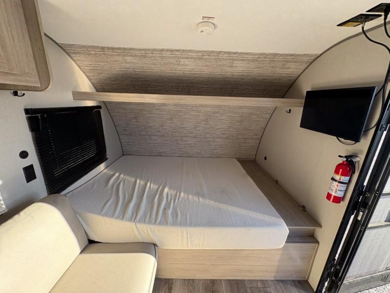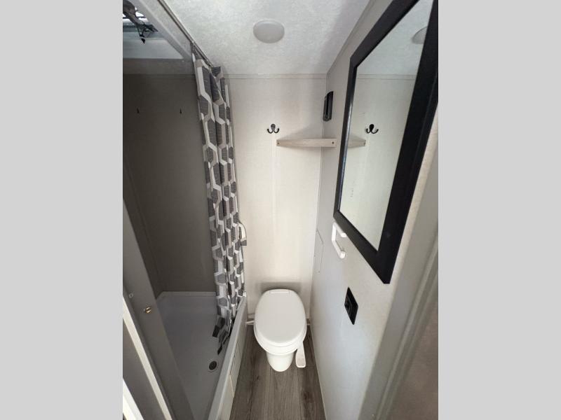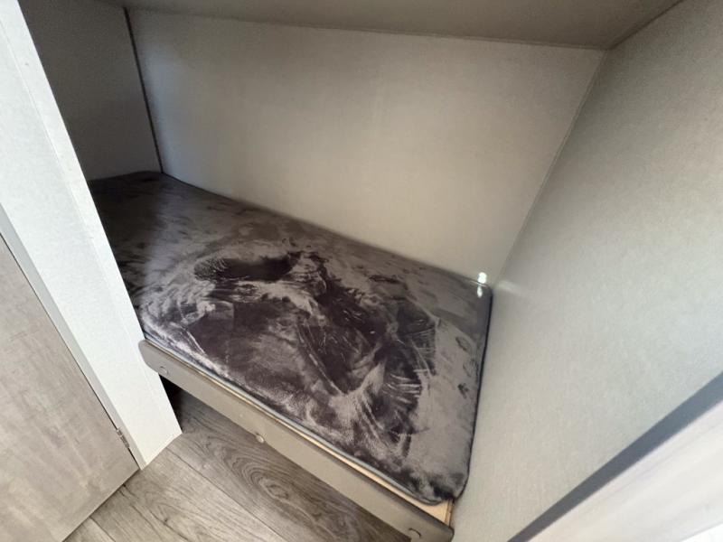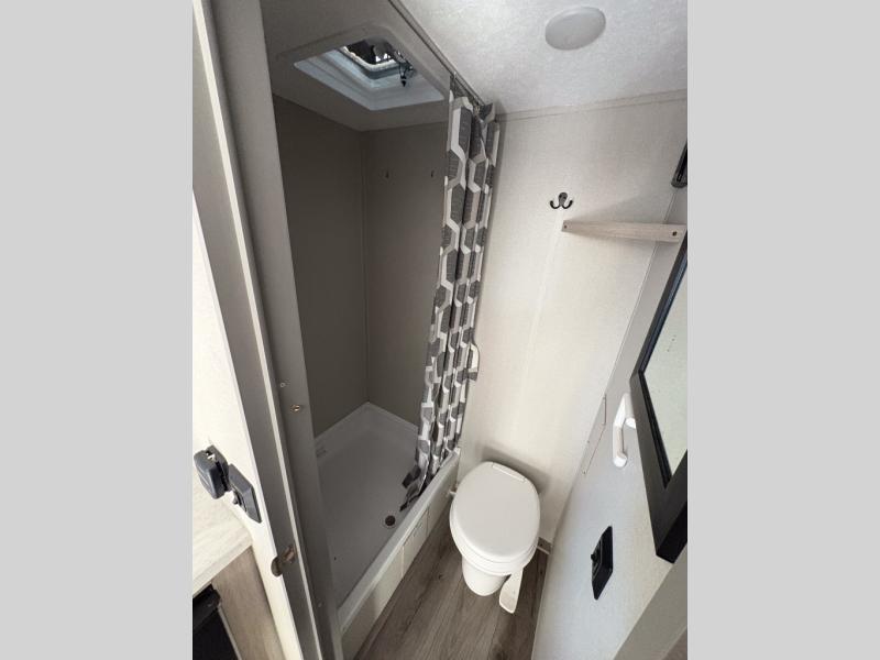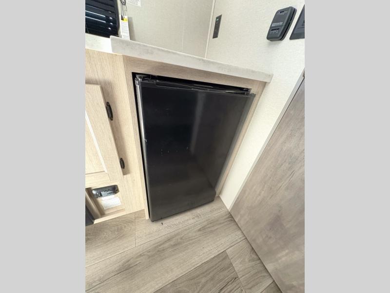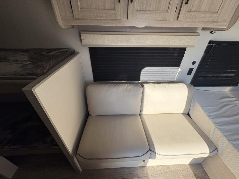 This travel trailers is perfect for a young family or smaller group. You can easily sleep four or more with the rear set of bunk beds and queen bed up front. There is also a 60" sofa for inside down-time, as well as complete kitchen and bath amenities so you can cook and stay clean while traveling. The rear corner bath features a toilet and 36" x 30" shower, and it's conveniently located next to the bunk beds which is great for little ones at night. Cooking inside will be easy with a GE stainless two-burner cooktop and single sink, plus there is also a GE microwave oven for snacks and things that you can easily warm up. If you plan to spend most of your time outdoors, you will find plenty of storage space in the front exterior storage compartment, and there is also plenty of storage inside as well.
