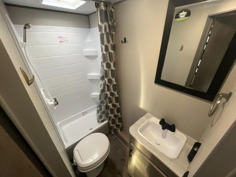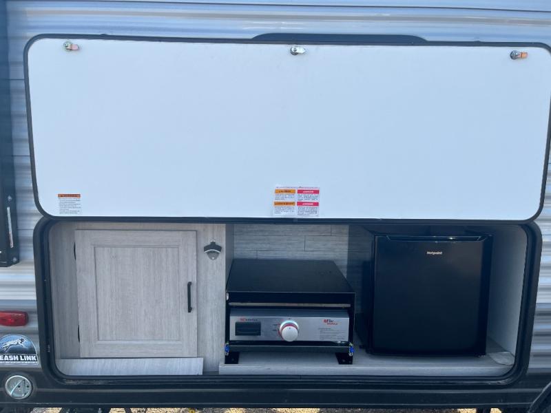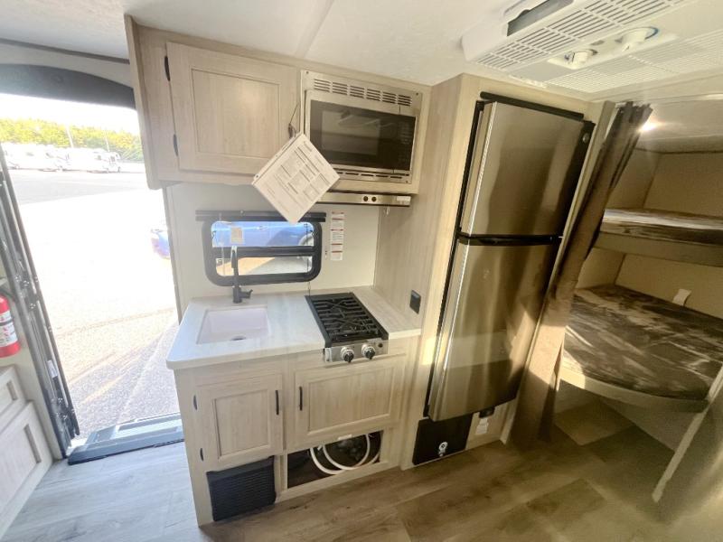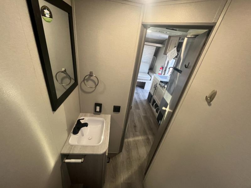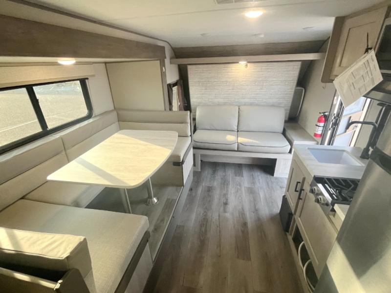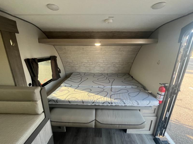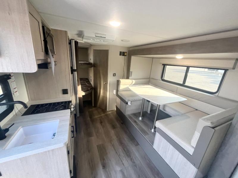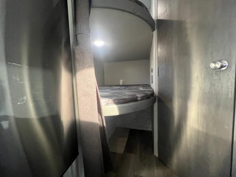 This trailer is easy to tow, store, and maneuver at campgrounds into parking spots! After a day of exploring, everyone can enjoy napping or falling asleep on the double-size bunks next to the full bathroom, or on the Murphy bed up front. There is also under-bunk storage for lake gear or extra luggage! This front multi-use space offers both a living area and bedroom depending on the time of day. The U-shaped dinette gives everyone a place to dine inside, or you can head outside to grab your camping chairs from the pass-through storage and dine under the 15' power awning with multicolor LED lights. There is much more to enjoy inside and outside, and you might like to add the optional camper kitchen as well.