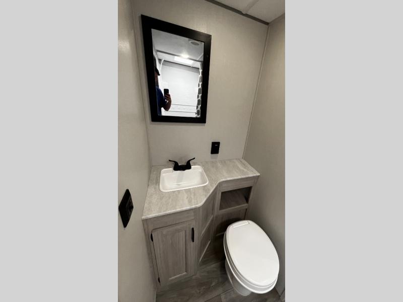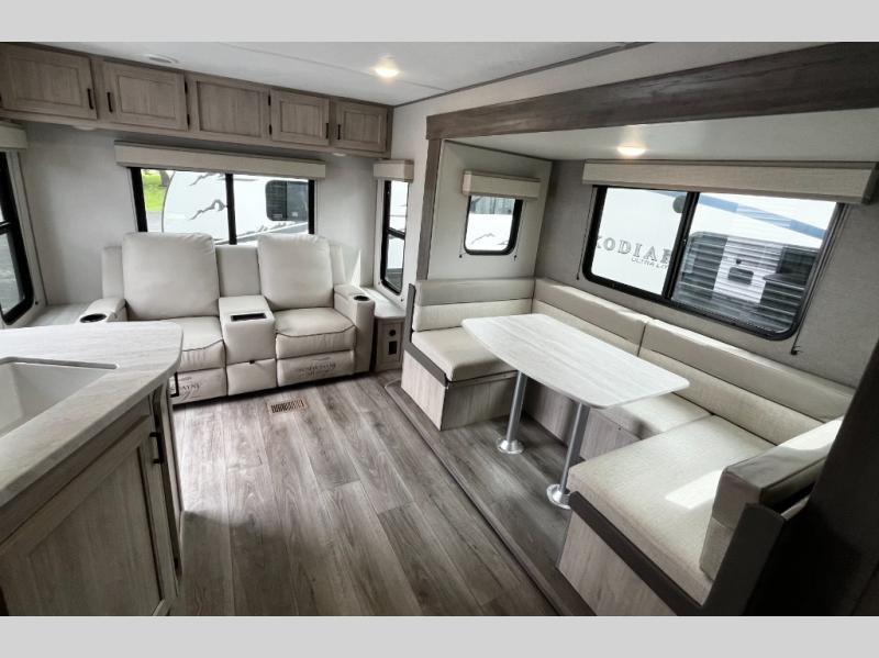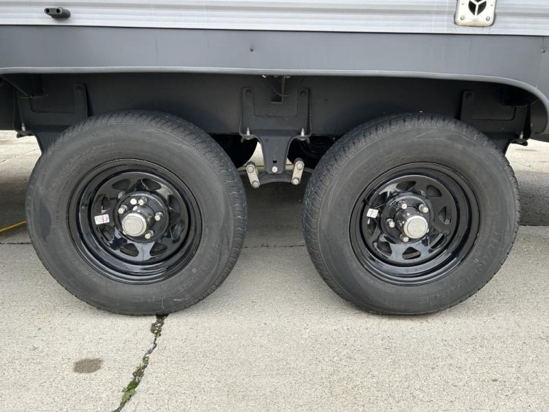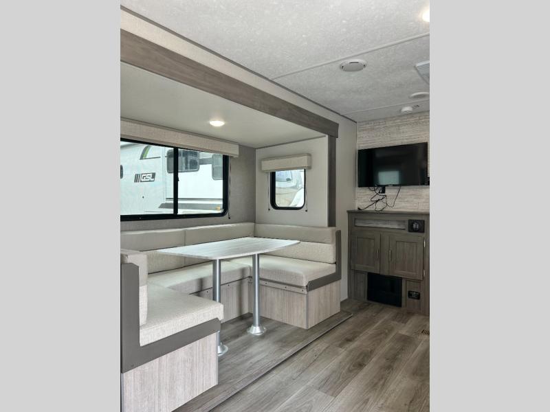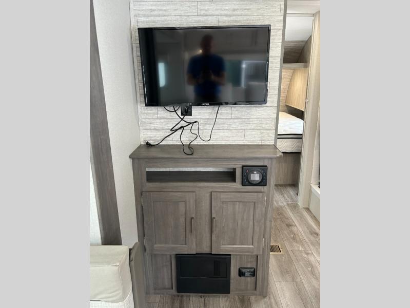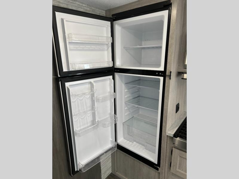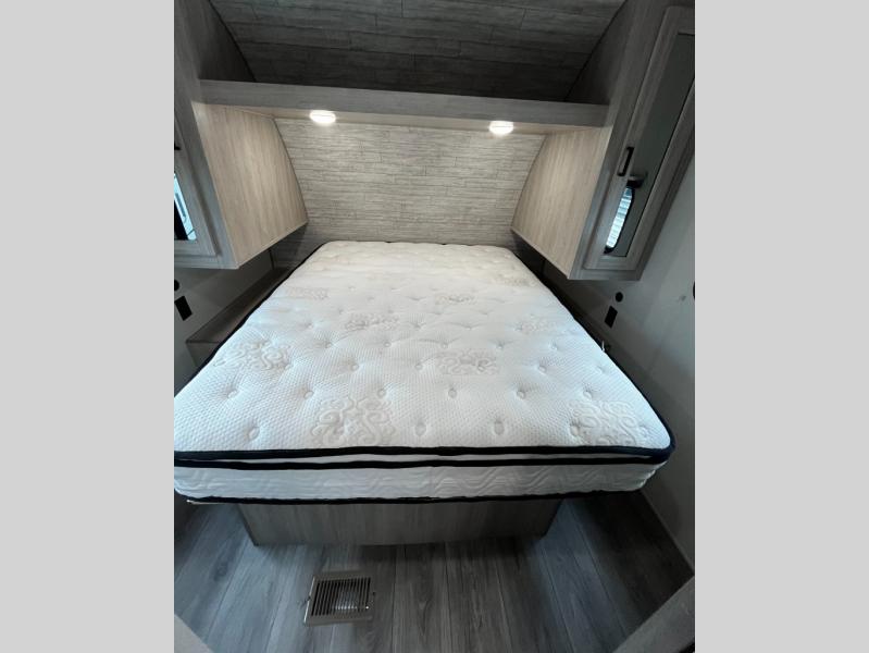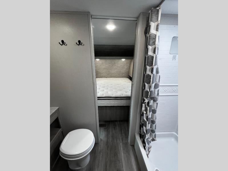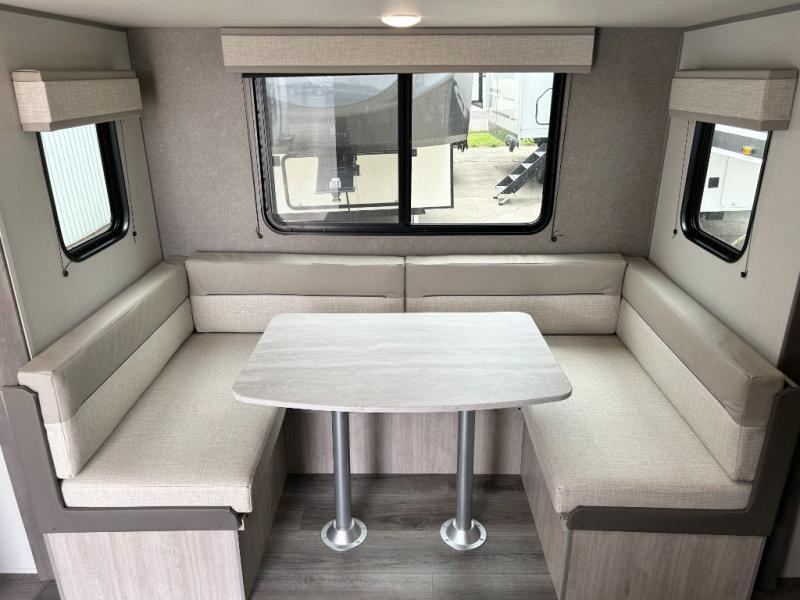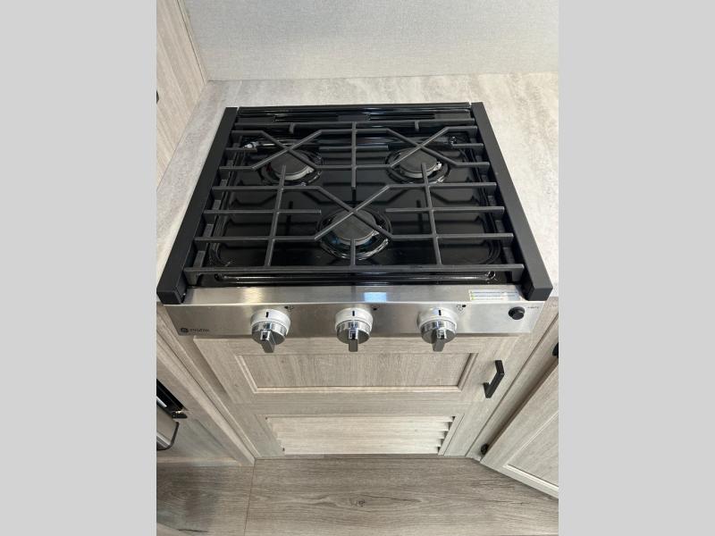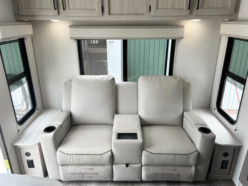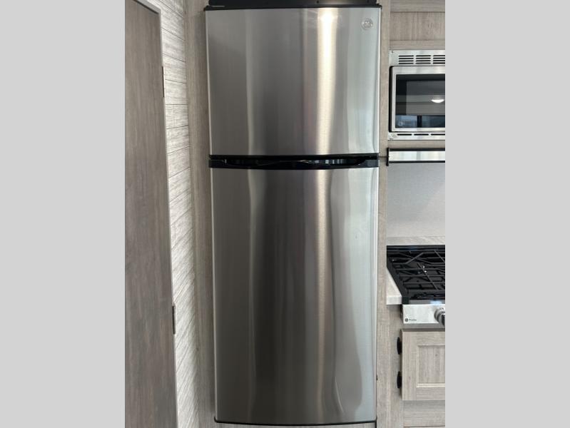 You and your spouse will love the layout of this trailer with a walk-through bathroom which is convenient for you when you are in the front bedroom, and handy for your guests when they stay overnight on the U-shaped dinette. The 68" theater seating includes dual end tables to set your drink on, and the U-shaped dinette will be perfect to dine around or play games at. The galley kitchen offers all the appliances needed to make all your meals, such as a GE stainless three burner cooktop, a GE stainless microwave, plus a GE stainless10.7 cu. ft. 12V refrigerator. You will have your own side of the walk-around queen bed and a wardrobe, as well as USB ports and 110V outlets in the nightstands.