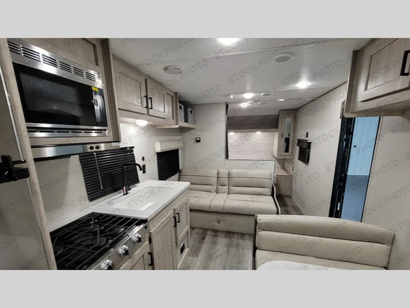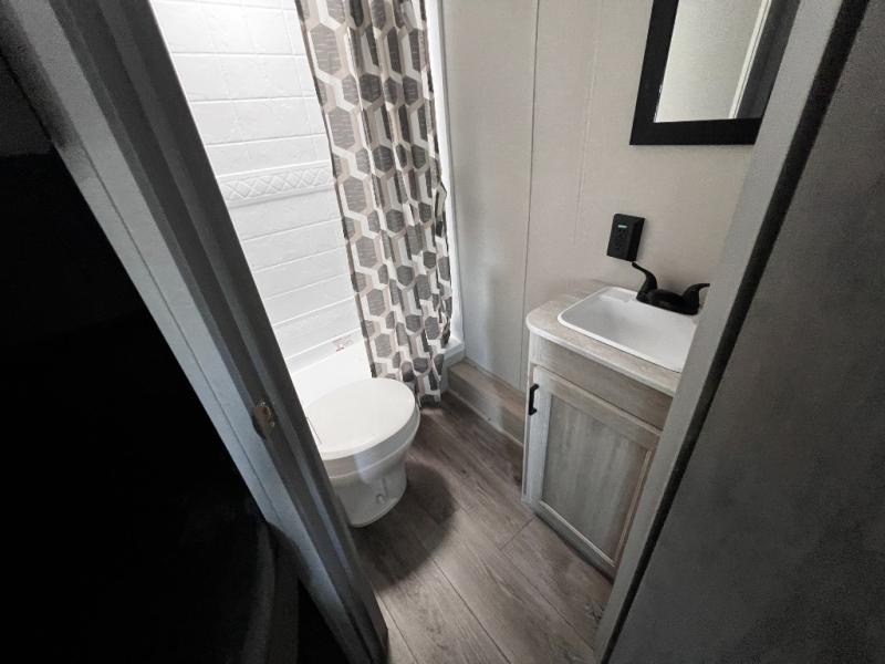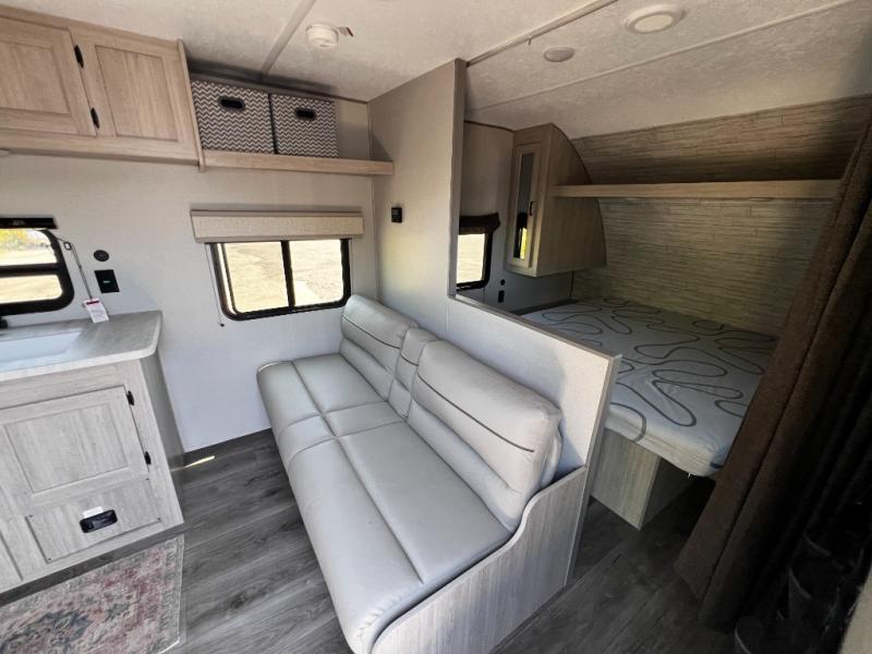 You get to choose to sit at the sofa or at the booth dinette when you are relaxing inside. There is a shelf with storage totes above the sofa for your belongings, and an additional overhead cabinet above the dinette for games. Maybe you want to rest on your own queen bed in the front semi-private bedroom before you make a meal in the kitchen or take a hike through the trails around the lake. The 15' electric awning with multi-color LED lights and a remote offers an outdoor living area where you can visit with other RVers. The kids will love their own double-size bunks that they can share with a friend or two, and the full bathroom is nearby as an added convenience.