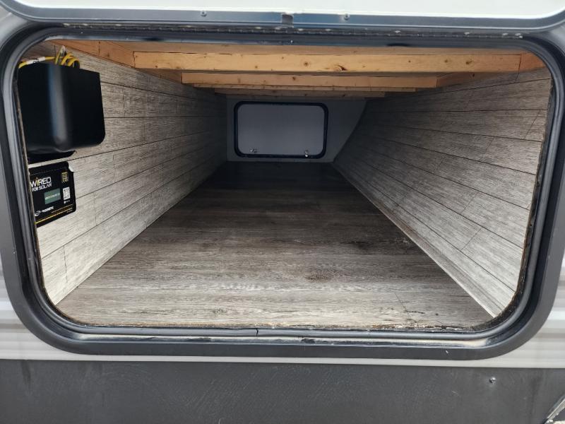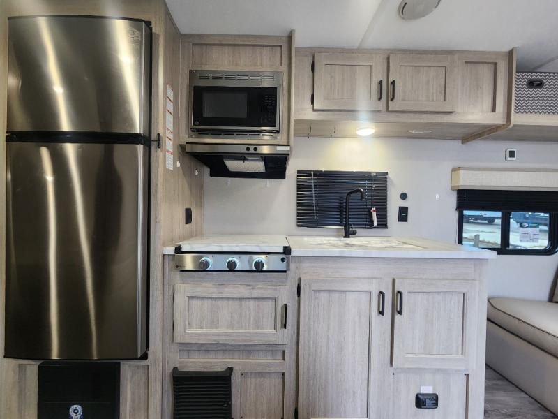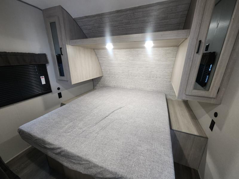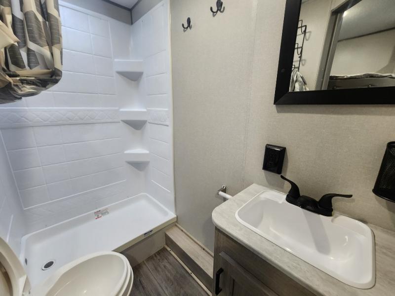 You get to choose to sit at the sofa or at the booth dinette when you are relaxing inside. There is a shelf with storage totes above the sofa for your belongings, and an additional overhead cabinet above the dinette for games. Maybe you want to rest on your own queen bed in the front semi-private bedroom before you make a meal in the kitchen or take a hike through the trails around the lake. The 15' electric awning with multi-color LED lights and a remote offers an outdoor living area where you can visit with other RVers. The kids will love their own double-size bunks that they can share with a friend or two, and the full bathroom is nearby as an added convenience.