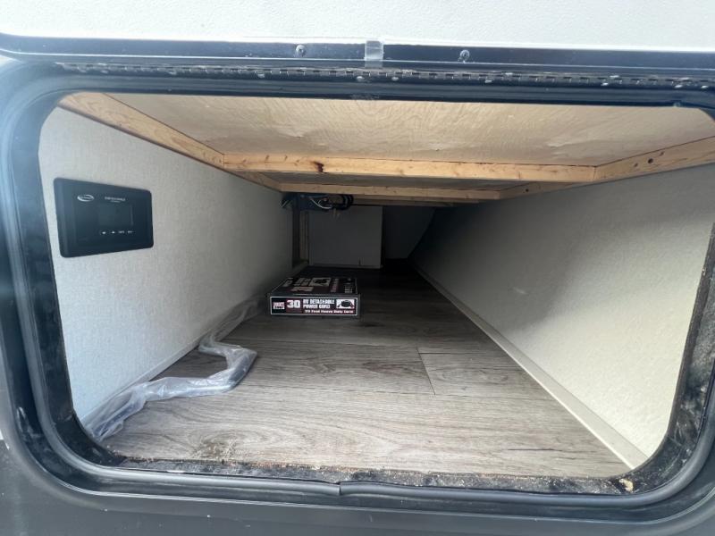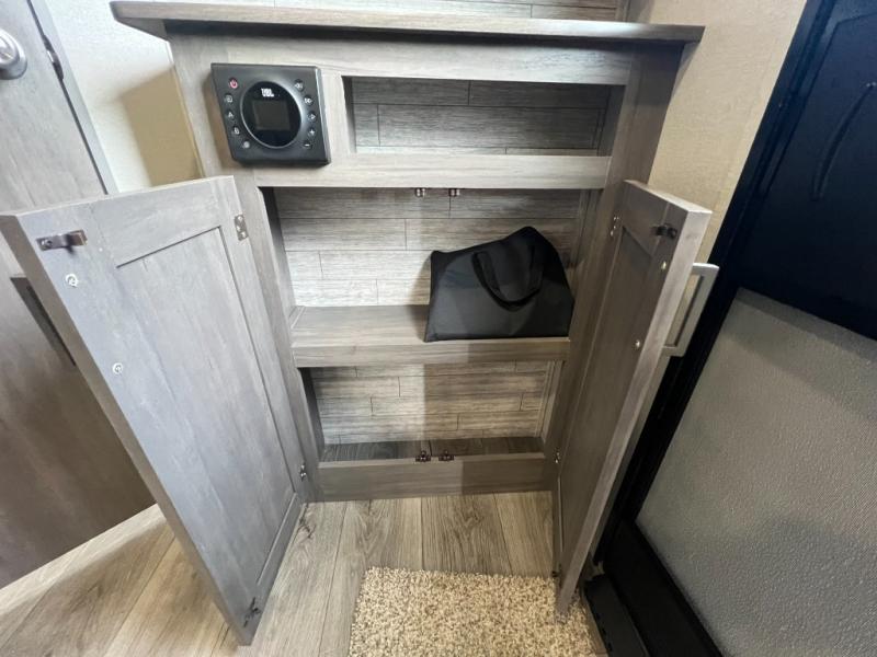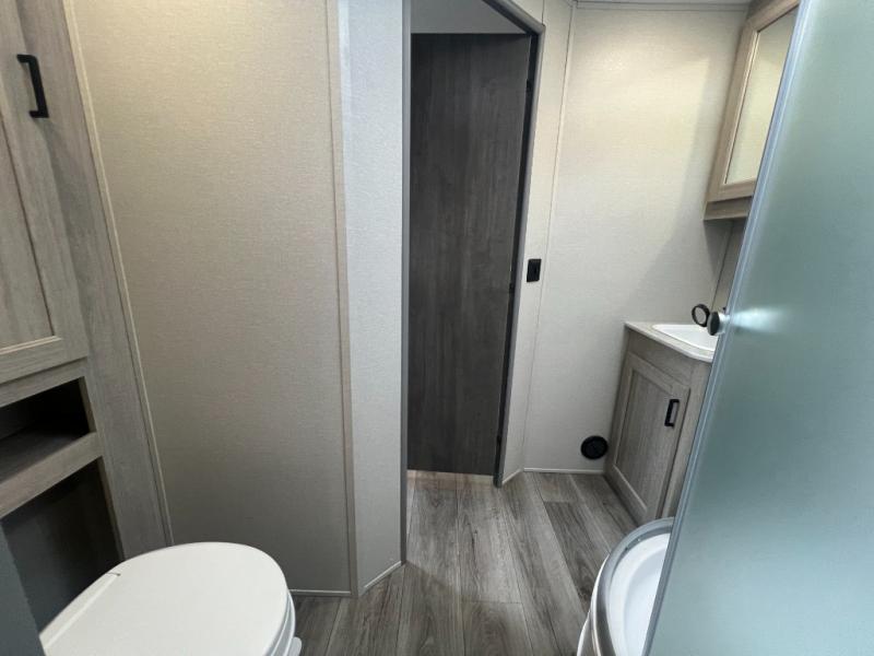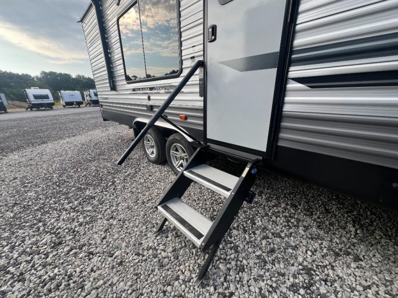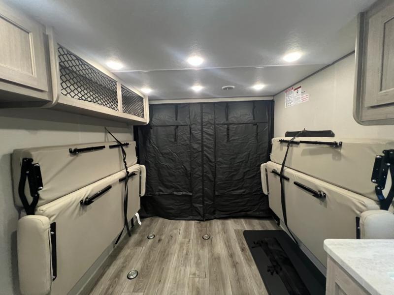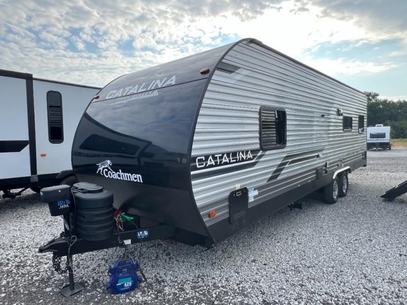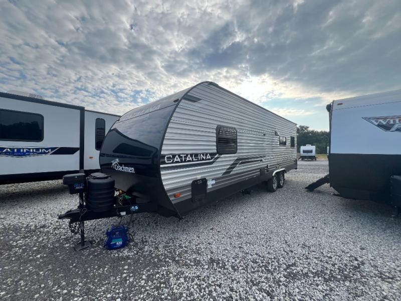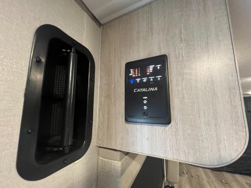 The best looking, most affordable toy hauler is found in the Catalina Trailer Blazer by Coachmen. Each one is constructed with a seamless alpha roof membrane, an enclosed and fully sealed underbelly, and a cambered structural steel I-beam frame for added support. There is a rear loading cargo door with a 3,000 lb. capacity, a black out screen wall with a zip walk-thru and windows, plus 500 lb. tie-downs to secure your toys. You'll love the interior with its Congoleum woodplank linoleum flooring and LED interior lighting. Head outside to find an electric awning with multicolored LED lights and a remote, a 15' Toy Loc cable, a "Leash Link" quick hookup D-ring for pets, and upgraded aluminum wheels. The Catalina Trail Blazer also comes with RV-LINK 4G LTE connectivity with a WiFi booster and extender, a JBL Aura Cube media center, plus premium JBL interior speakers for your pleasure!