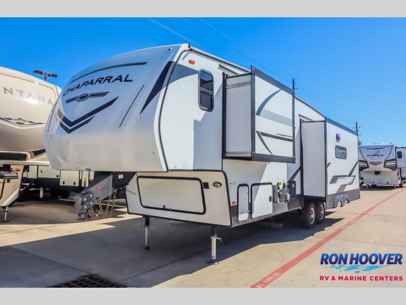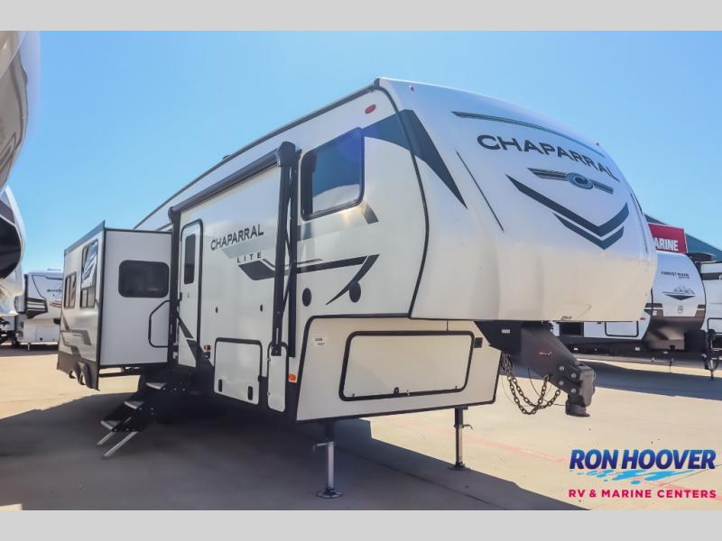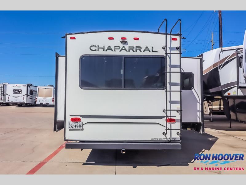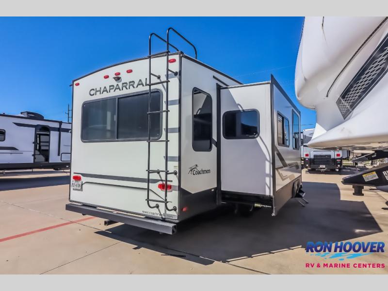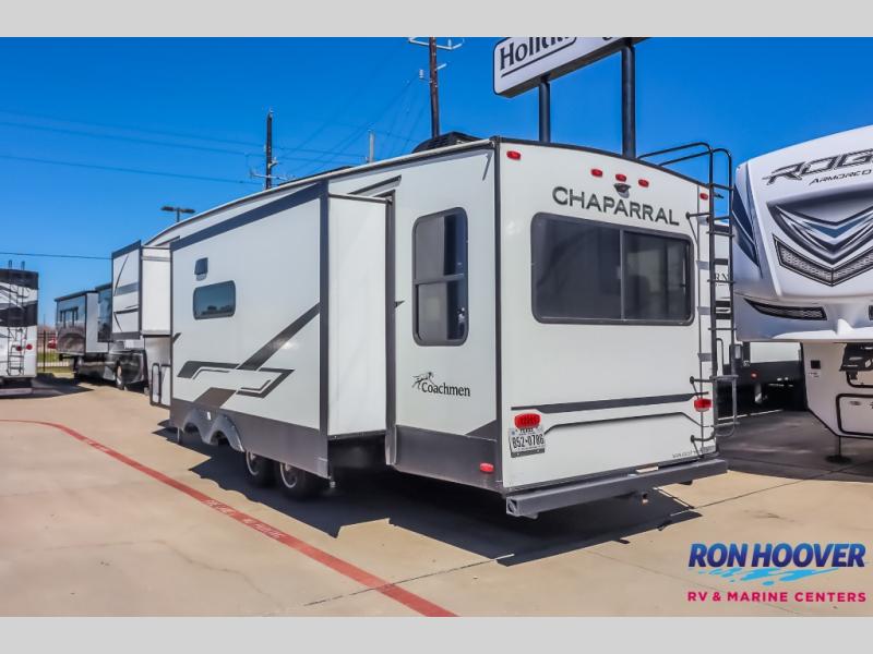 Comfort, convenience, and an easy haul is what you will find with each one of these Coachmen RV Chaparral Lite fifth wheels! Their Tri-Tex powder coated frame technology is up to 5X more weather resistant, and the dual-sided Azdel composite sidewall panels is ultra durable. The Road Armor suspension by Trail Air comes with heavy duty shackles and wet bolts so you can be sure it will hold up through every adventure, and you might want to add the exterior back-up and sideview camera prep for easy parking. You will feel right at home inside with a modern sound bar with a stereo, blackout roller night shades, Thomas Payne furniture, a high BTU output modern electric fireplace, and many more comforts! The exterior is just as inviting with its electric awning with LED lights, Solid Step entry steps, and pass-through storage for all your gear!
