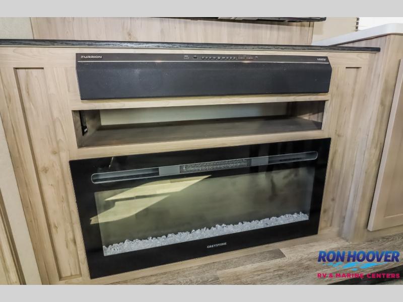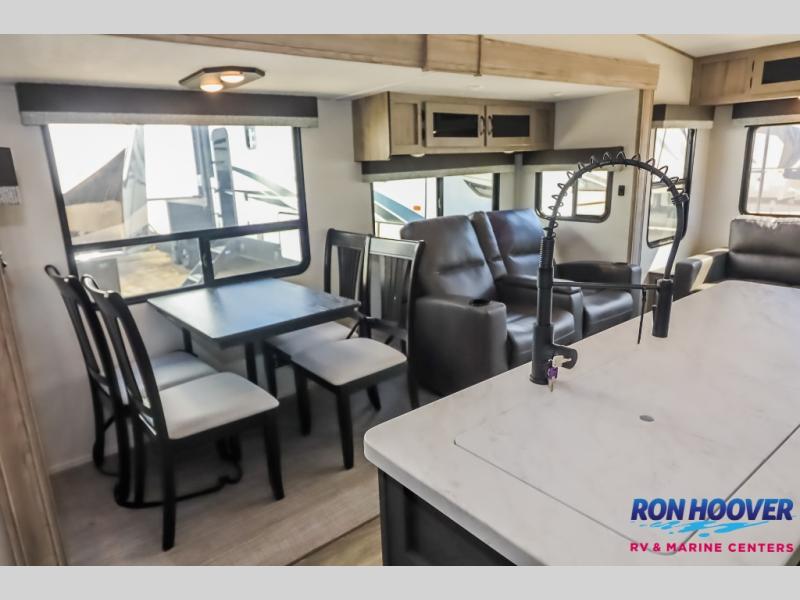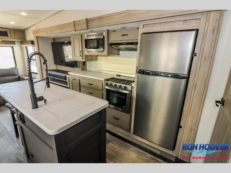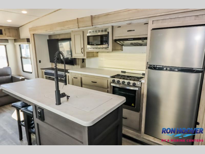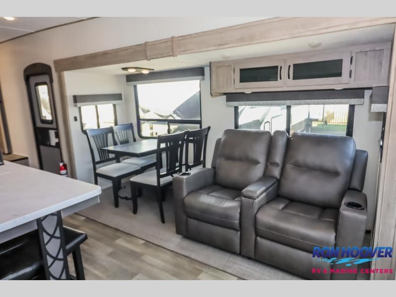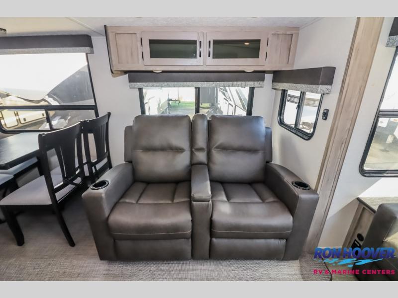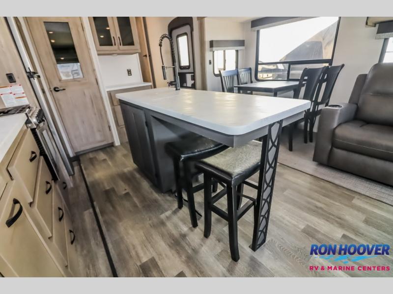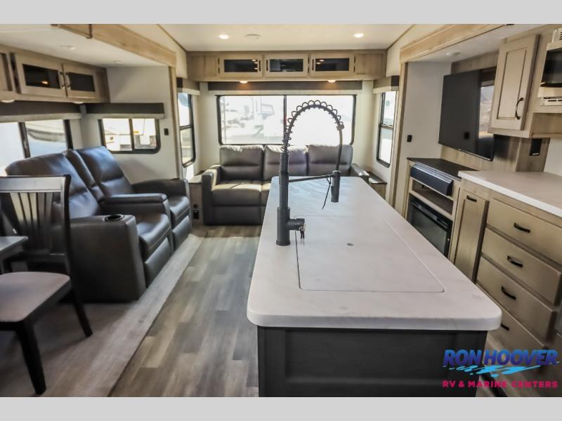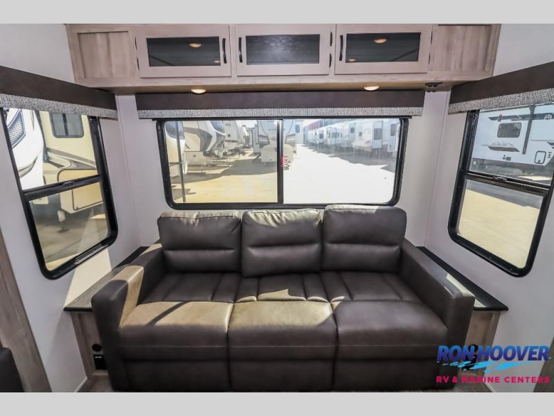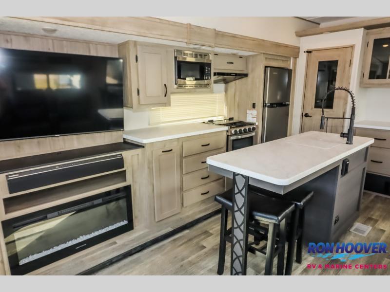 Get ready for a luxurious getaway in this fifth wheel! The rear living area is the perfect place to wind down your nights by relaxing on either the 78" tri-fold hide-a-bed sofa or the theater seating across from the entertainment center. You could even play a few card games at the free-standing table while enjoying snacks that were stored in the pantry. The kitchen island comes with two bar stools so you can have two helpers get dinner ready while you're cooking on the three burner cooktop. The dual entry bathroom is easy for everyone to access and has a radius shower with glass doors to freshen up in, plus it leads directly into the front master suite where you will find a queen bed to lay your head on at night and a wardrobe/linen slide to keep your clothes looking their best!