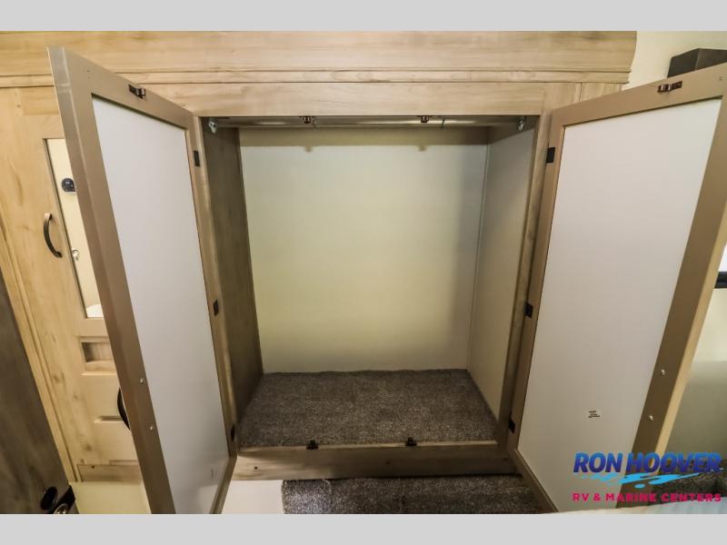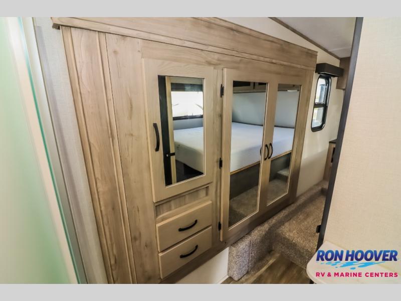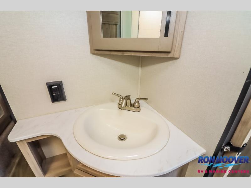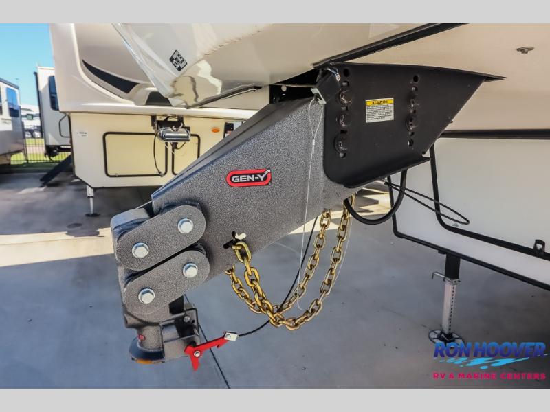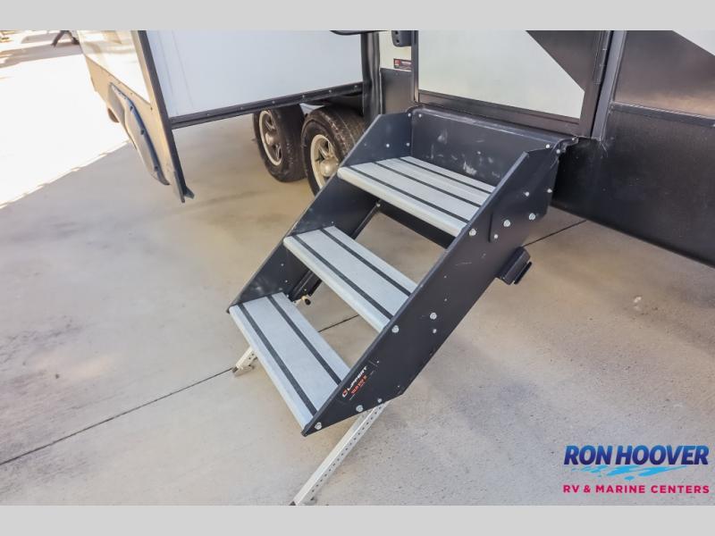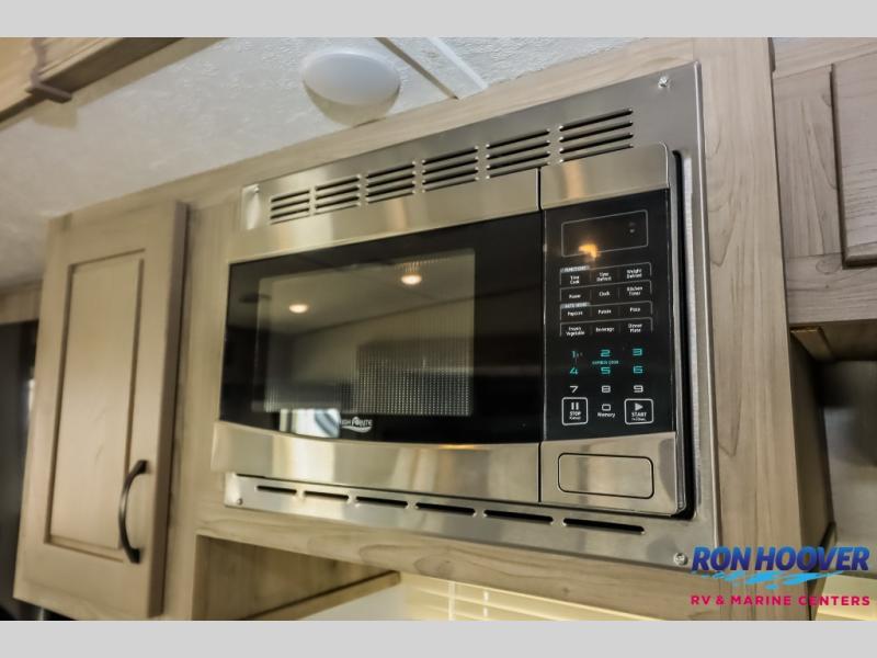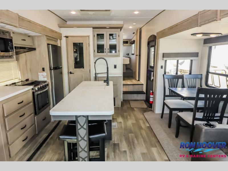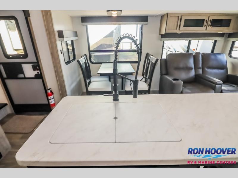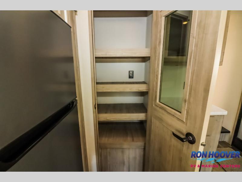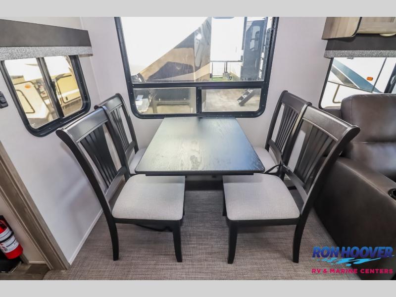 Get ready for a luxurious getaway in this fifth wheel! The rear living area is the perfect place to wind down your nights by relaxing on either the 78" tri-fold hide-a-bed sofa or the theater seating across from the entertainment center. You could even play a few card games at the free-standing table while enjoying snacks that were stored in the pantry. The kitchen island comes with two bar stools so you can have two helpers get dinner ready while you're cooking on the three burner cooktop. The dual entry bathroom is easy for everyone to access and has a radius shower with glass doors to freshen up in, plus it leads directly into the front master suite where you will find a queen bed to lay your head on at night and a wardrobe/linen slide to keep your clothes looking their best!