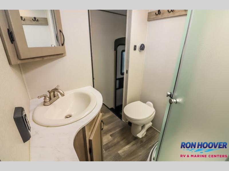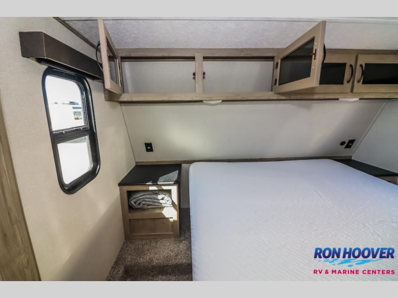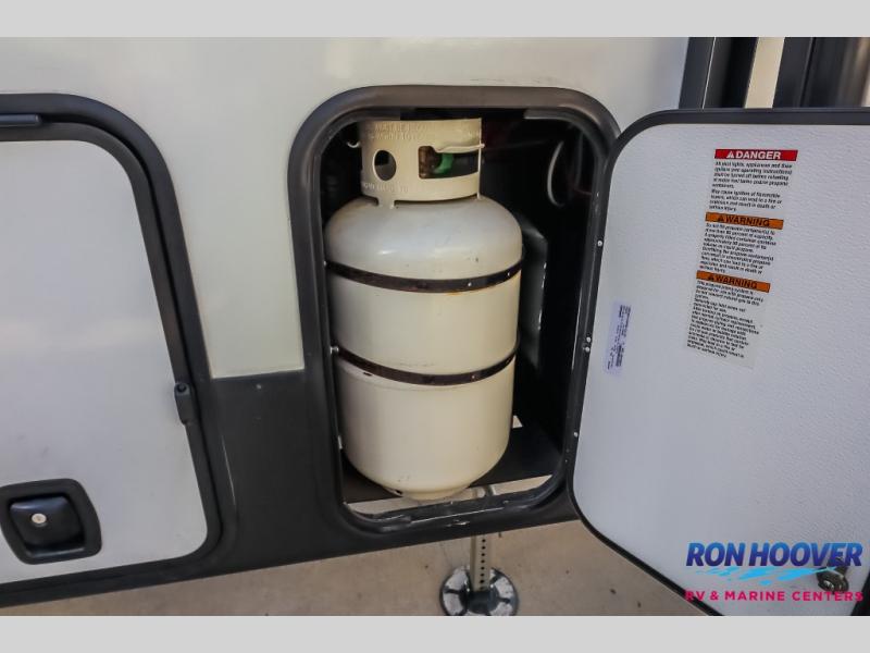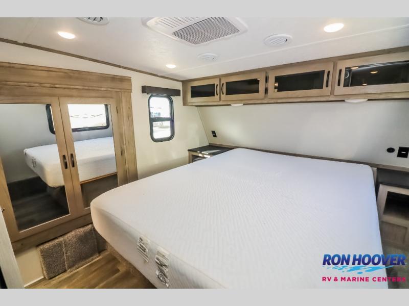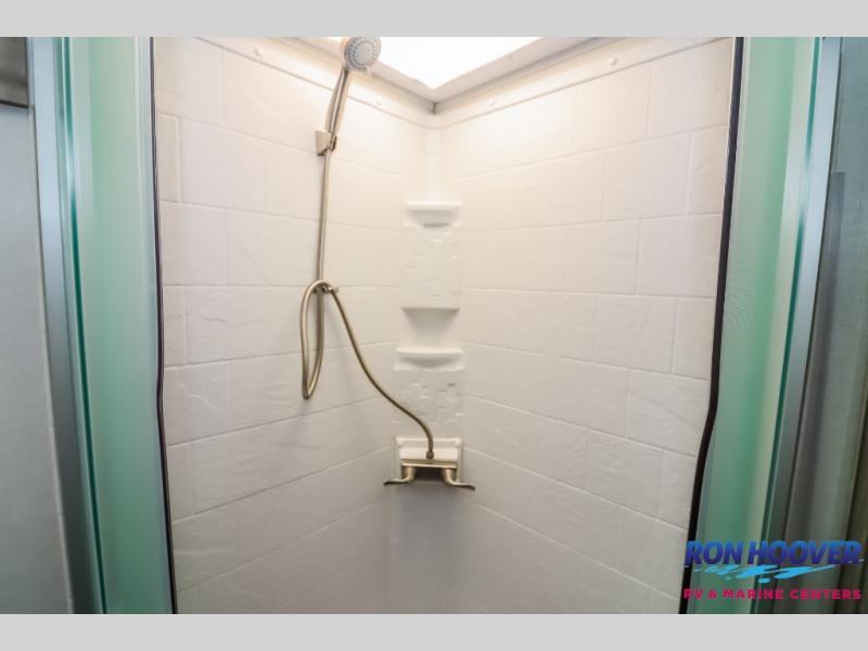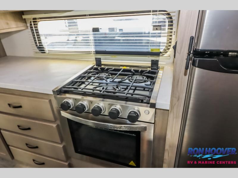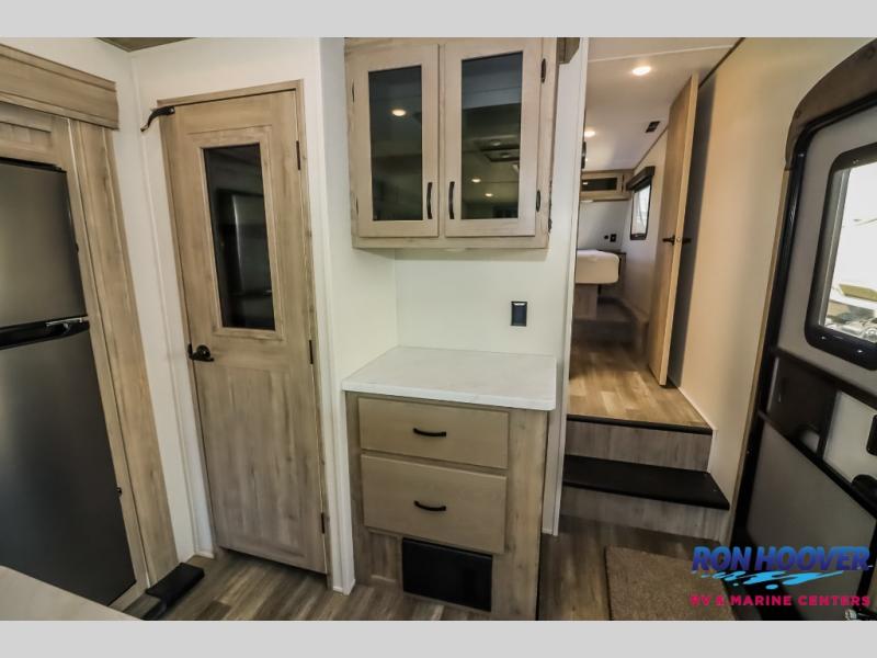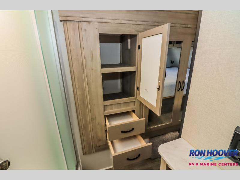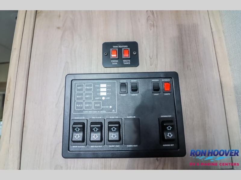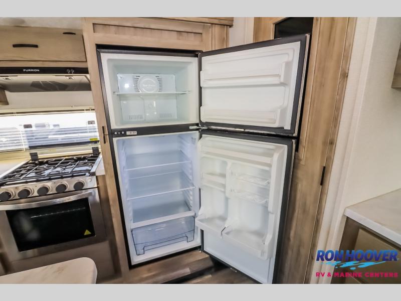 Get ready for a luxurious getaway in this fifth wheel! The rear living area is the perfect place to wind down your nights by relaxing on either the 78" tri-fold hide-a-bed sofa or the theater seating across from the entertainment center. You could even play a few card games at the free-standing table while enjoying snacks that were stored in the pantry. The kitchen island comes with two bar stools so you can have two helpers get dinner ready while you're cooking on the three burner cooktop. The dual entry bathroom is easy for everyone to access and has a radius shower with glass doors to freshen up in, plus it leads directly into the front master suite where you will find a queen bed to lay your head on at night and a wardrobe/linen slide to keep your clothes looking their best!