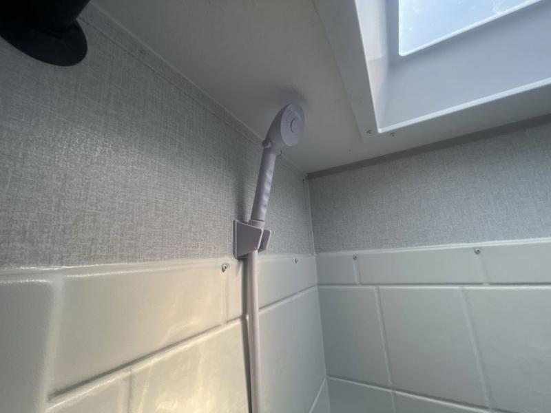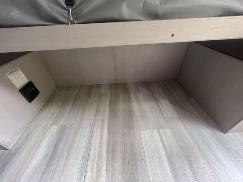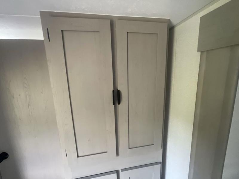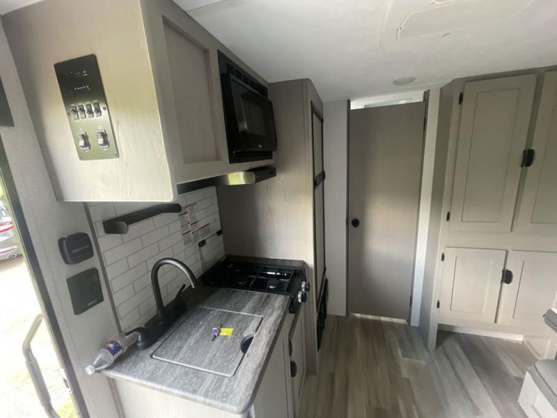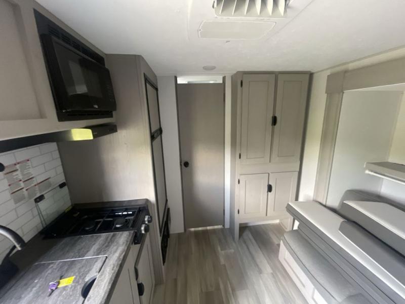If you are looking for a cozy travel trailer for two with a bit more space without having a long tow length, then this Viking travel trailer is for you! A front Murphy bed that when stored in the closed position reveals a spacious u-shaped dinette that is perfect for entertaining your campground neighbors or friends. An optional fireplace creates a warm and inviting space, and the large rear bath features a spacious shower with skylight, toilet and vanity with sink, as well as space to accommodate your towels and toiletries. The jack knife sofa sofa slide has a place for you to store your suitcases behind it. A two burner cooktop and sink opposite, plus microwave oven overhead, allows you to easily make meals while you camp and there is ample storage in the pantry cabinet above the optional fireplace for your things as well.