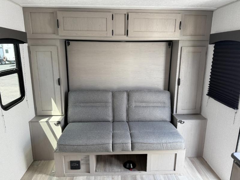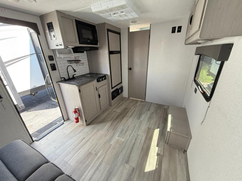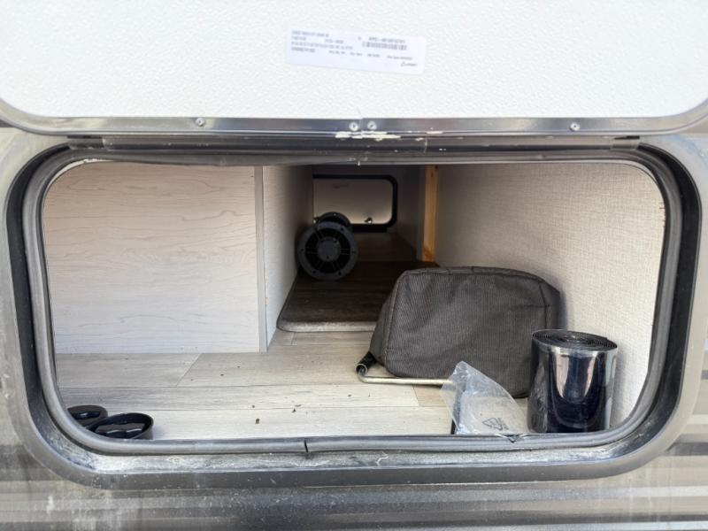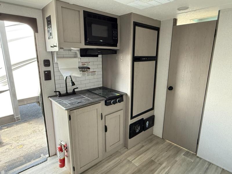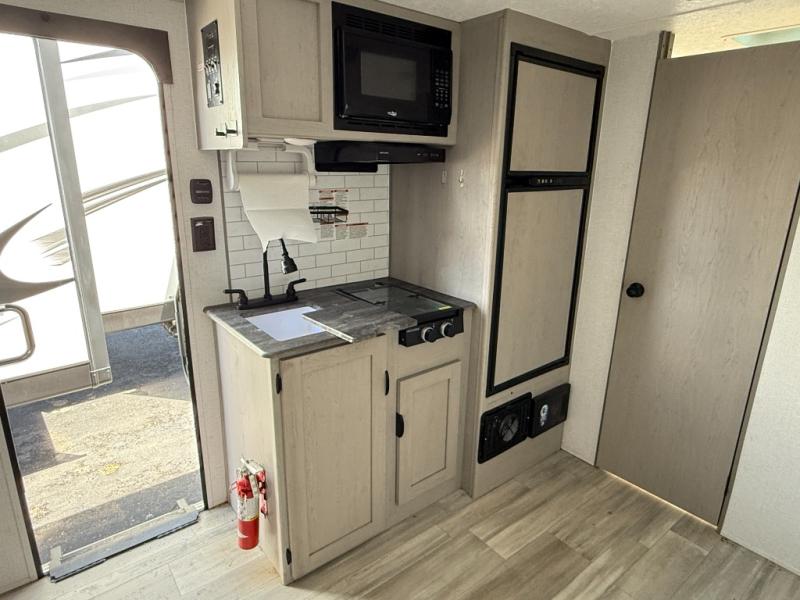 Take this couple's travel trailer to your favorite destinations! It features a front 60" x 74" RV queen bed for you to get a good night's rest after a full day at the beach, and a full rear bathroom with a 24" x 36" shower to rinse the sand out of your hair too. Fill your belly with a delicious home cooked meal made using the two burner cooktop or by reheating some leftovers in the microwave. There are wardrobes and overhead shelves to store all of your items, plus there is an exterior pass-through storage area for your outdoor gear!