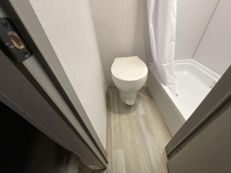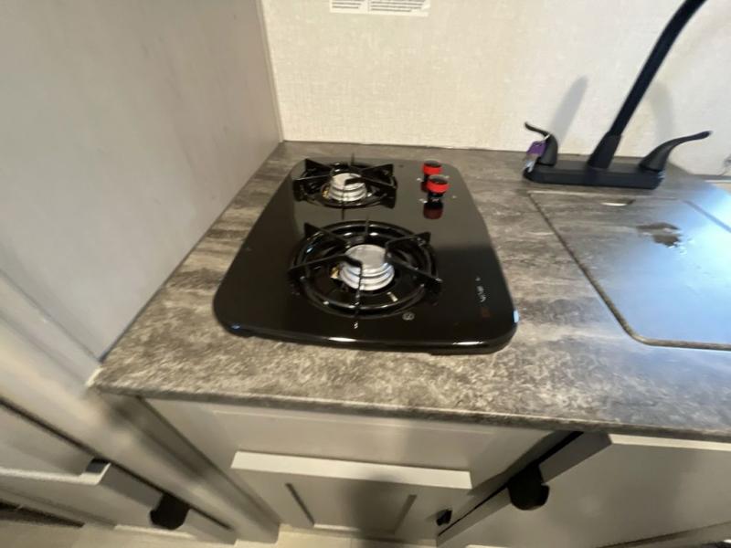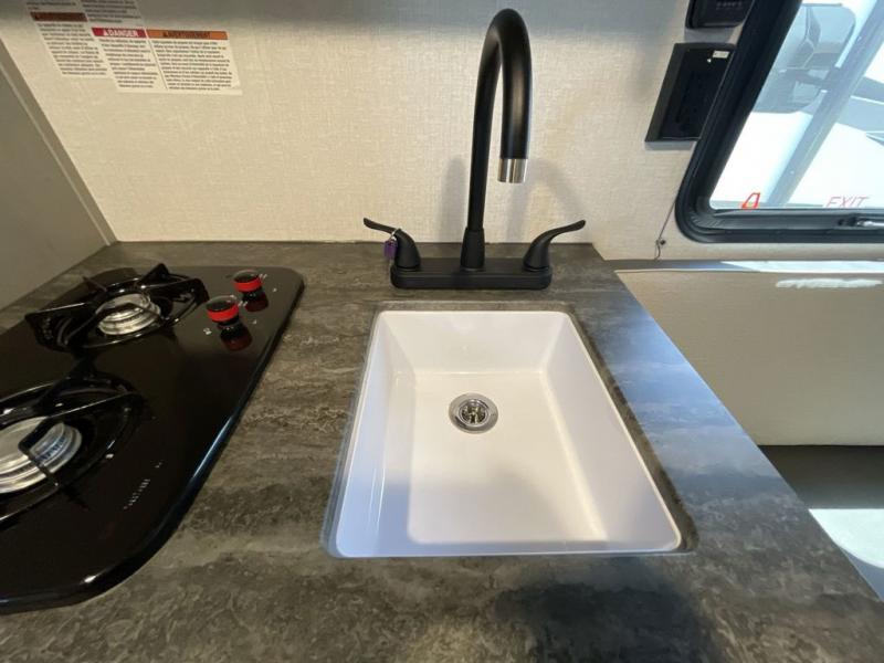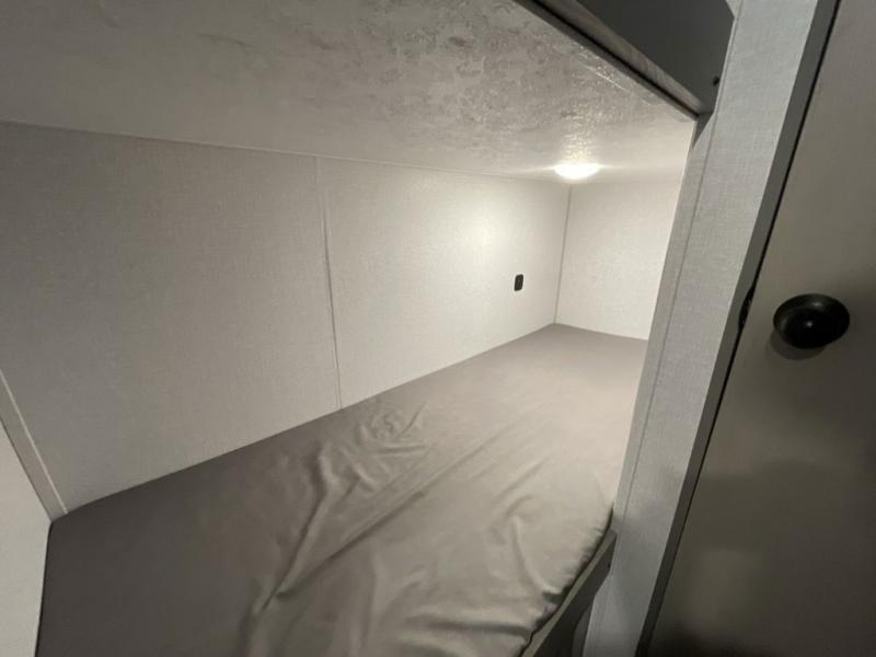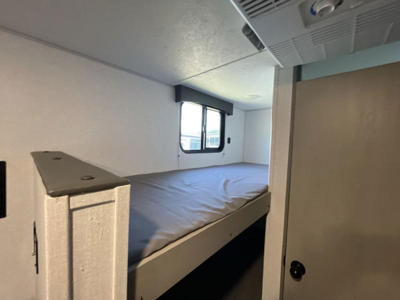 This Clipper Cadet bunk model is perfect for your growing family of three or four. In front, a booth dinette with large overhead shelf is great for dining during the day, and can easily be converted to queen bed size sleeping space for two. A countertop with cabinet storage beneath are featured just inside the door on your left. The children will love the 28" x 72" bunk beds and a convenient corner bath with toilet and 24" x 36" shower is right nearby for late night trips. Cook up family meals with the two burner cook-top easily inside when you don't feel like cooking over an open campfire There is a single sink, pantry, and refrigerator for your perishables as well. On the outside, a 9' awning provides more living space to enjoy, and there is exterior storage both up front and in back beneath the awning for camp chairs and outside toys and games.