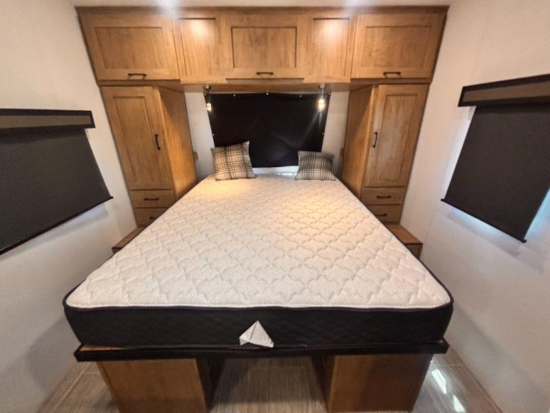 This is the perfect couple's trailer to take to the lake every other weekend. You will enjoy your own queen bed up front that includes vaulted under-bed storage for your luggage. The sofa slide out with a free-standing table provides a place to relax and dine together, and if you have an overnight guest, they can sleep here. The chef can prepare meals on the three burner cooktop or in the microwave oven, and there is a stainless steel sink for easy clean up. This model also includes a full bath with a linen closet for clean towels, and a 32" radius shower with a skylight for more standing space.