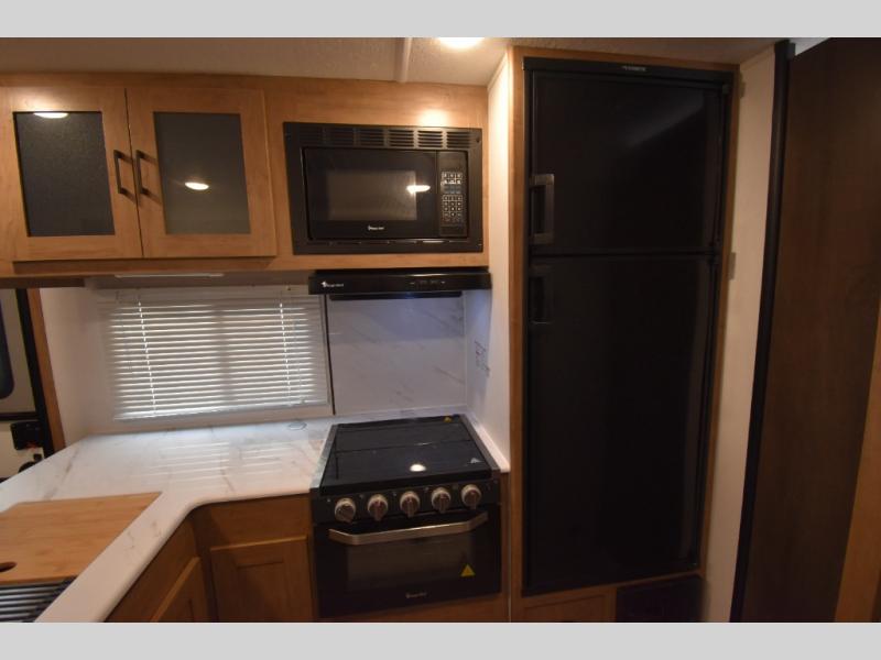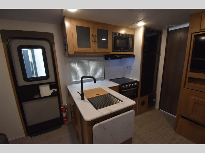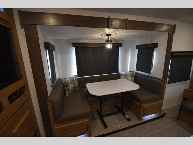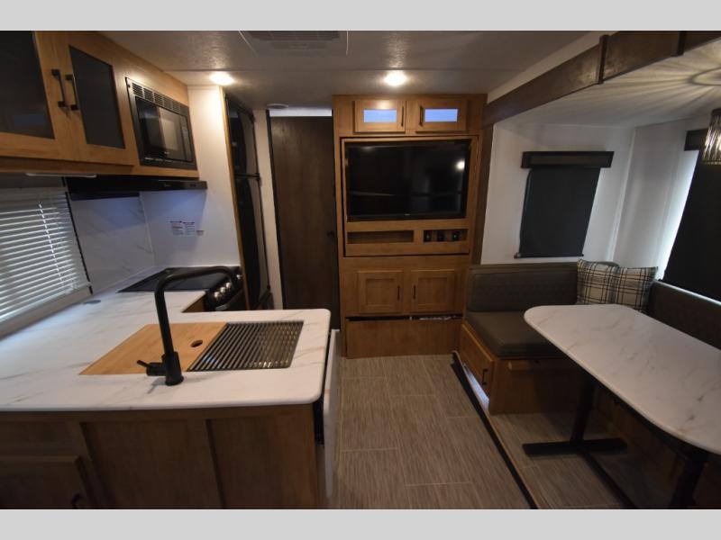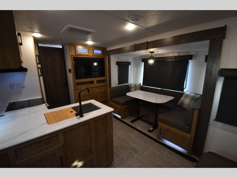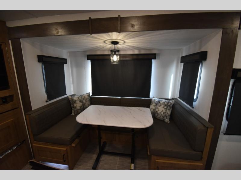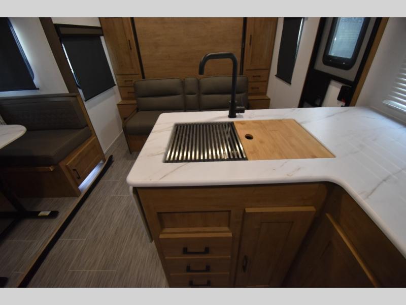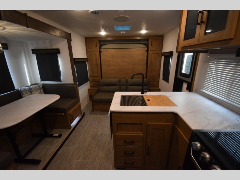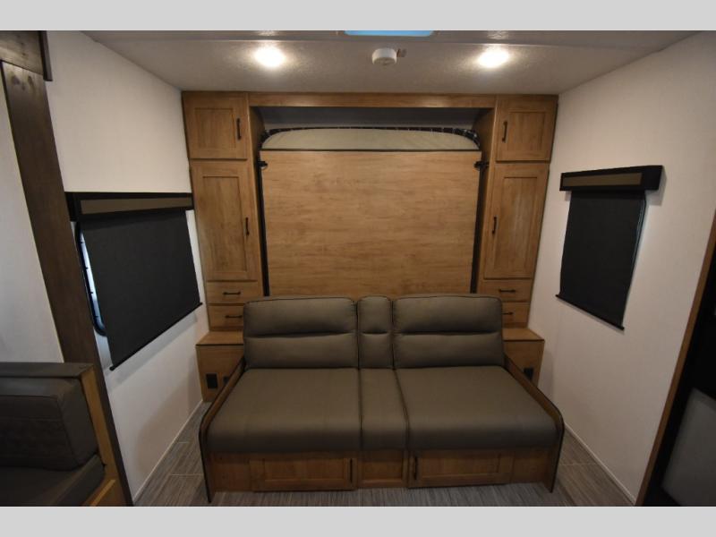 Escape the city life for relaxing weekends at the lake in this spacious travel trailer. Once you arrive at the campground, set up the 14' power awning with LED lights, then prepare lunch on the full camp kitchen. Head inside and gather around the U-shaped dinette for game night, or you can relax on the sofa and watch a movie on the smart TV. The interior kitchen includes everything needed to prepare meals, including a three burner cooktop, a microwave oven, plus an 8 cu. ft. double door refrigerator. When it comes time to call it a night you can quickly fold down the Murphy bed behind the sofa, and your guests can sleep on the dinette.