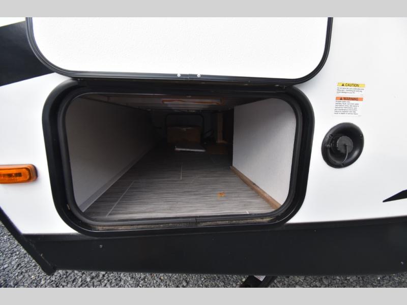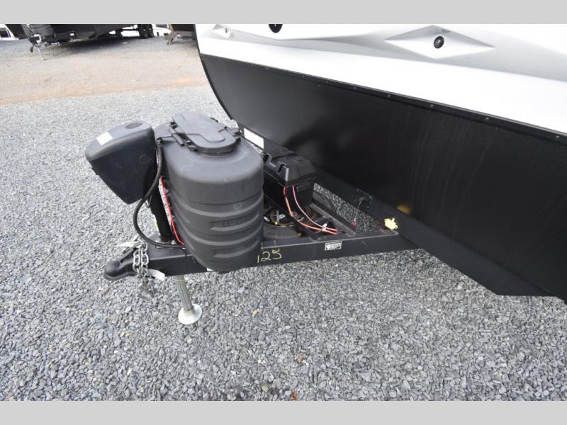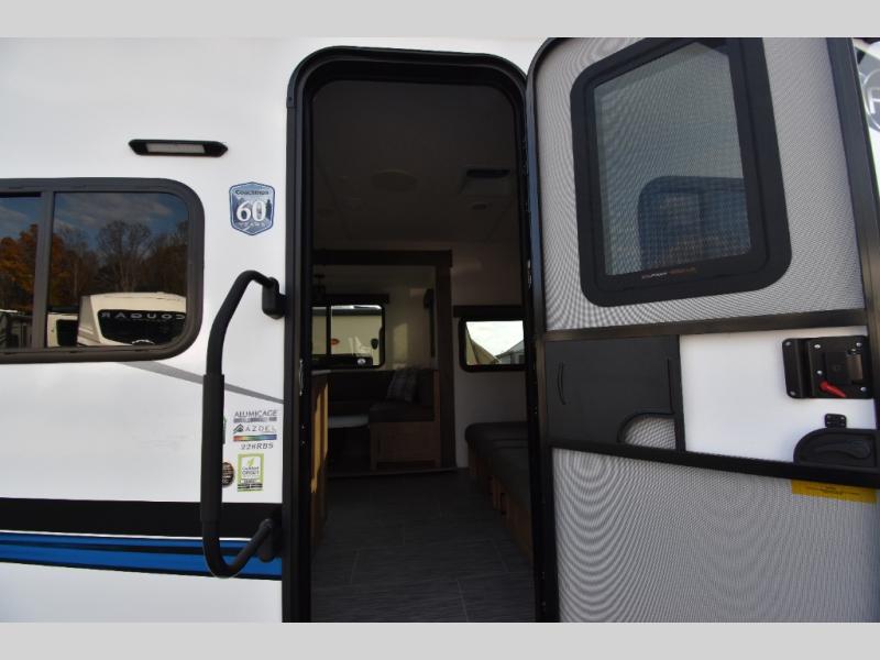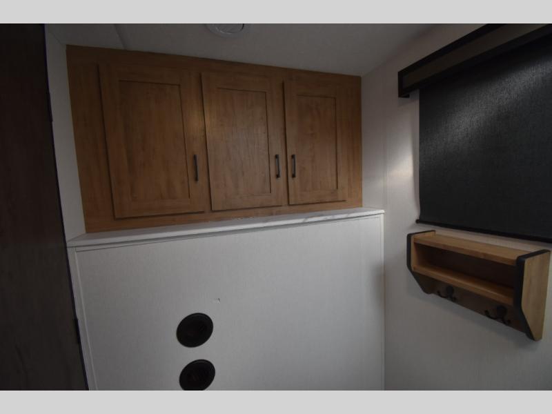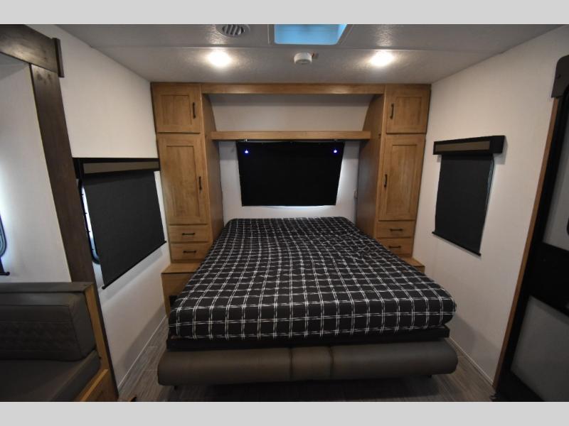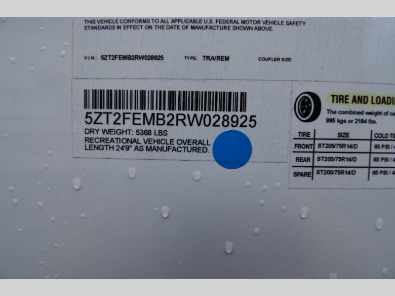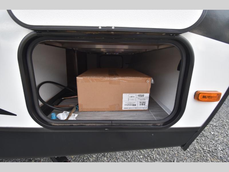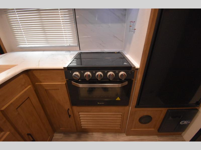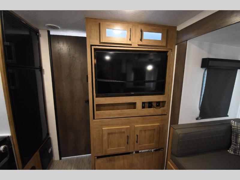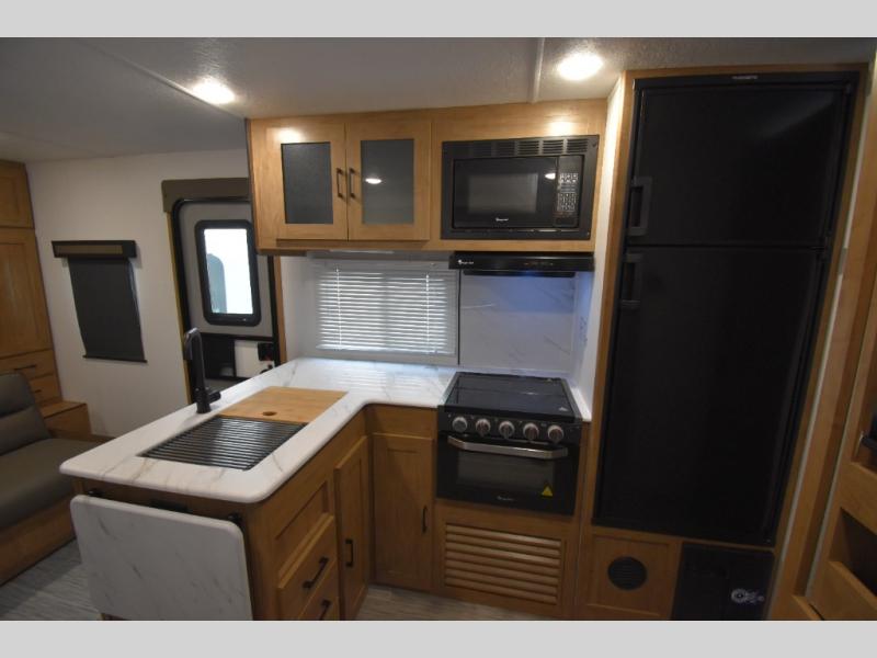 Escape the city life for relaxing weekends at the lake in this spacious travel trailer. Once you arrive at the campground, set up the 14' power awning with LED lights, then prepare lunch on the full camp kitchen. Head inside and gather around the U-shaped dinette for game night, or you can relax on the sofa and watch a movie on the smart TV. The interior kitchen includes everything needed to prepare meals, including a three burner cooktop, a microwave oven, plus an 8 cu. ft. double door refrigerator. When it comes time to call it a night you can quickly fold down the Murphy bed behind the sofa, and your guests can sleep on the dinette.