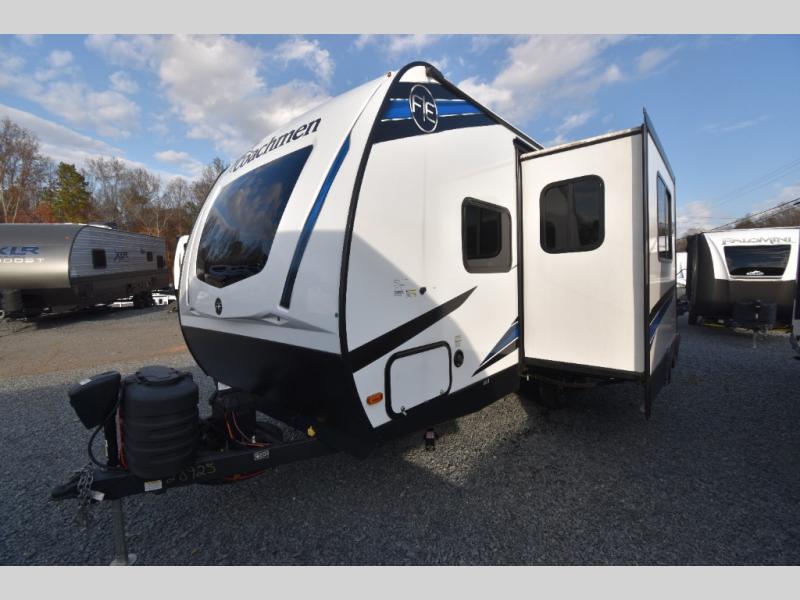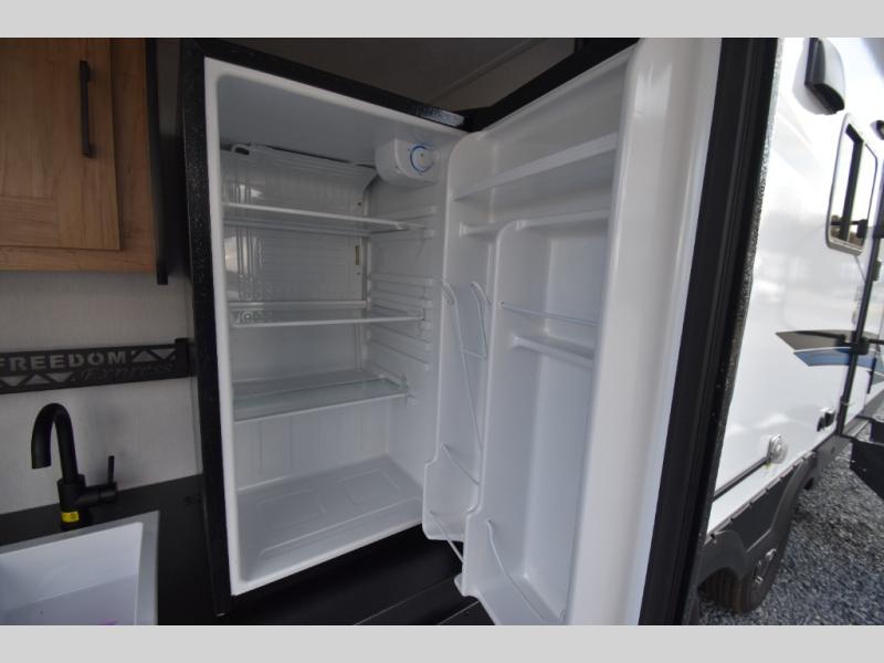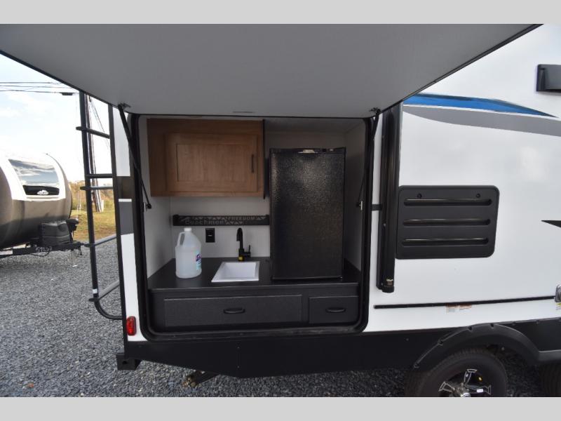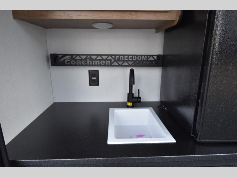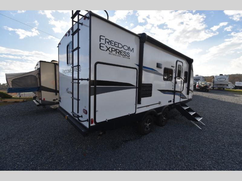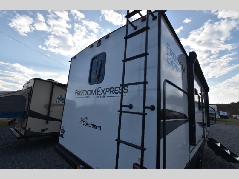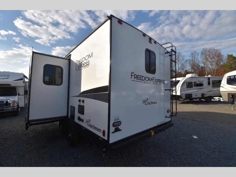 With any Freedom Express Ultra Lite travel trailer by Coachmen you will appreciate quality construction materials, such as vacuum bonded walls with Azdel composite, a 3/4 gel coated fiberglass cap with an automotive glass windshield, and a heated enclosed underbelly. Each model also features Tufflex PVC roofing, front rock guard, and E-Z Lube axles for smooth towing. Inside, you'll find kitchen backsplash, hidden hinge cabinetry, and wear-resistant vinyl flooring throughout. The power tongue jack included with the Ultra Lite Express Package will make set-up a breeze, and each model includes back-up camera prep and they are Freedom solar ready if you plan to go off-grid. Enjoy lightweight camping with a Freedom Express Ultra Lite travel trailer today!
