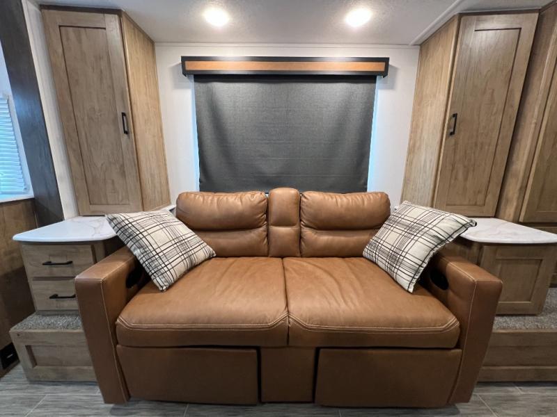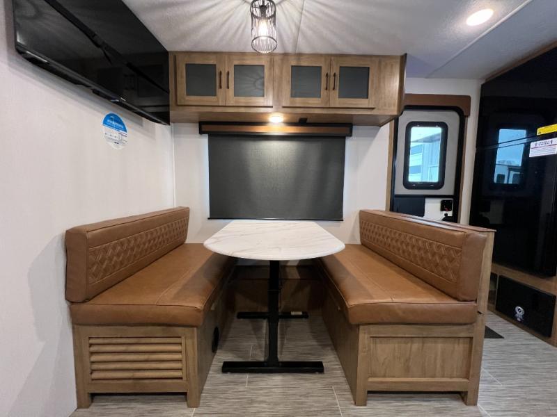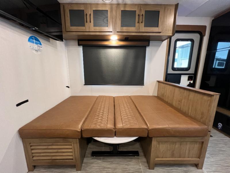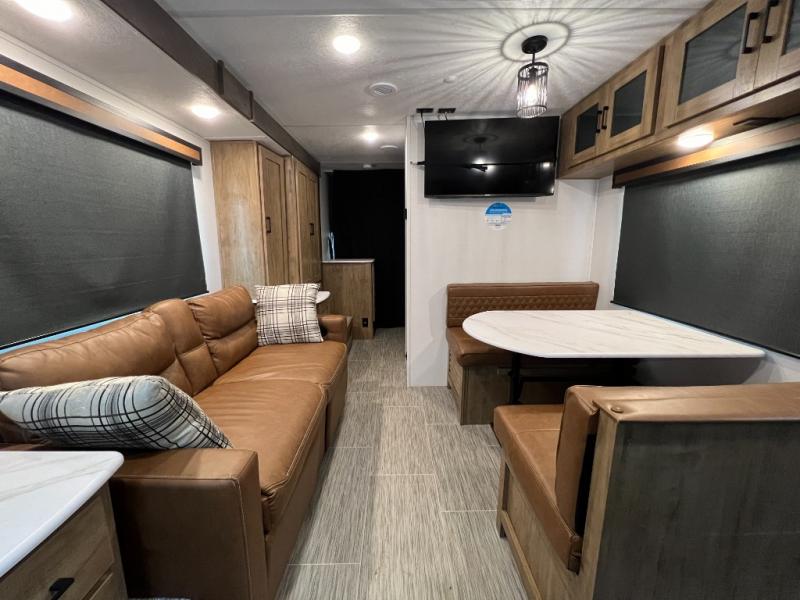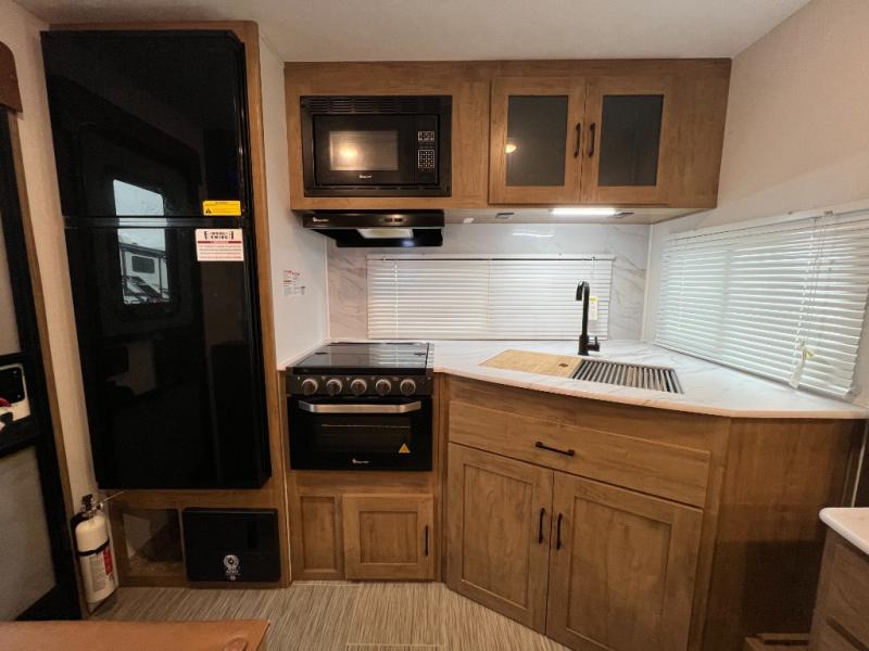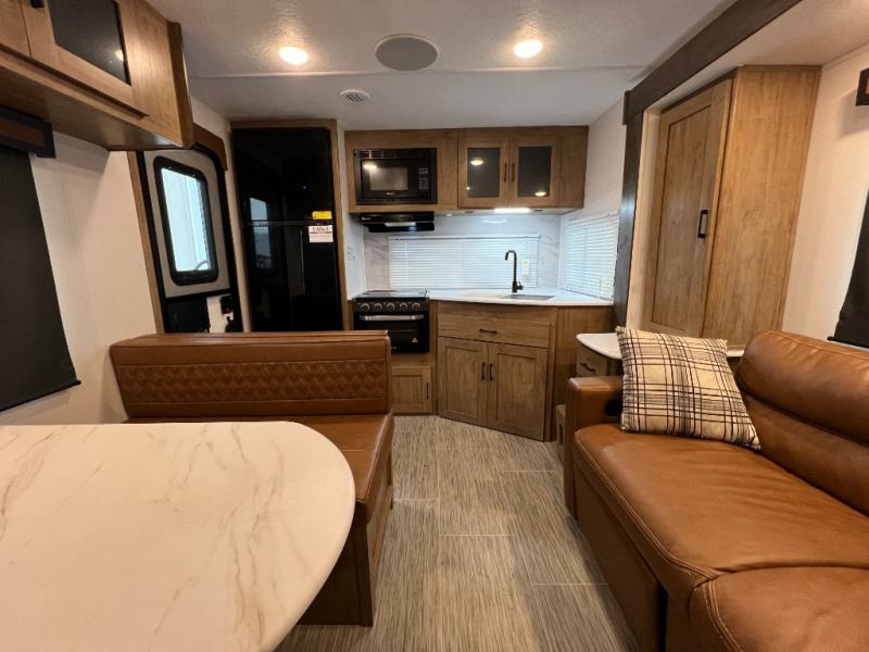 Check out this rear kitchen travel trailer that can sleep three to four each night. The front semi-private bedroom includes a privacy curtain and a queen bed with vaulted under-bed storage for your belongings. The sofa within the large slide out and the booth dinette will provide comfortable seating space, and there is a Smart TV for those rainy camp days. This model also includes a three burner cooktop, a microwave oven, and an 8 cu. ft. double door refrigerator for your perishables. And don't forget about the 18' power awning with LED lights!