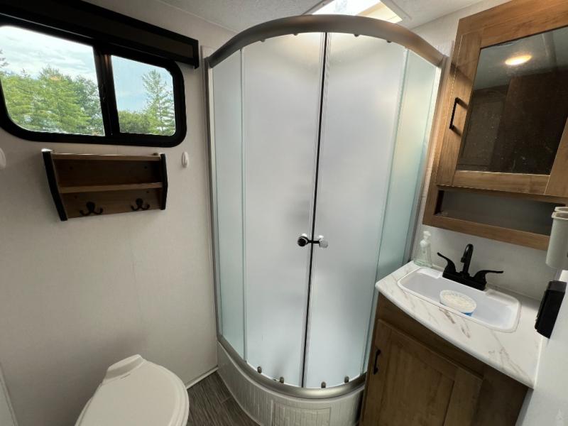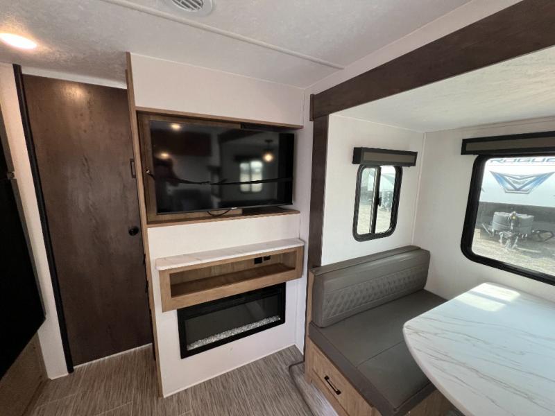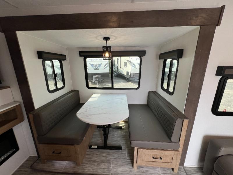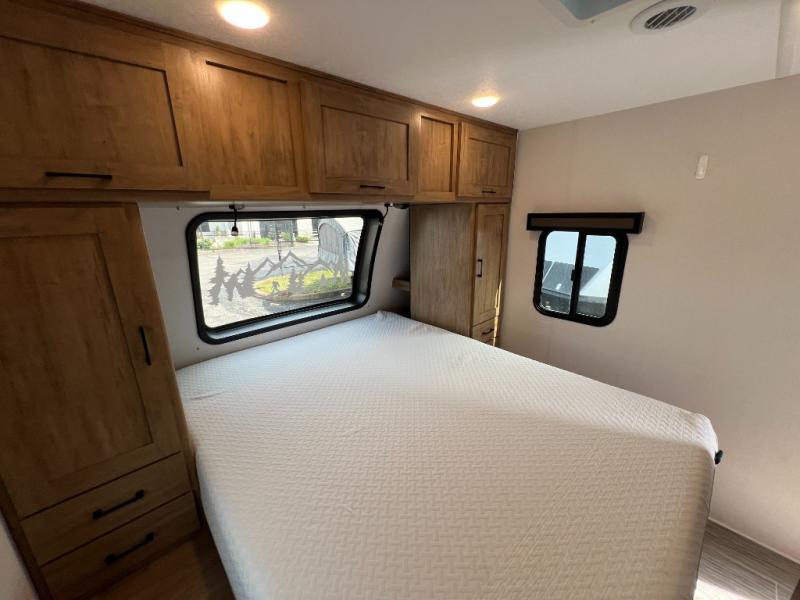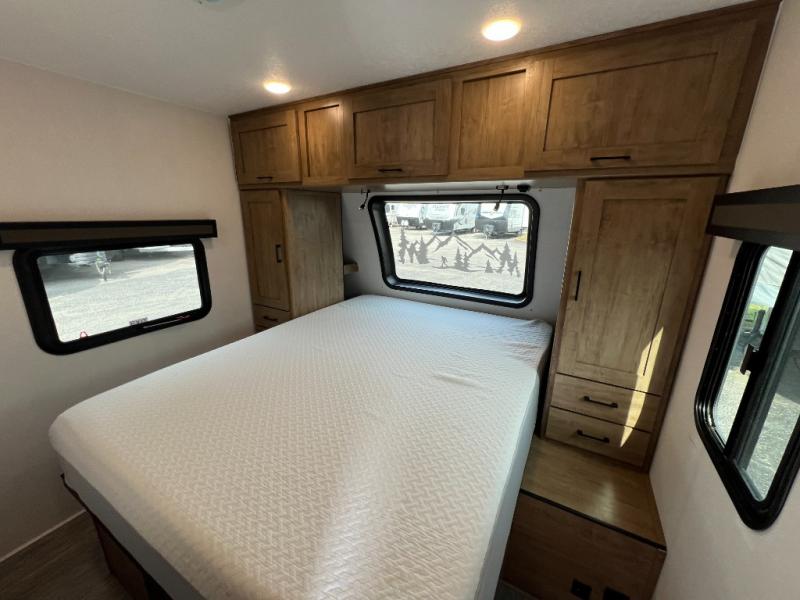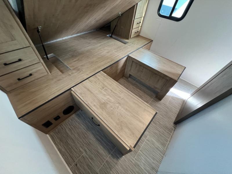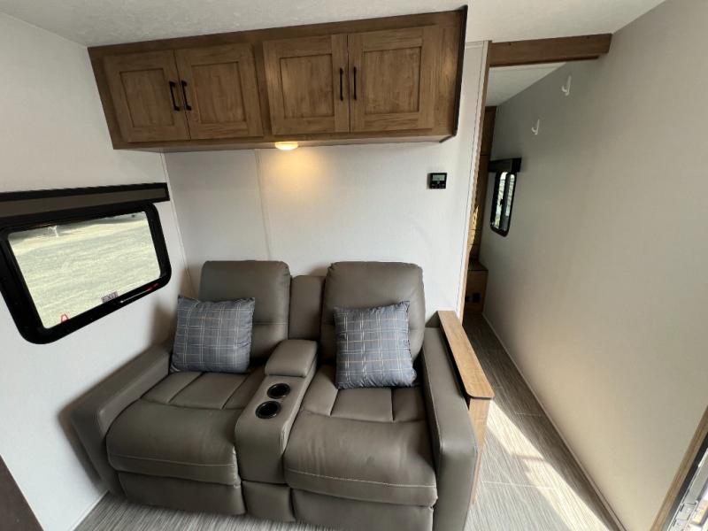 This travel trailer will feel just like home with its private bedroom and spacious full rear bath. You will appreciate the vaulted under-bed storage for extra blankets, shoes, and luggage, plus there are dual wardrobes on either side of the bed for your book and glasses. Get comfortable in the main living area on the sofa or at the booth dinette, or you can choose the optional theater seat or optional hide-a-bed sofa in place of the standard sofa. The chef of your group can prepare meals indoors or outdoors on the full camp kitchen, and check out the large 20' power awning with LED lights that will provide protection from the elements.
